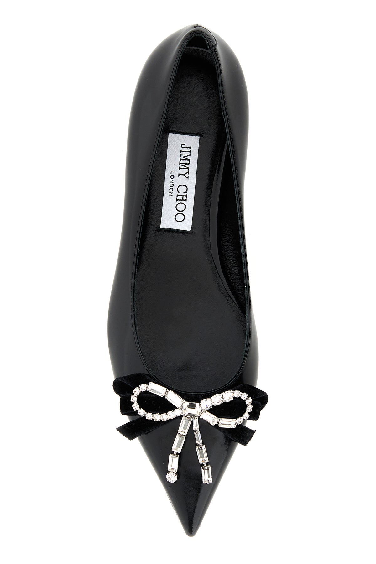 Ballerinas realized in polished-finish leather enriched by decorative bows in velvet and rhinestones at the front.