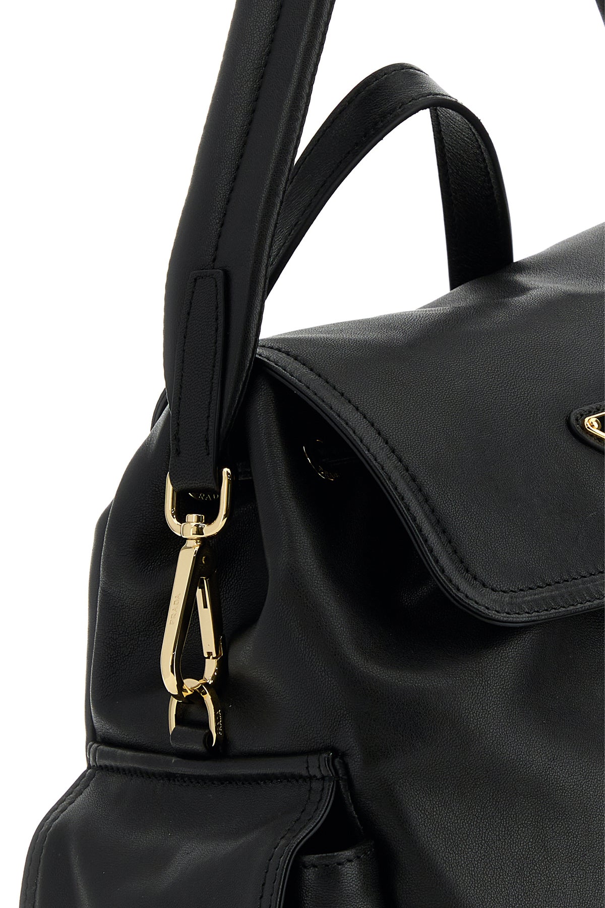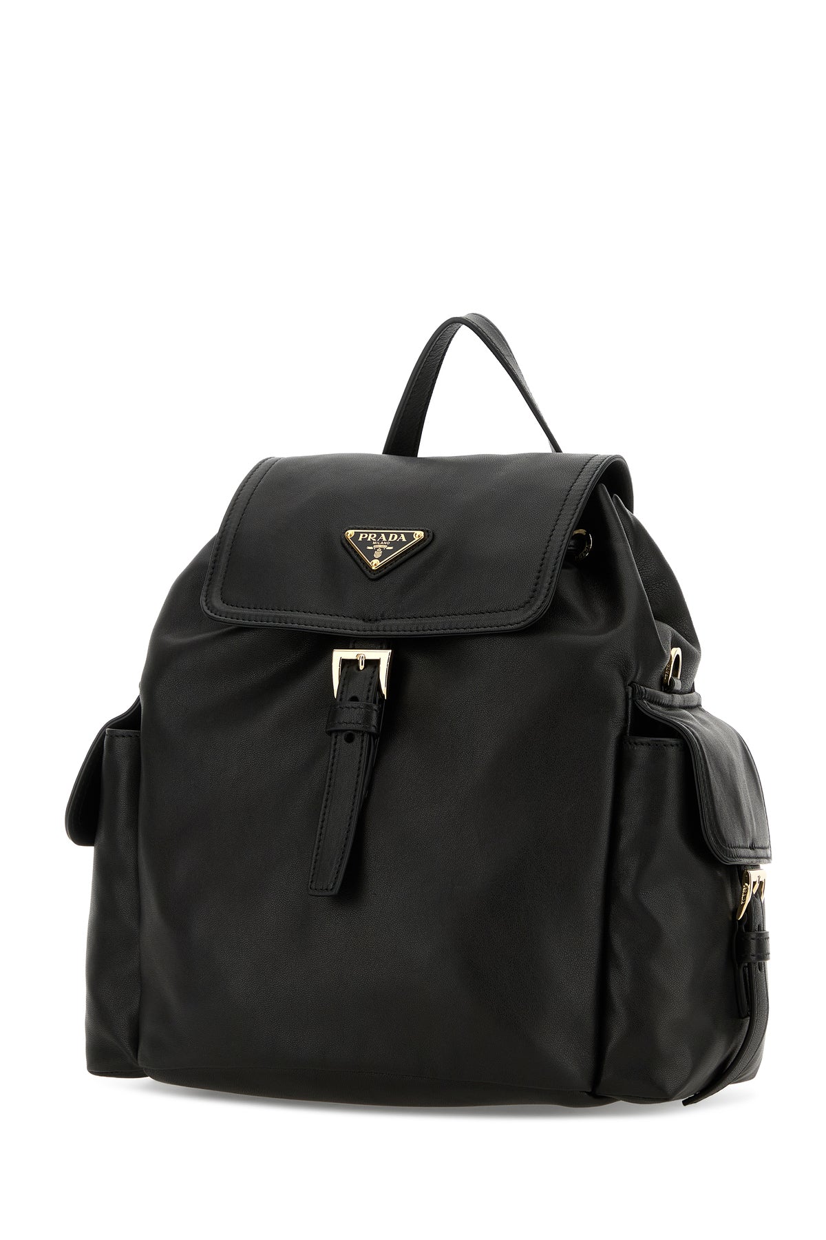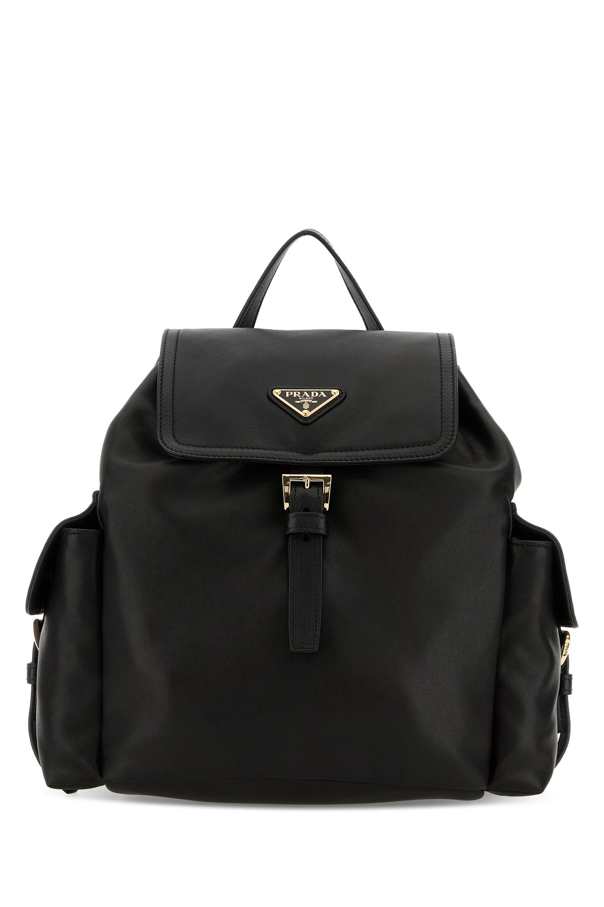 Backpack realized in nappa leather enriched by iconic logoed metal triangle at the front.