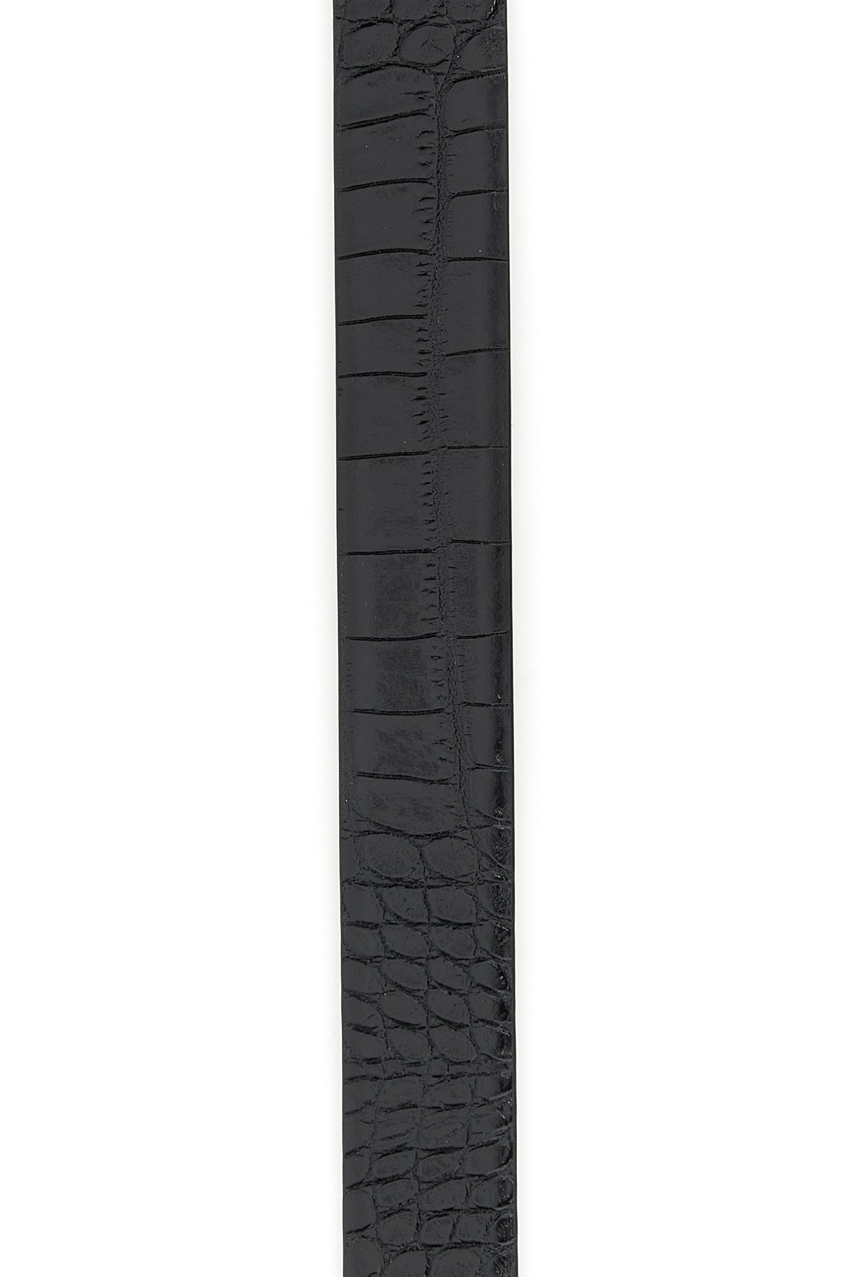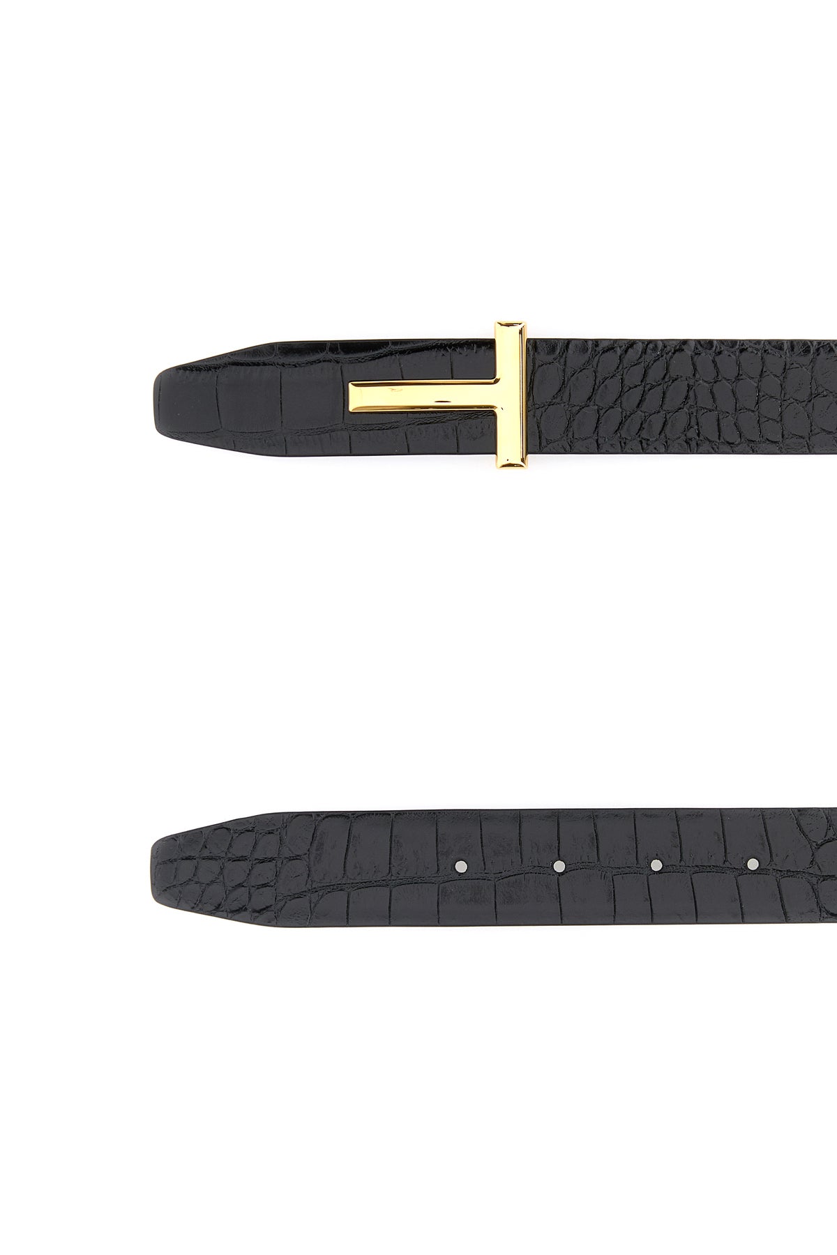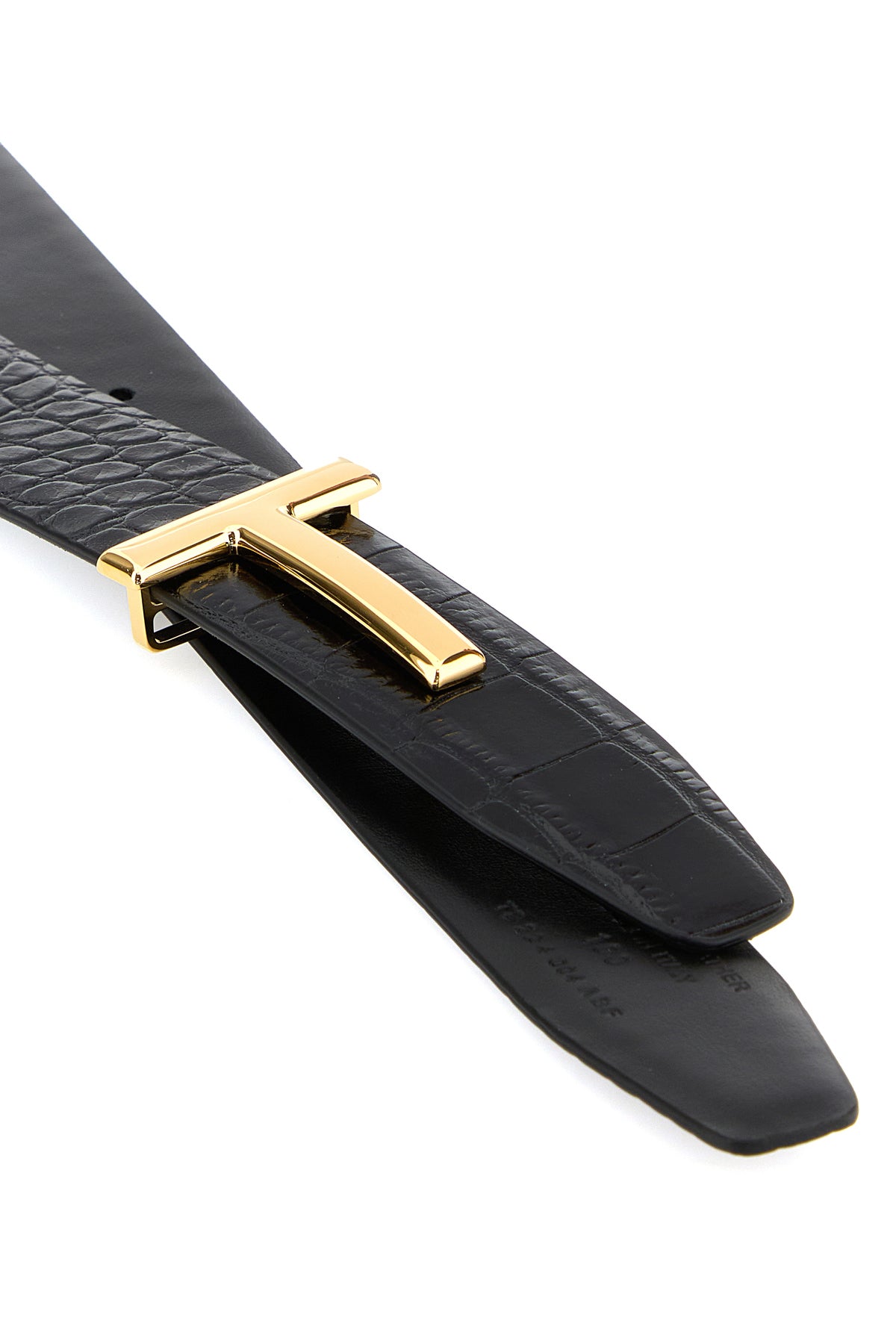 Belt realized in crocodile-motif embossed calf leather enriched by metal T buckle.
