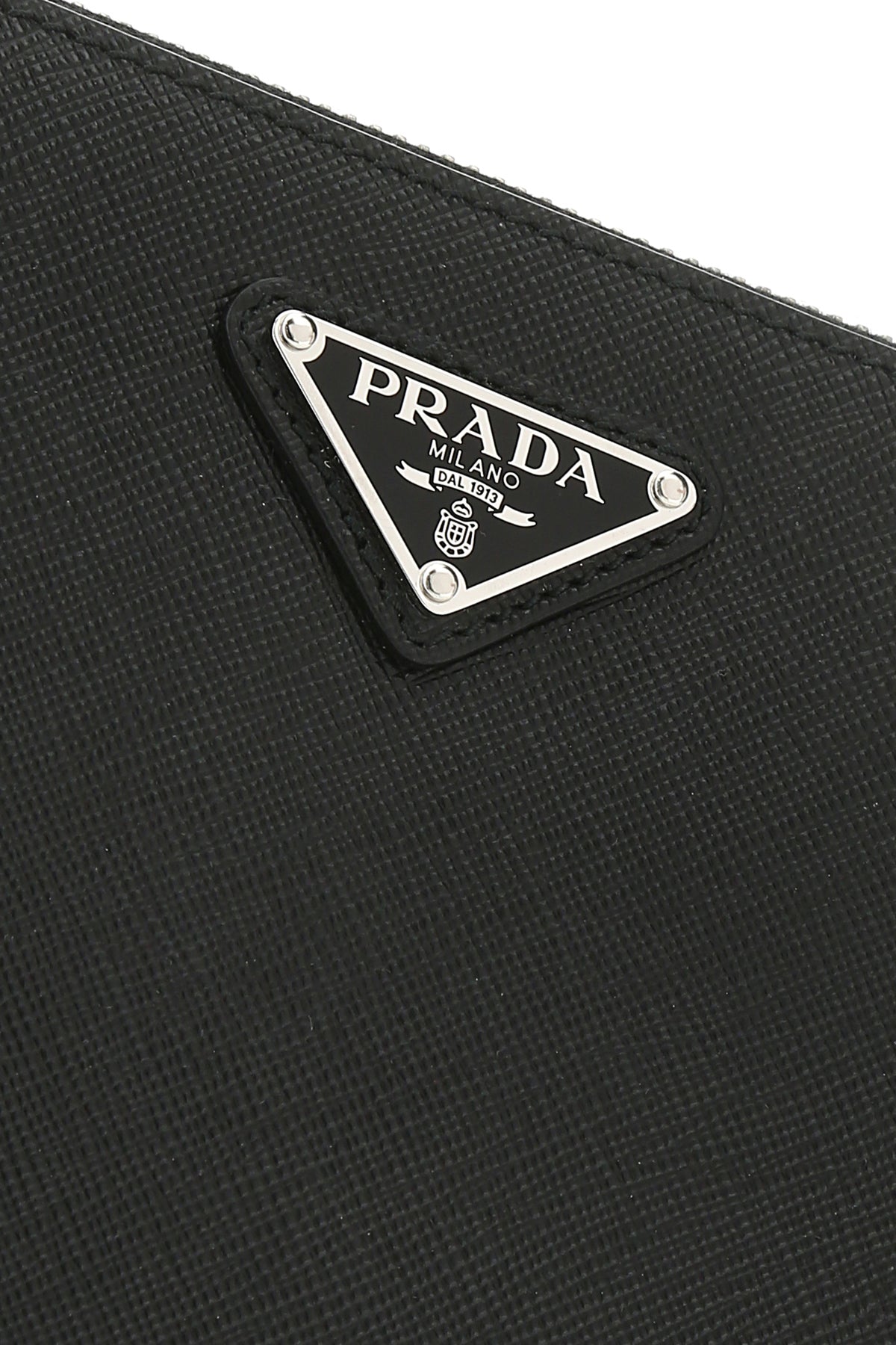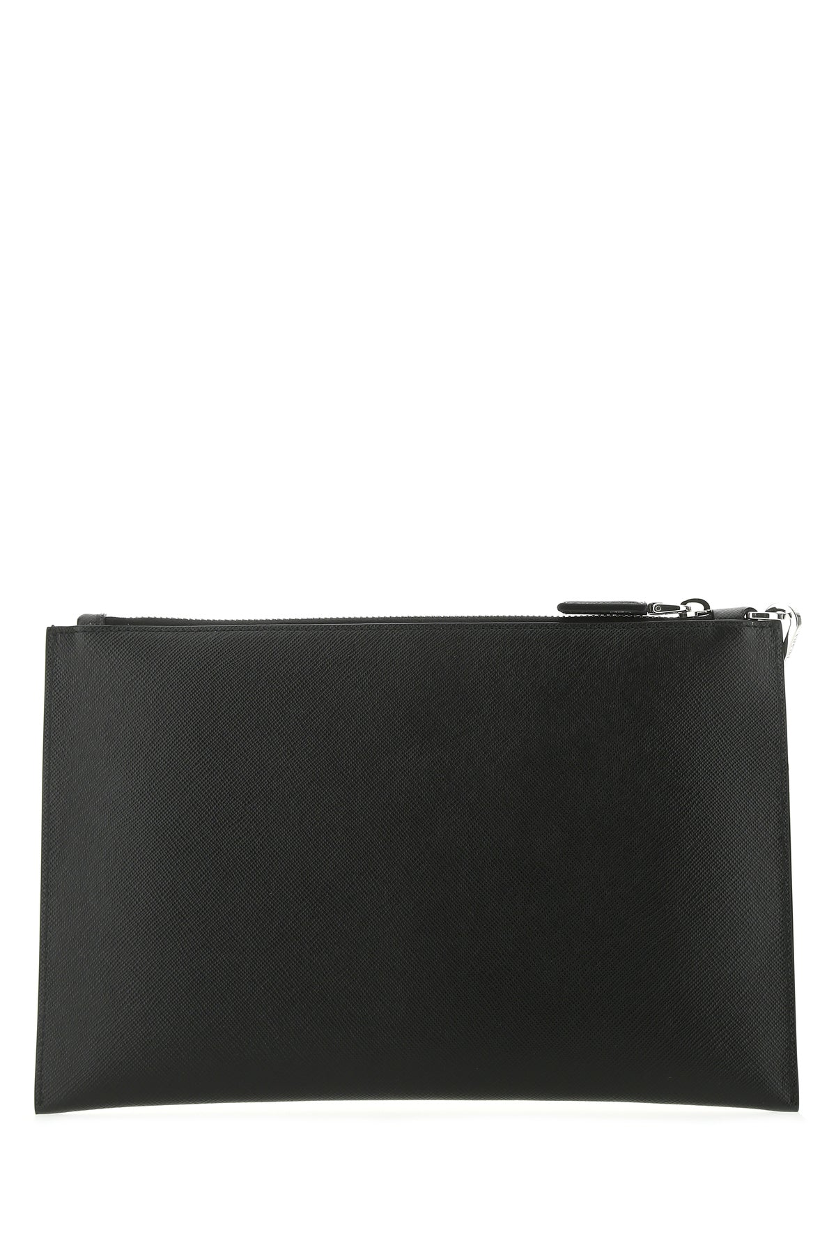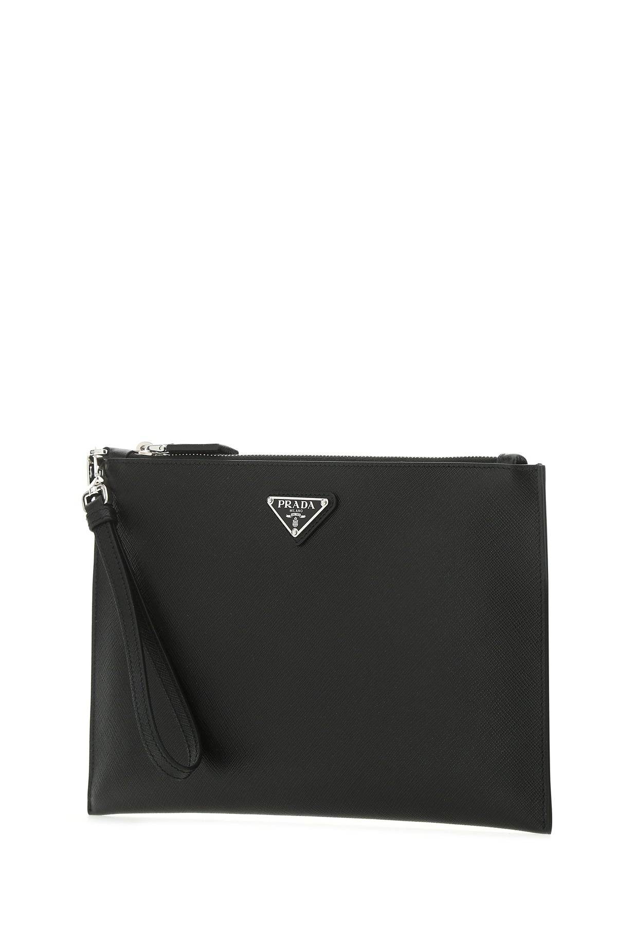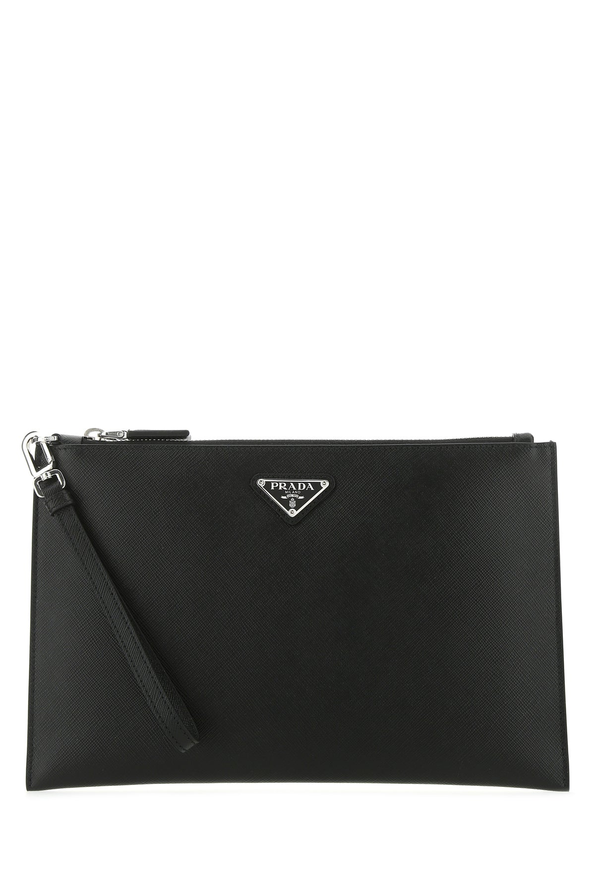 Clutch realized in Saffiano leather enriched by iconic logoed metal triangle at the front.