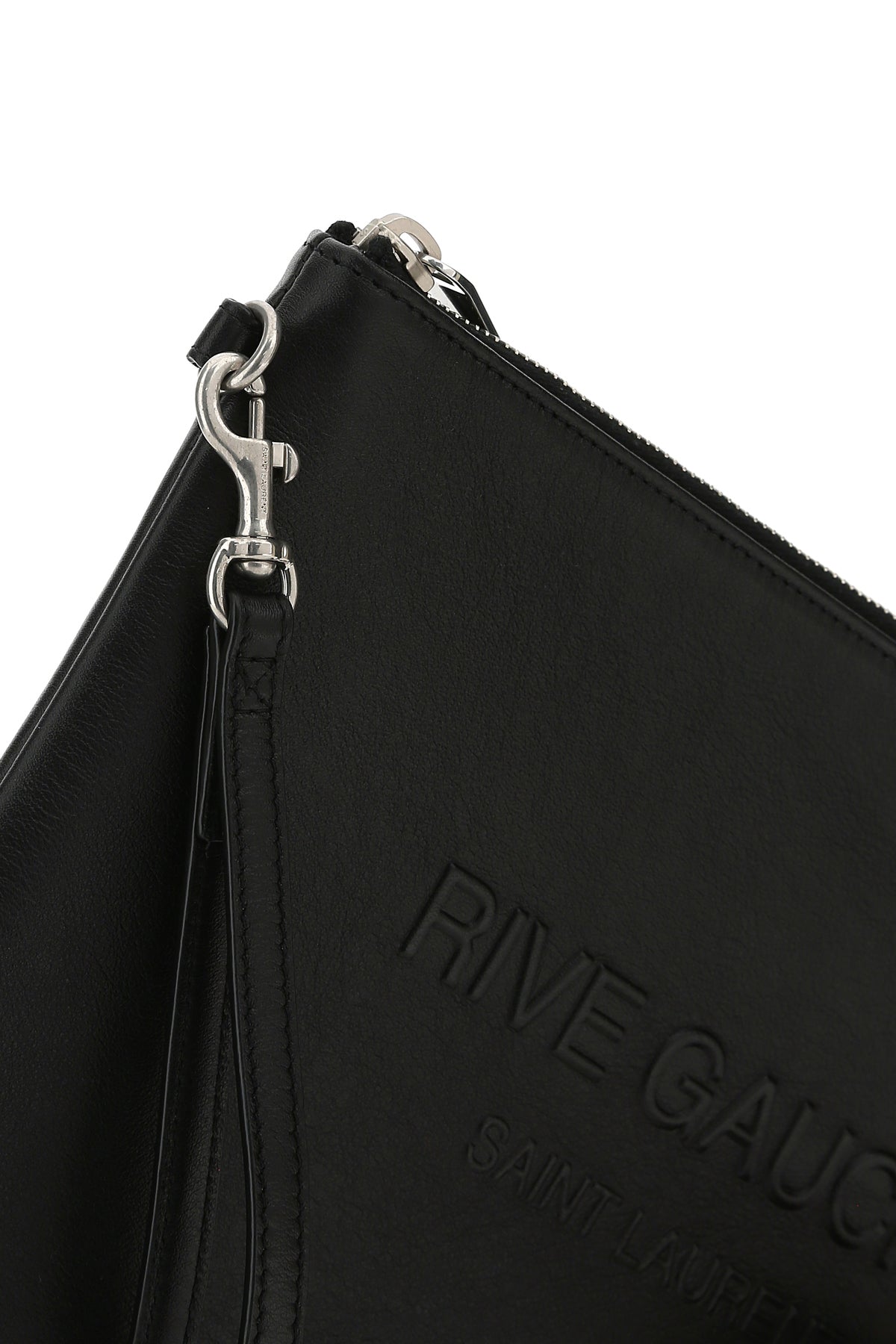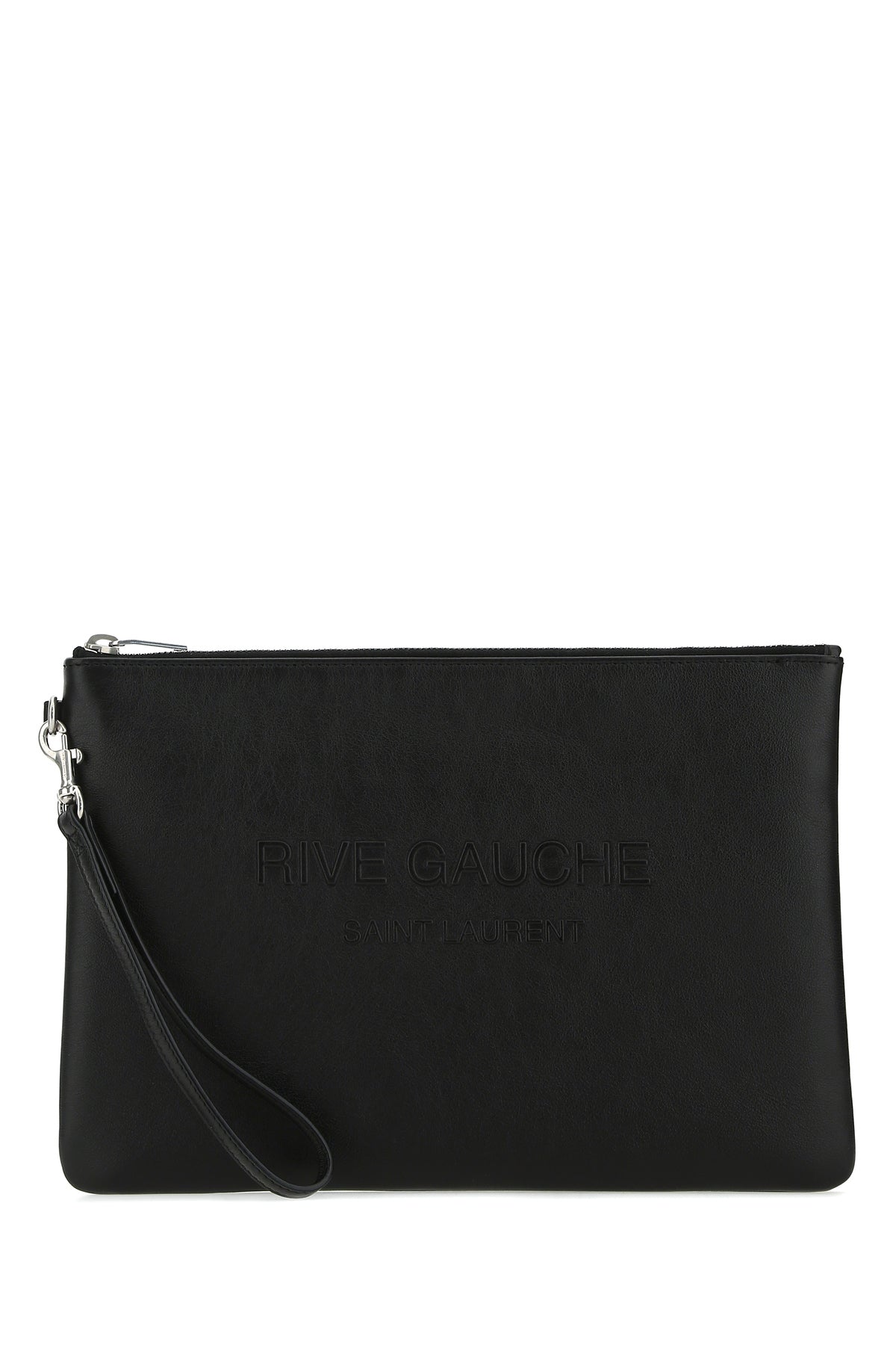 Clutch realized in smooth calf leather characterized by logoed Rive Gauche print in relief at the front.