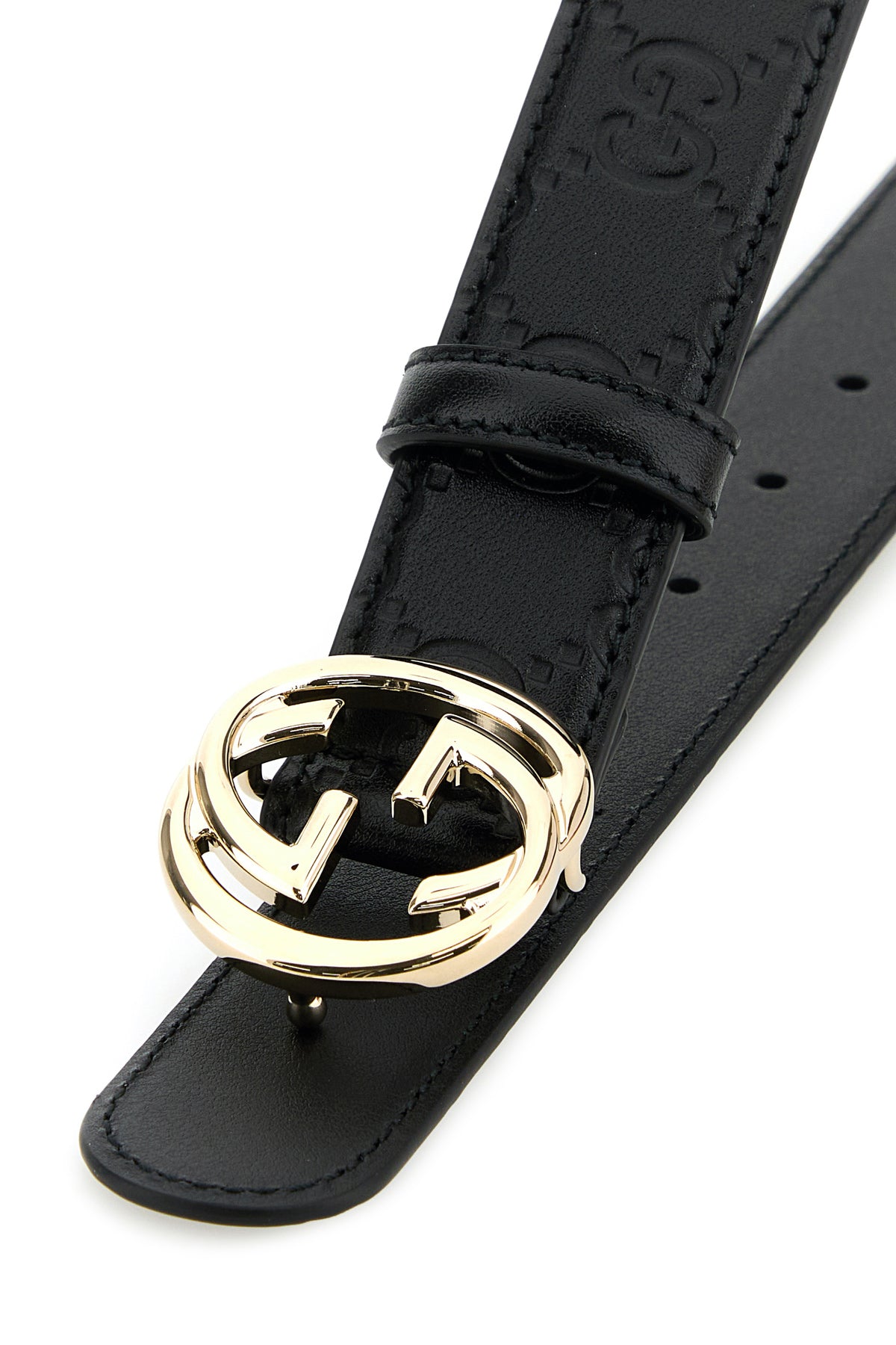 Belt realized in polished-finish leather characterized by embossed GG motif on the en tire surface enriched by metal Incrocio GG buckle.