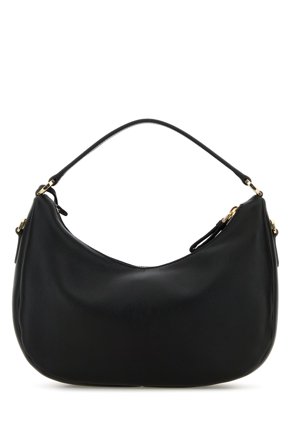 Handbag realized in pebble leather enriched by logoed metal plate at the front.