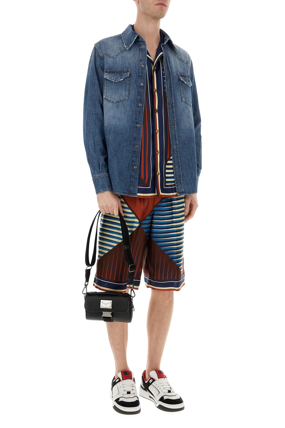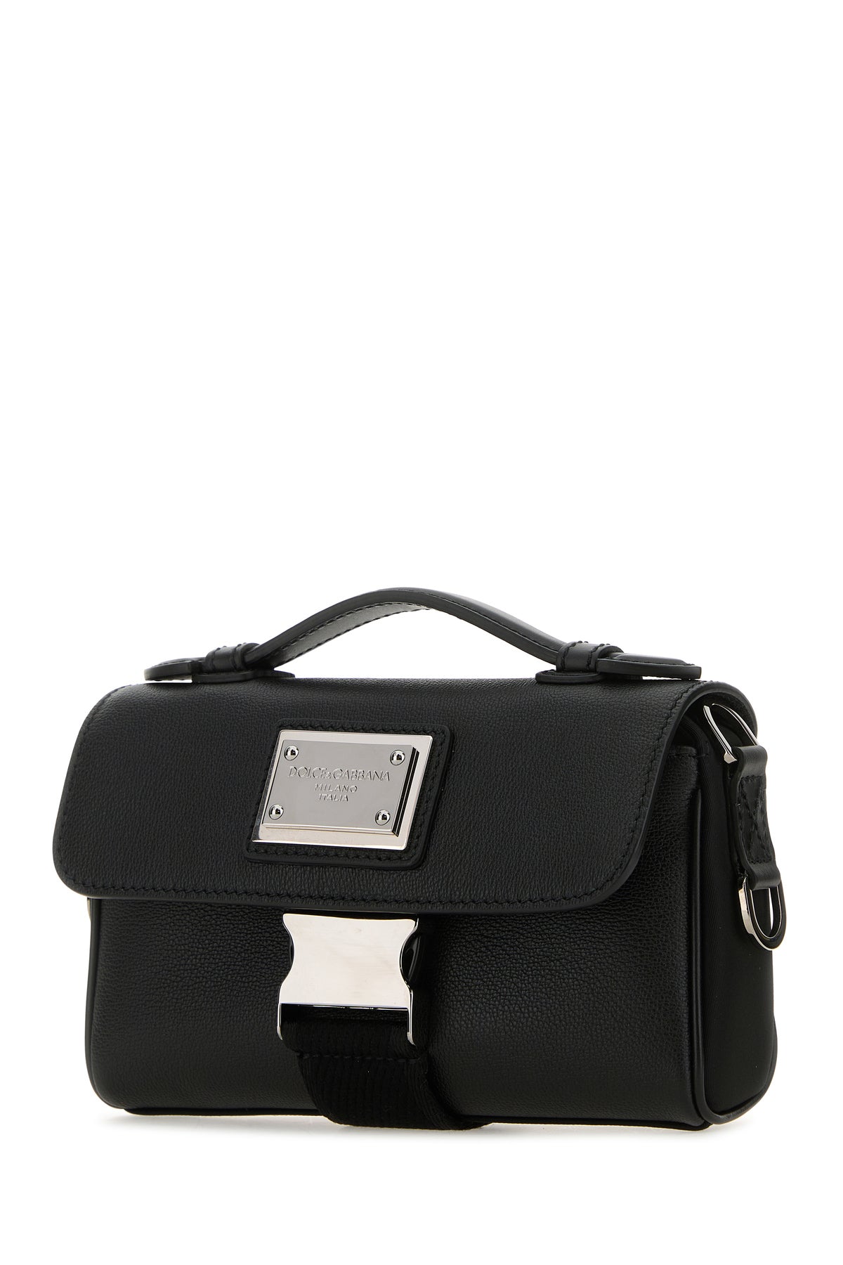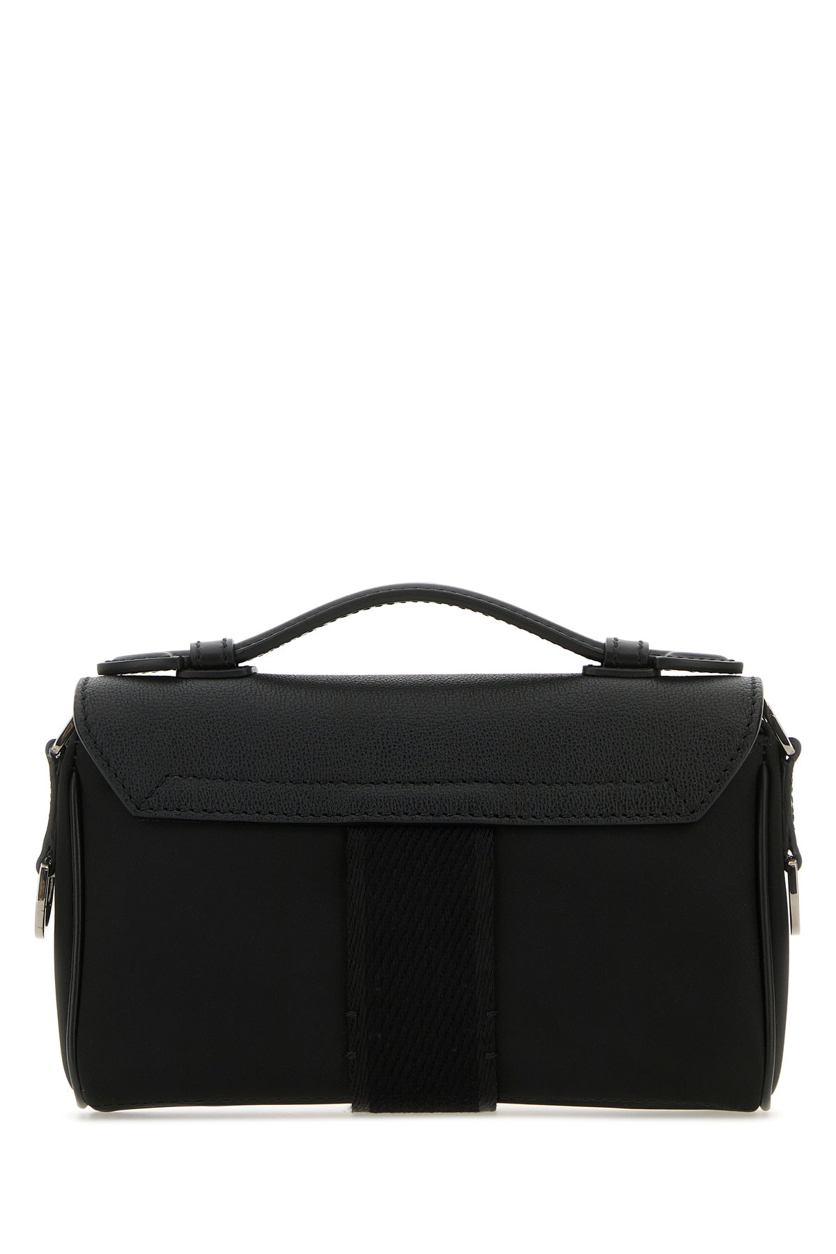 Handbag realized in pebble leather with fabric inserts enriched by logoed metal plate at the front.