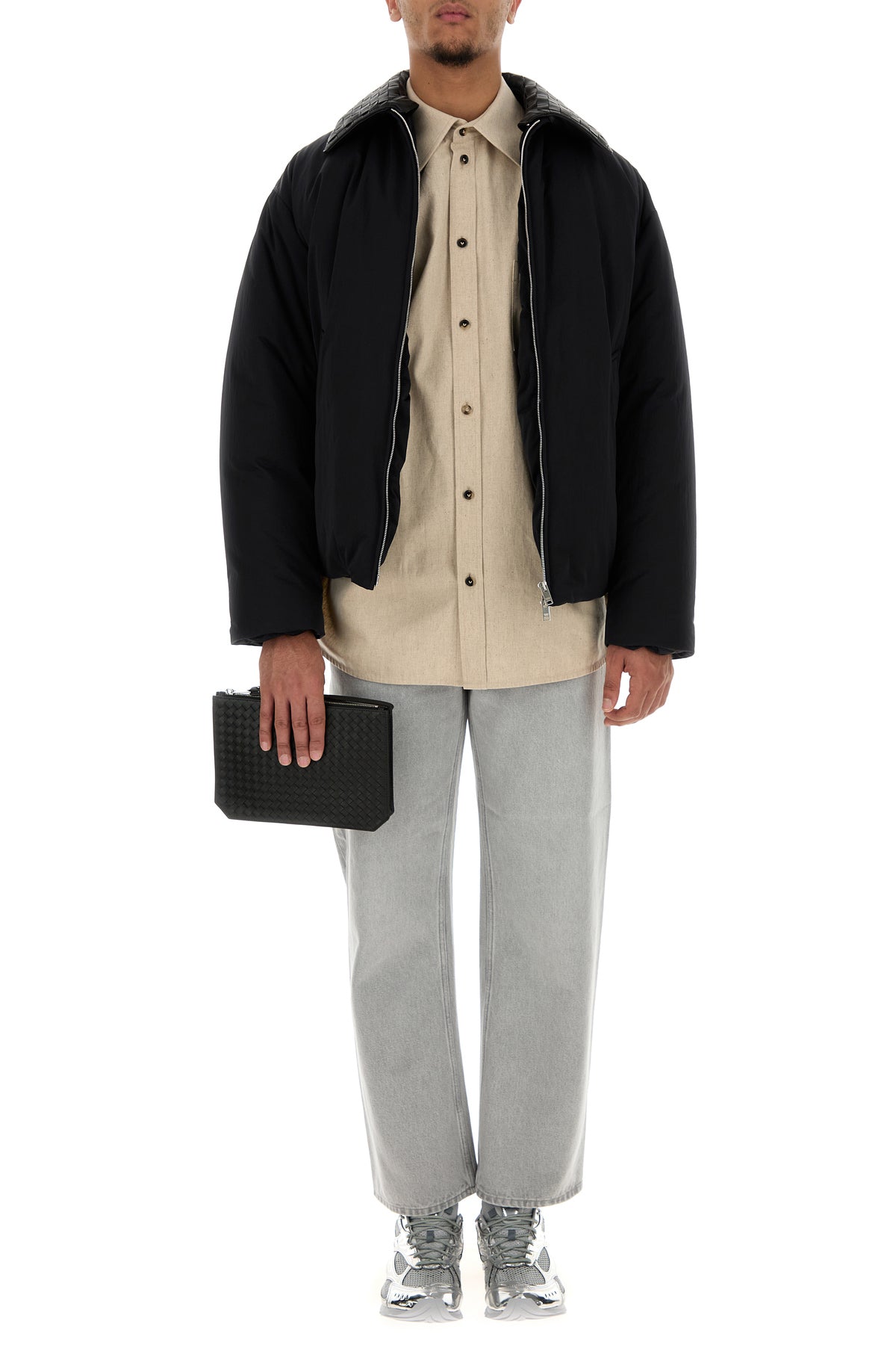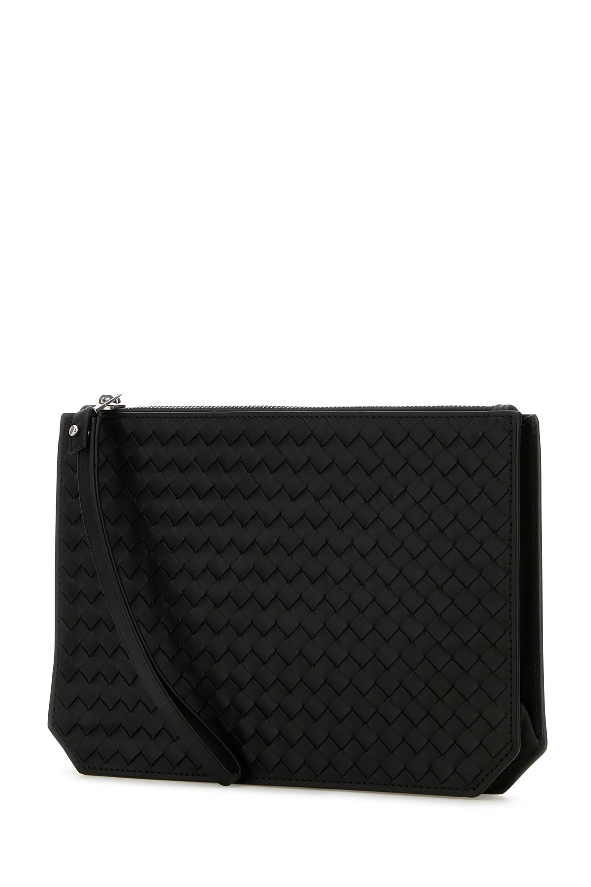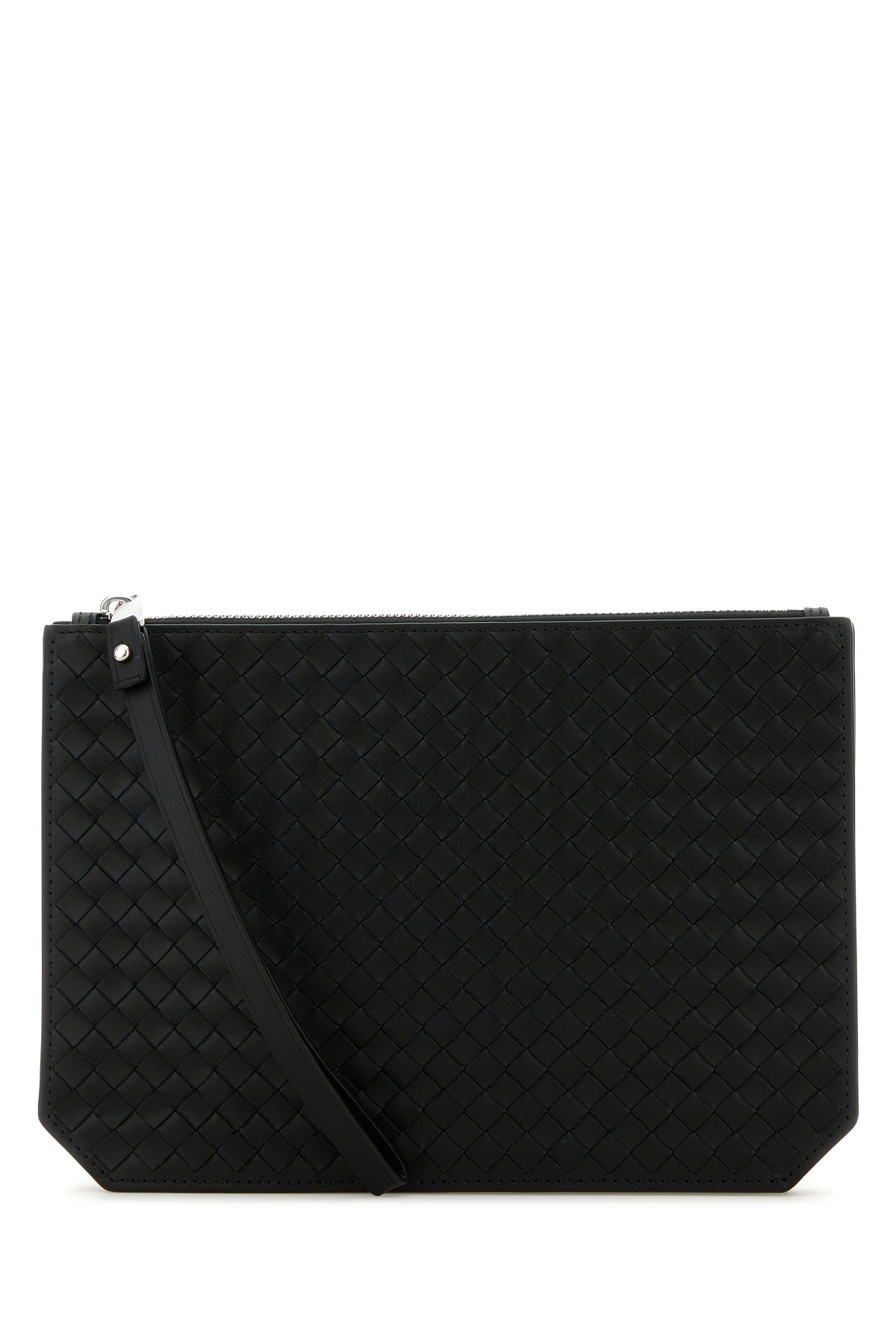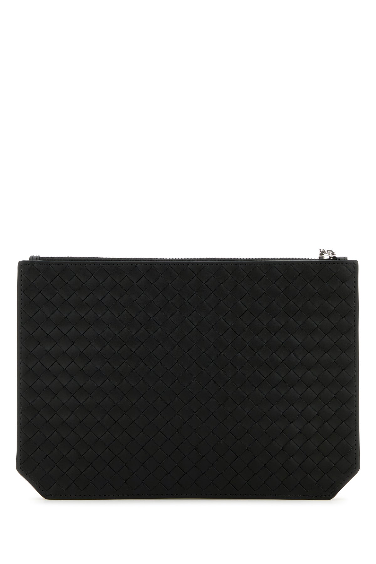 Clutch realized in calf leather characterized by iconic Intrecciato motif on the entire surface.
