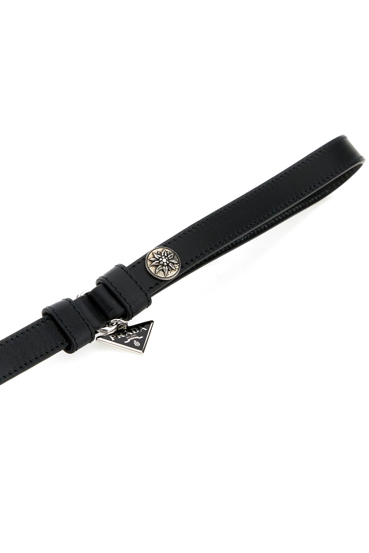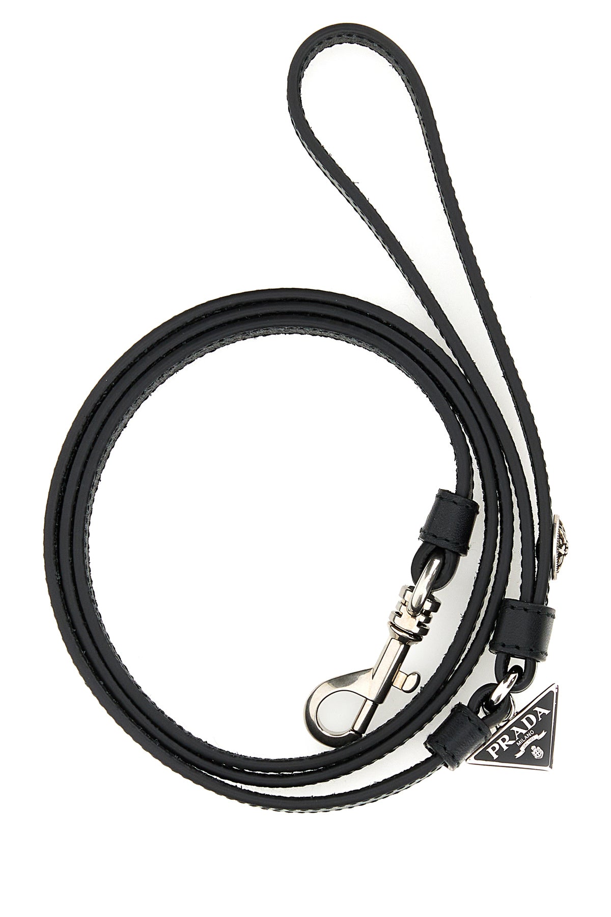 Leash realized in smooth leather enriched by metal iconic logoed triangle charm.