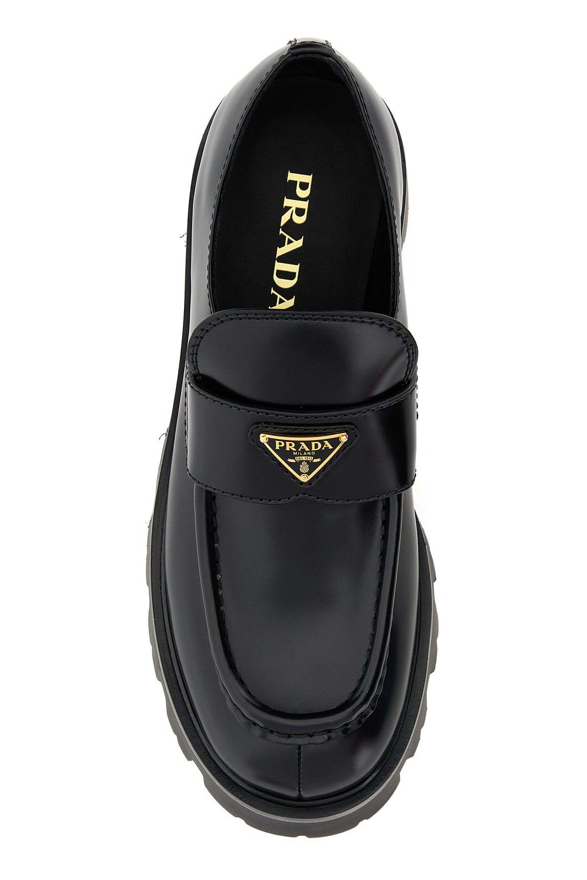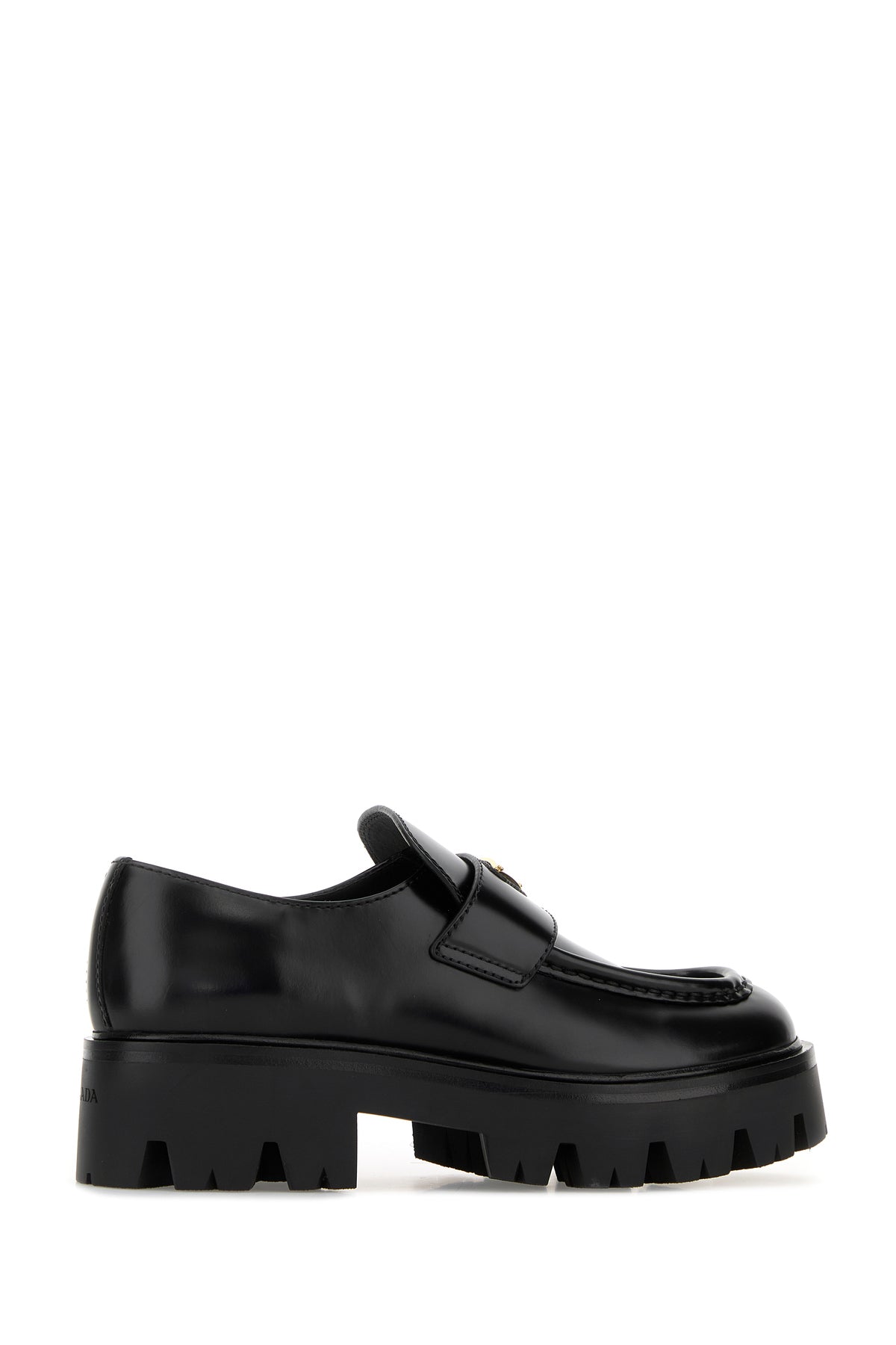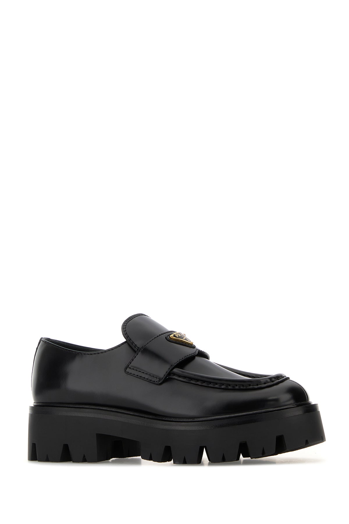 Loafers realized in polished finish smooth leather enriched by iconic logoed metal triangle on the vamp.