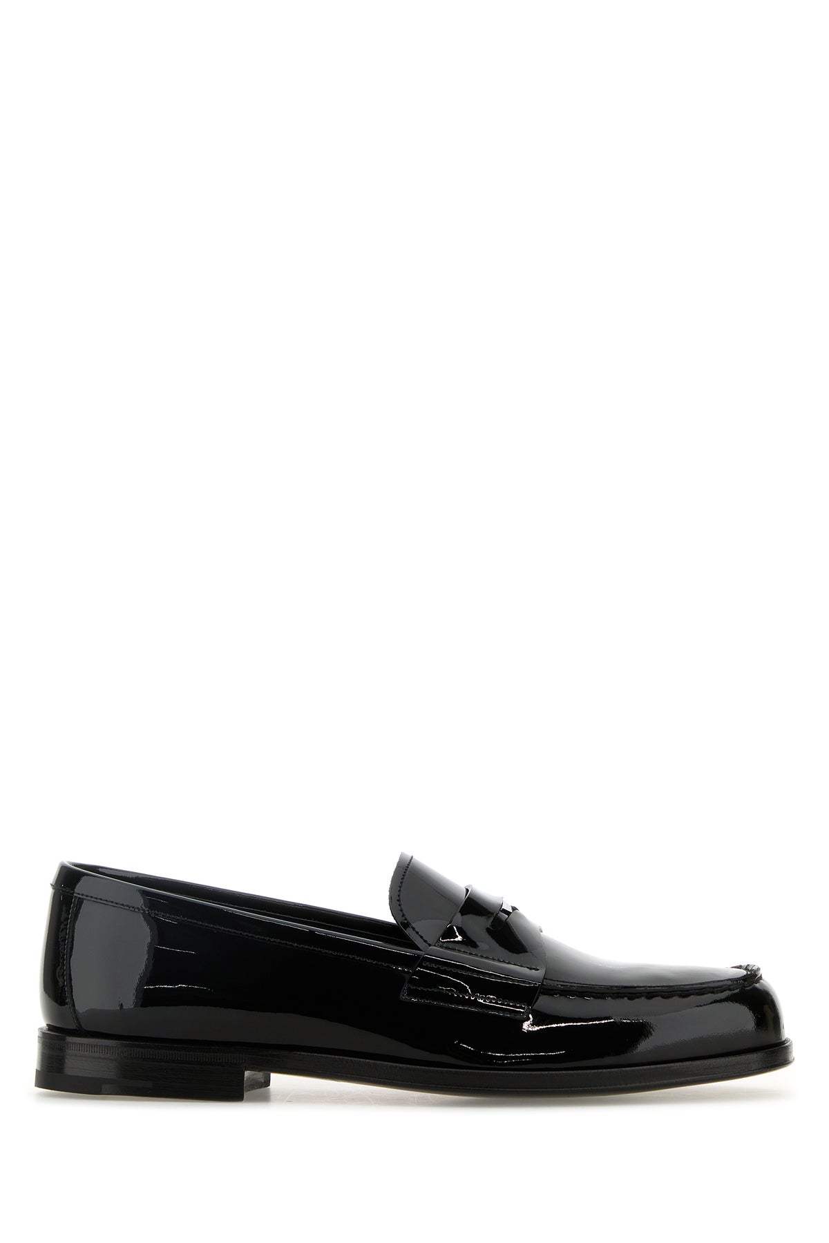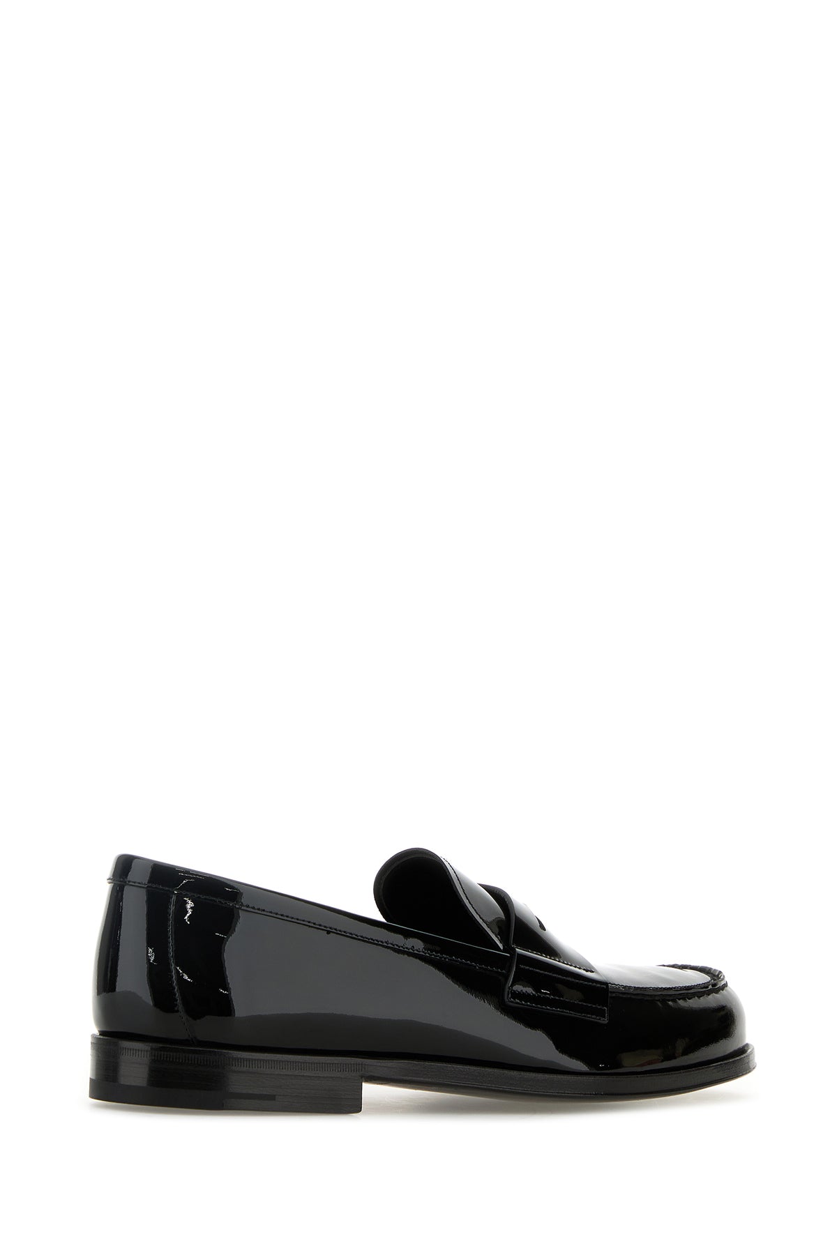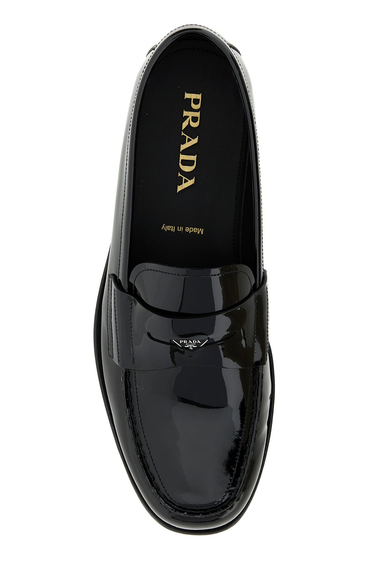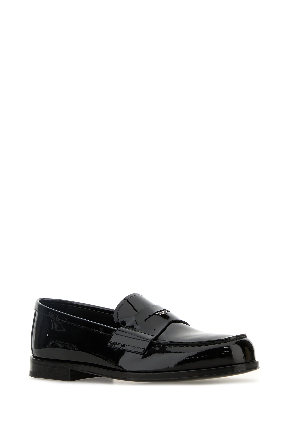 Loafers realized in patent leather enriched by iconic logged triangle on the vamp.