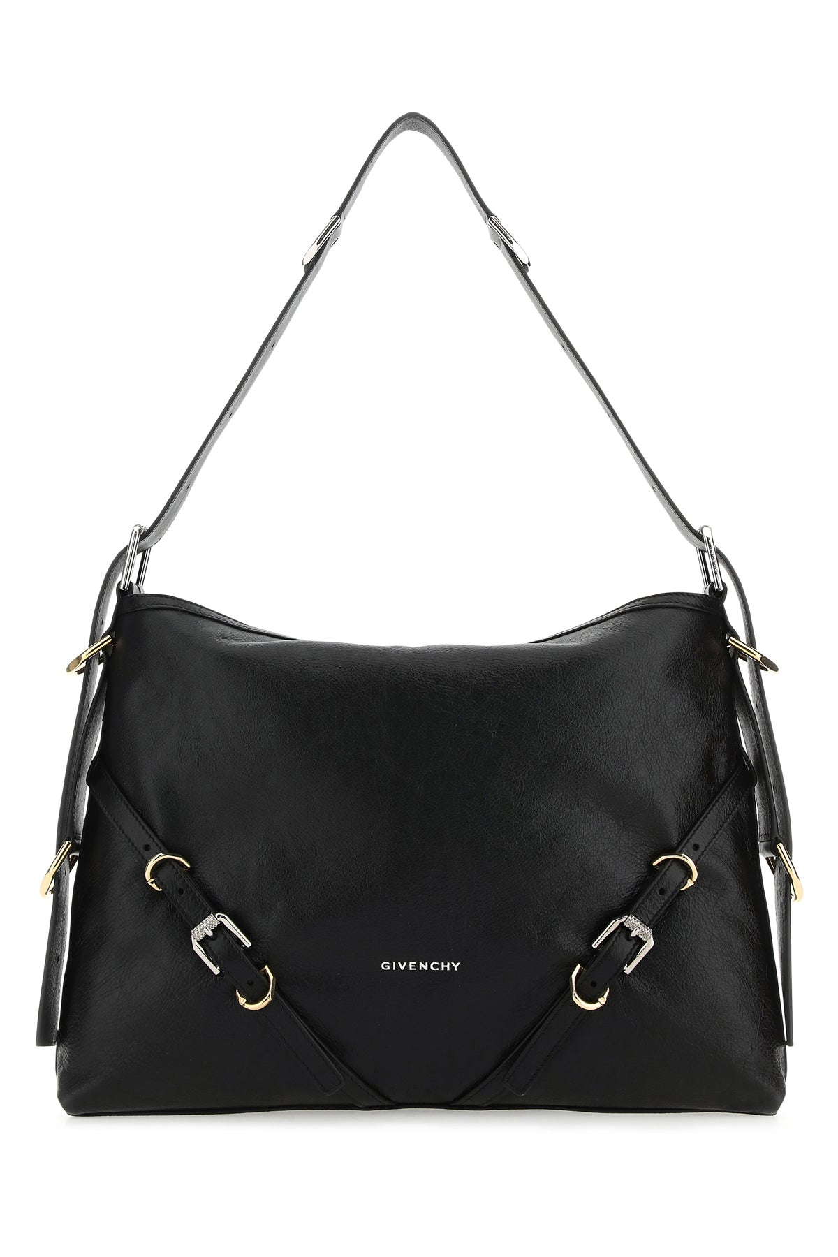 Shoulder bag realized in pebble calf leather characterized by printed logo at the front enriched by decorative straps at the front.