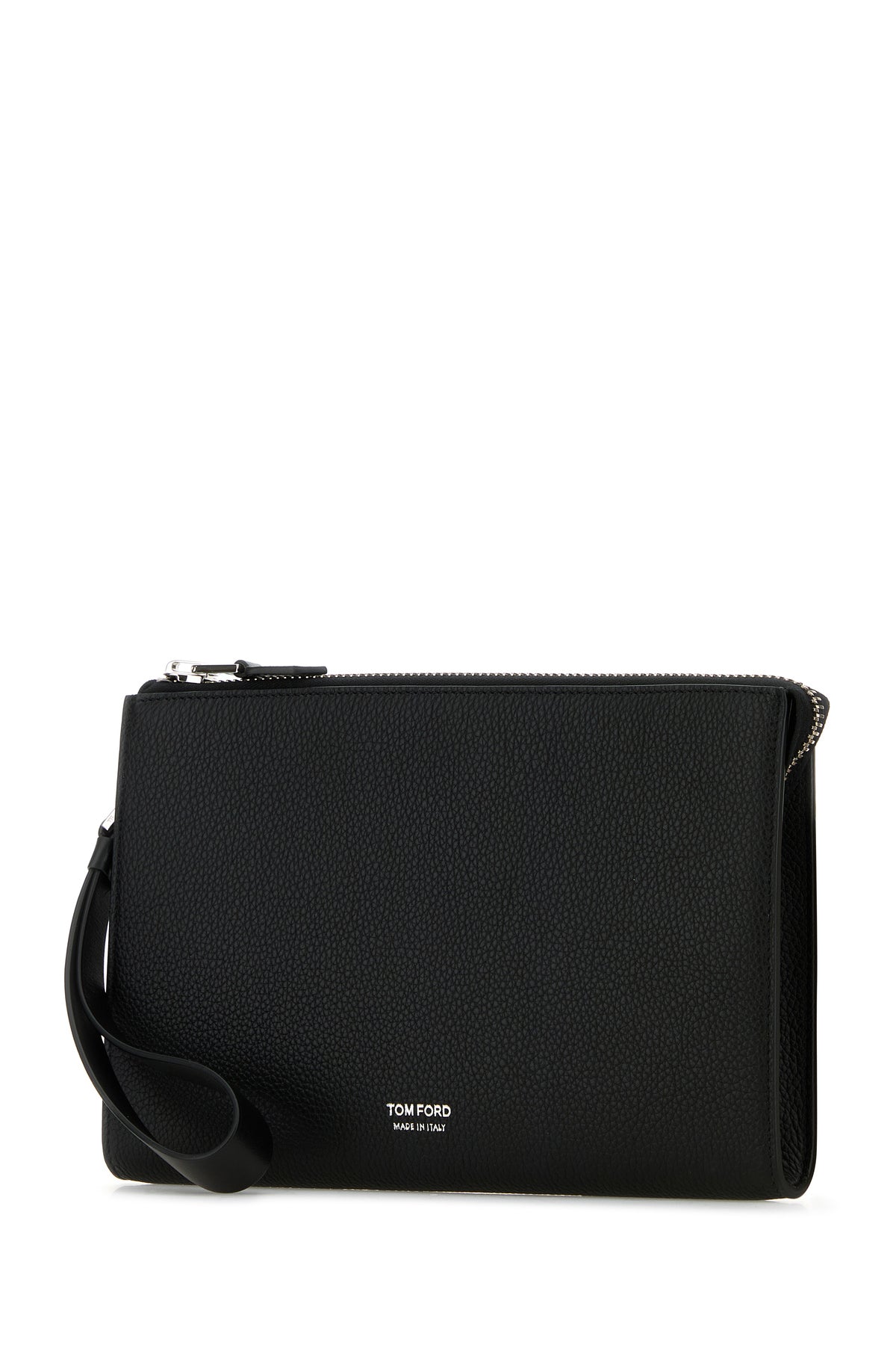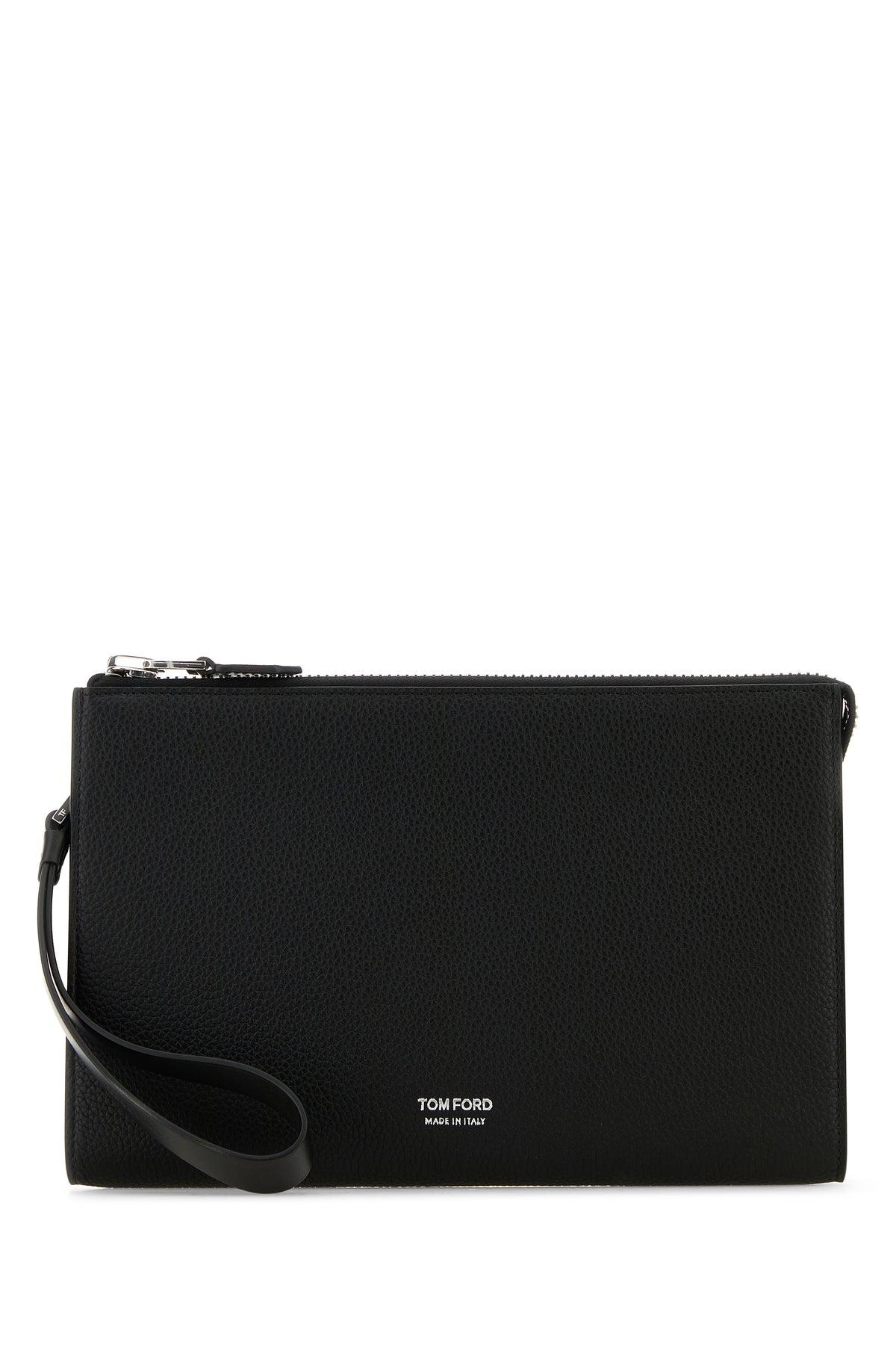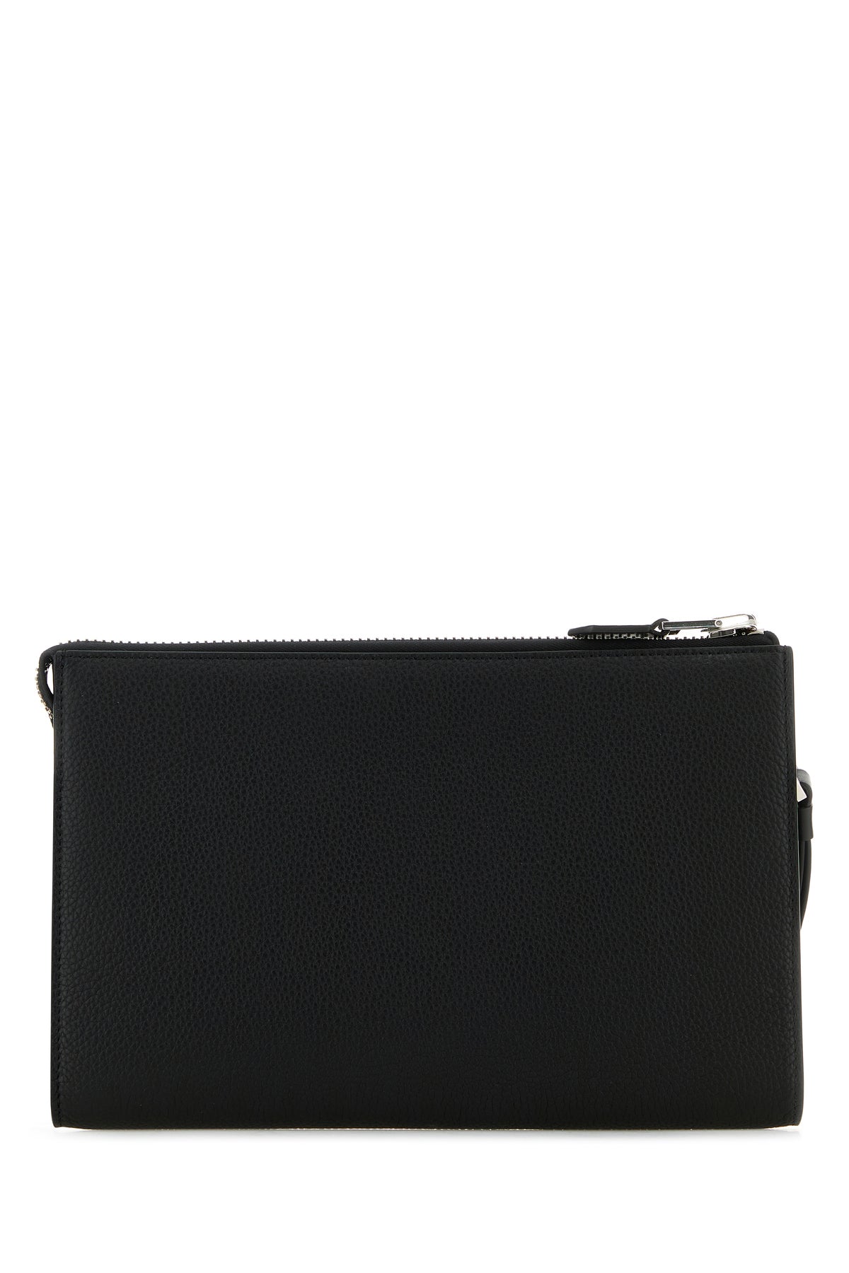 Clutch realized in pebble calf leather characterized by laminated printed logo at the front.