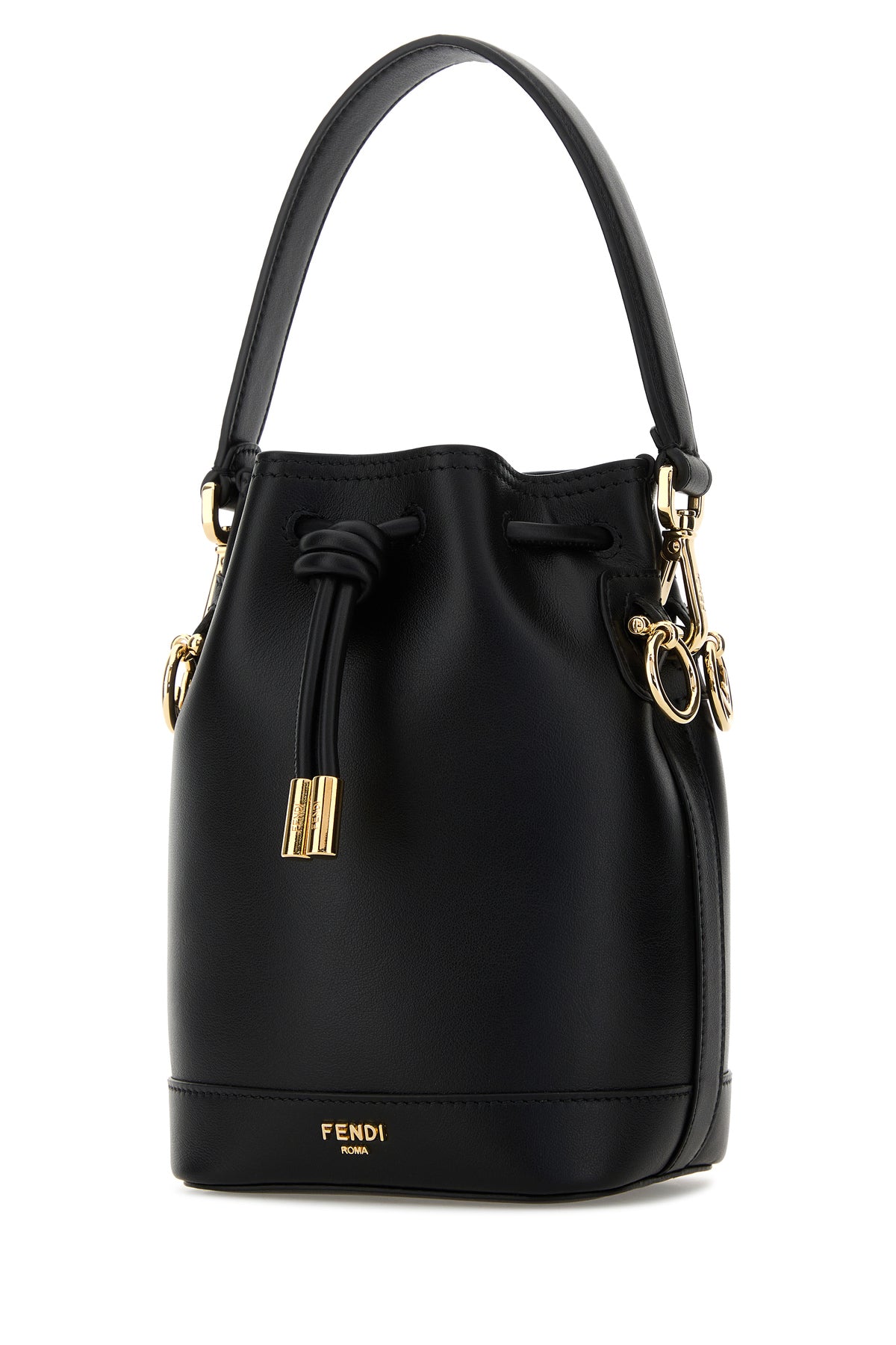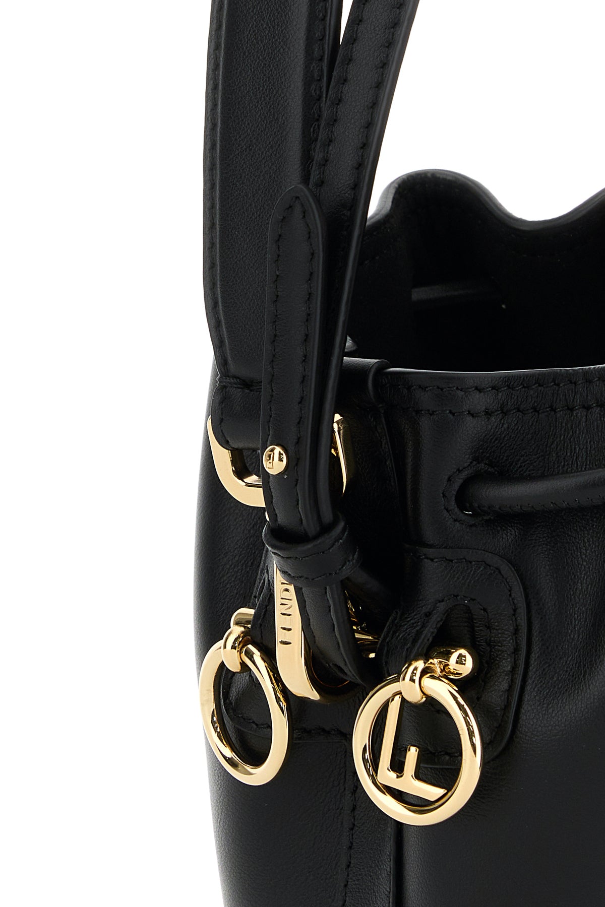 Bucket bag realized in smooth leather enriched by metal lettering logo at the front.