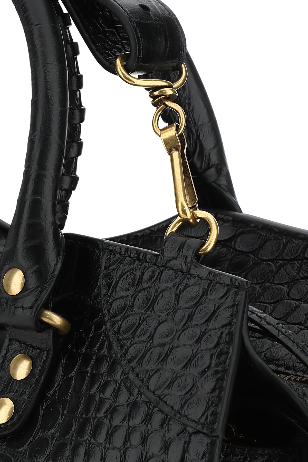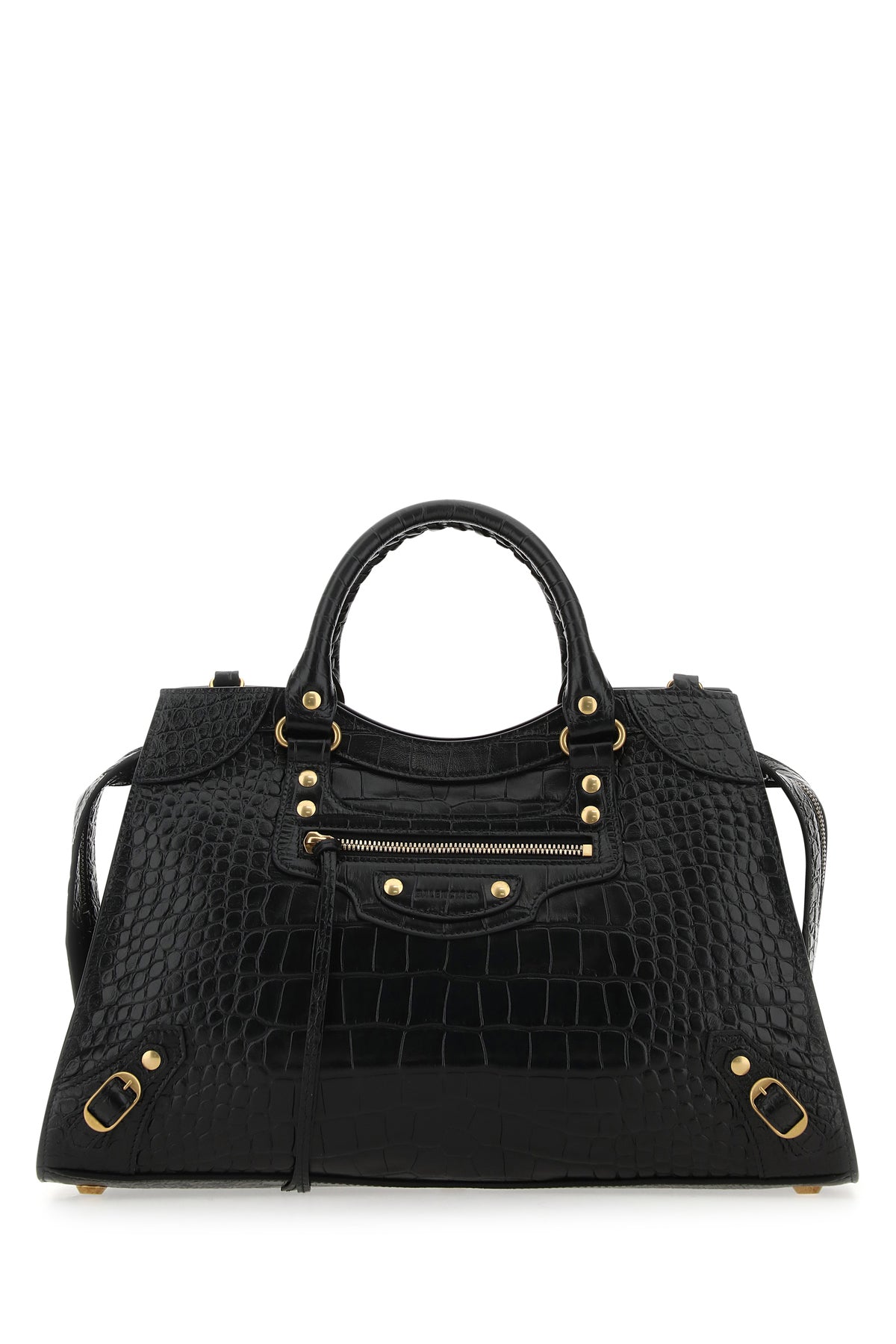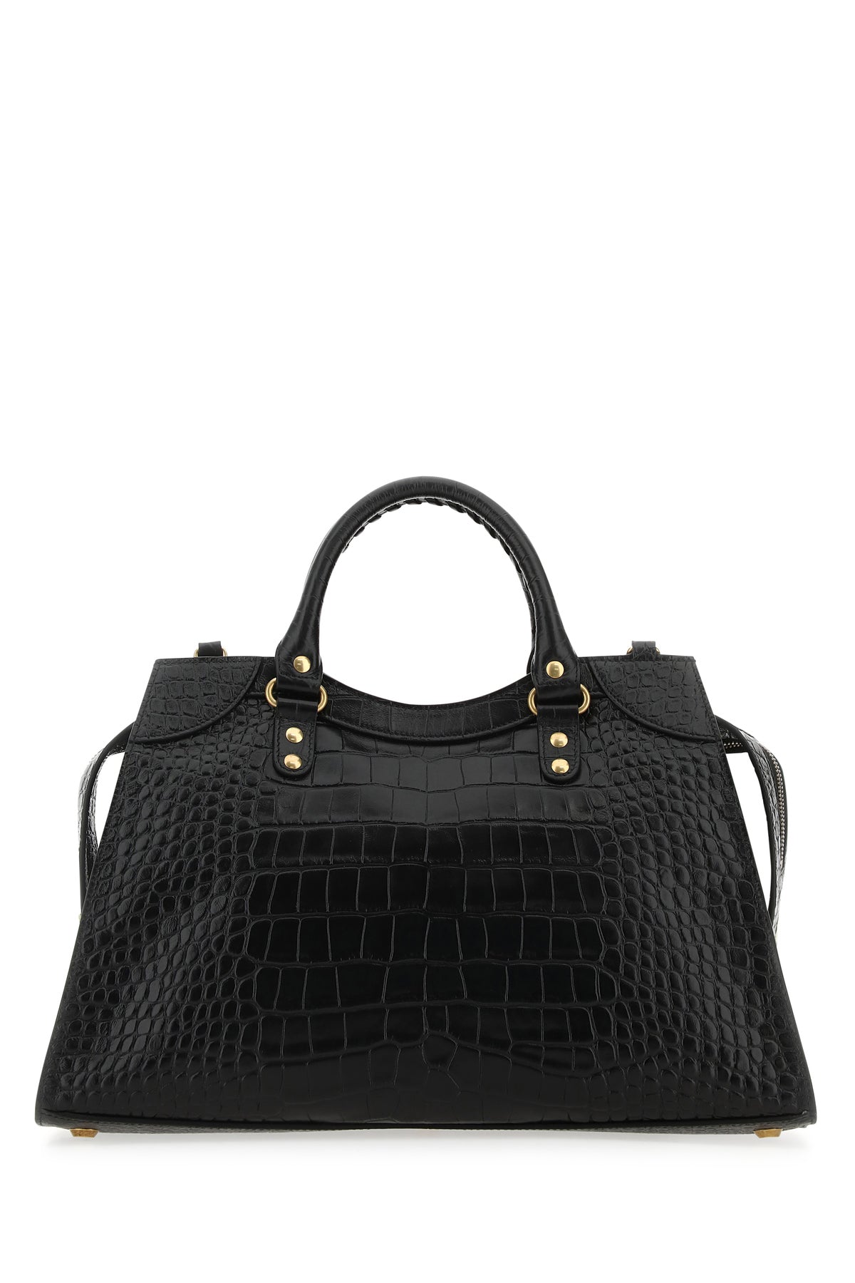 Handbag realized in crocodile motif embossed calf leather characterized by embossed logo at the front enriched by decorative metal studs on the entire surface.