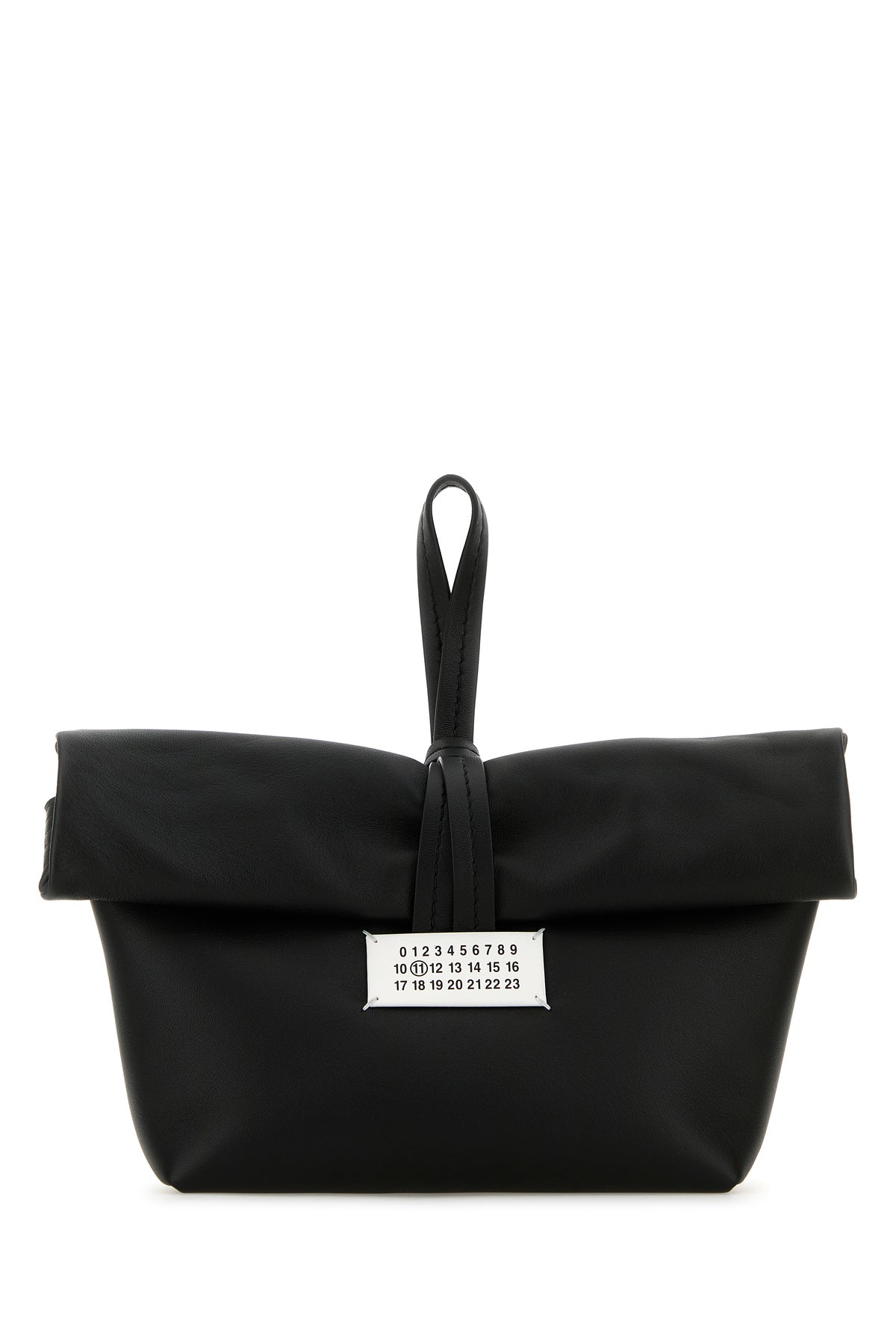 Clutch realized in smooth ovine leather enriched by contrasting logoed label at the front.