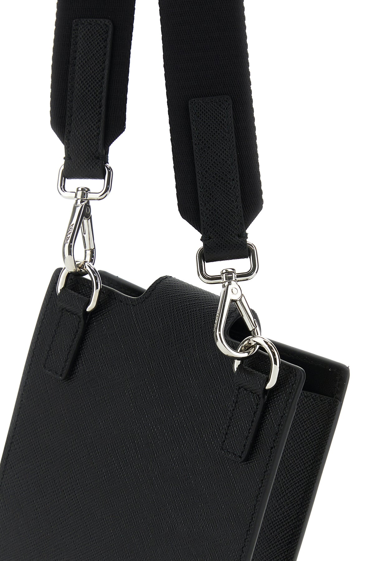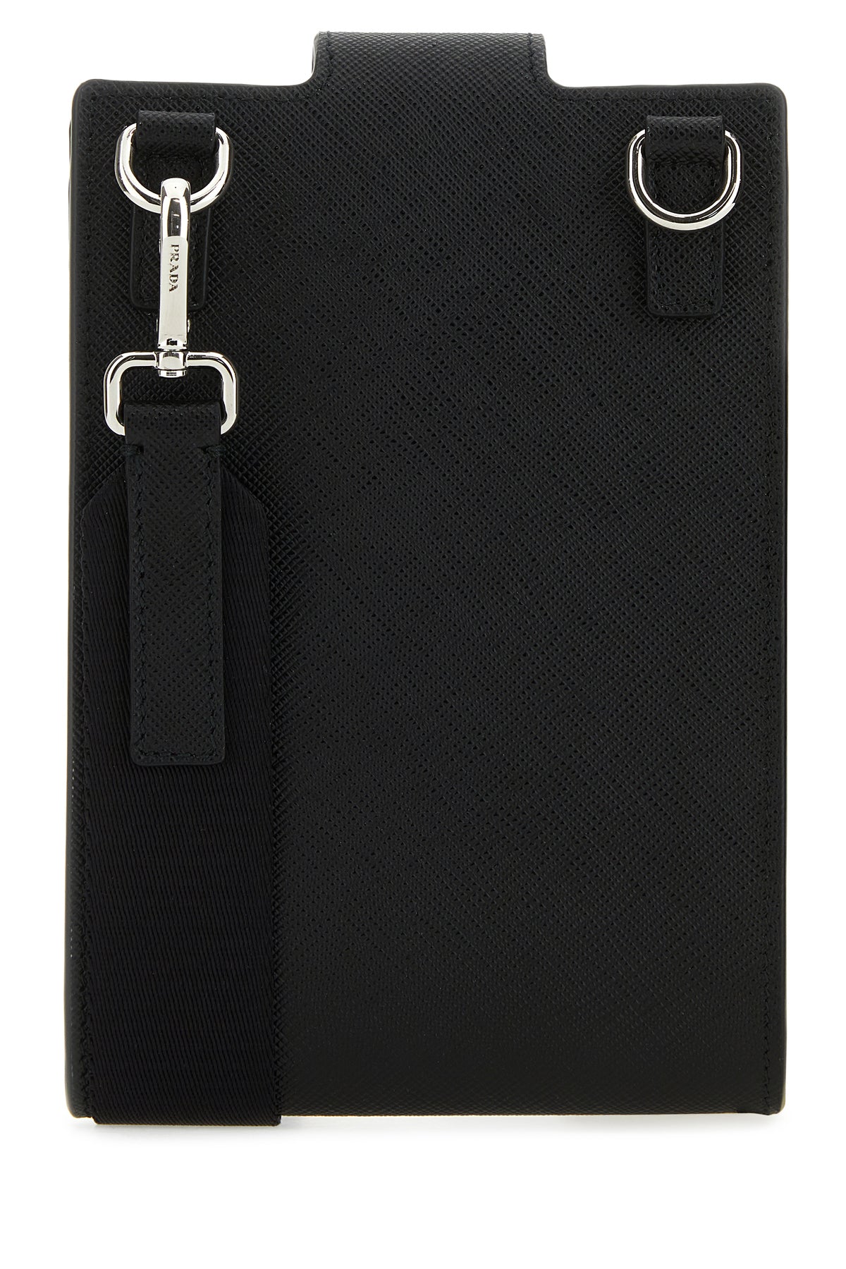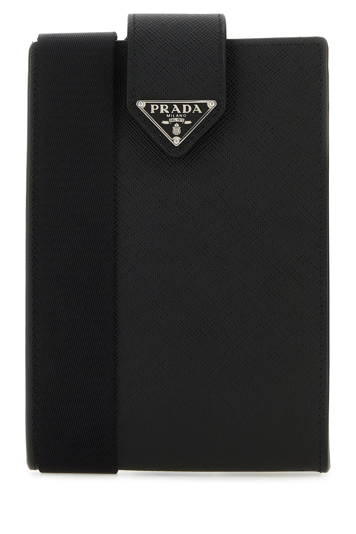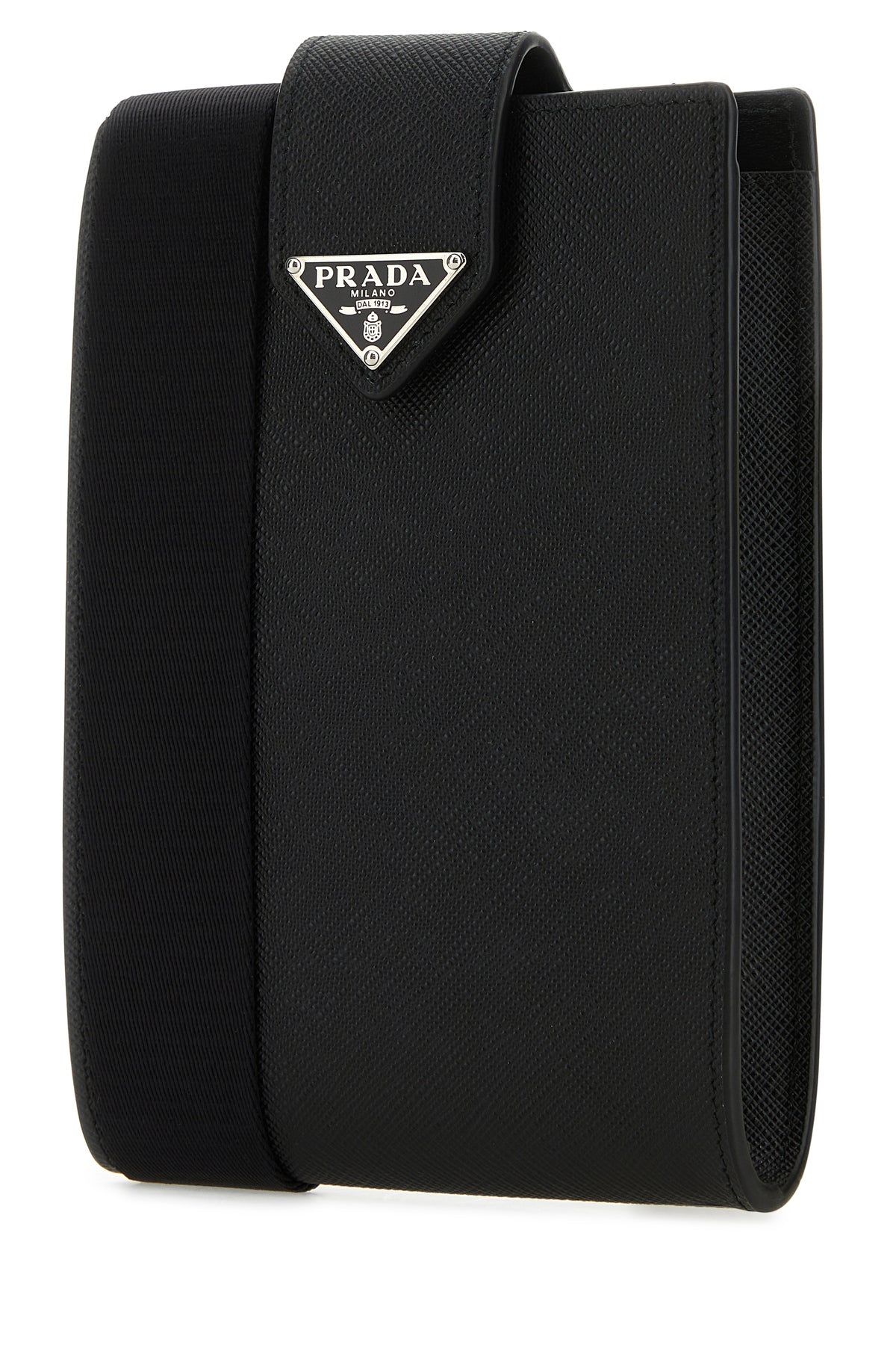 Phone case realized in Saffiano leather enriched by iconic logoed triangle at the front.