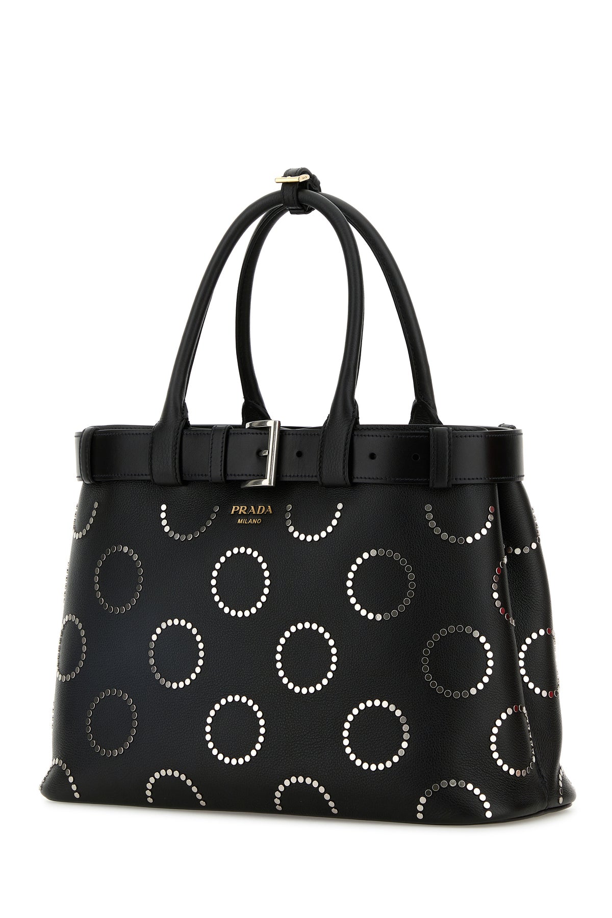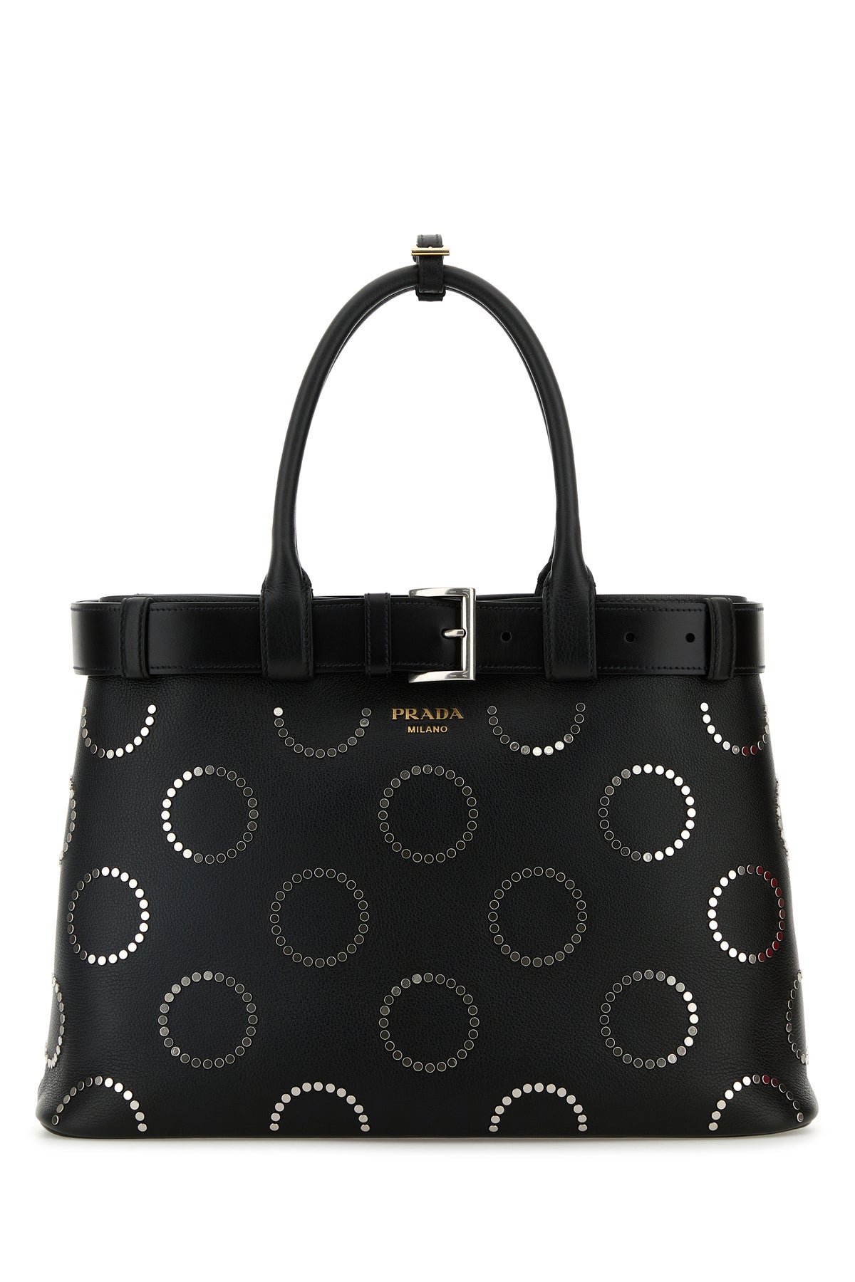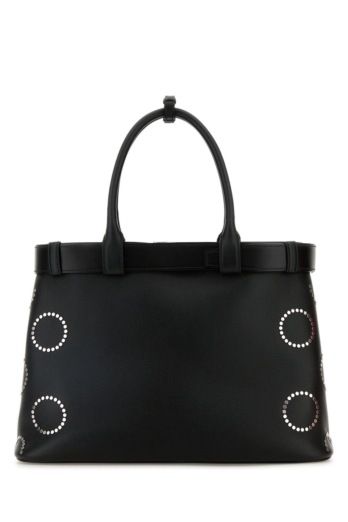 Handbag realized in smooth leather characterized by contrasting printed logo at the front enriched by decorative metal studs on the entire surface and tonal leather belt.