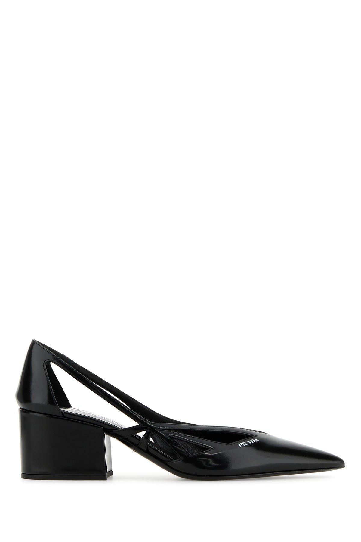 Pumps realized in smooth leather characterized by contrasting printed logo at the front and peculiar cut-out details on the sides.