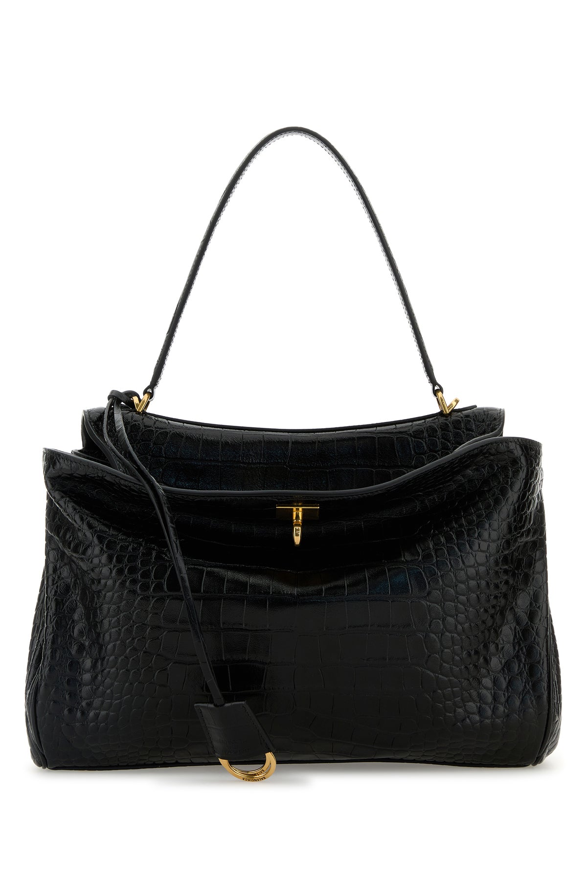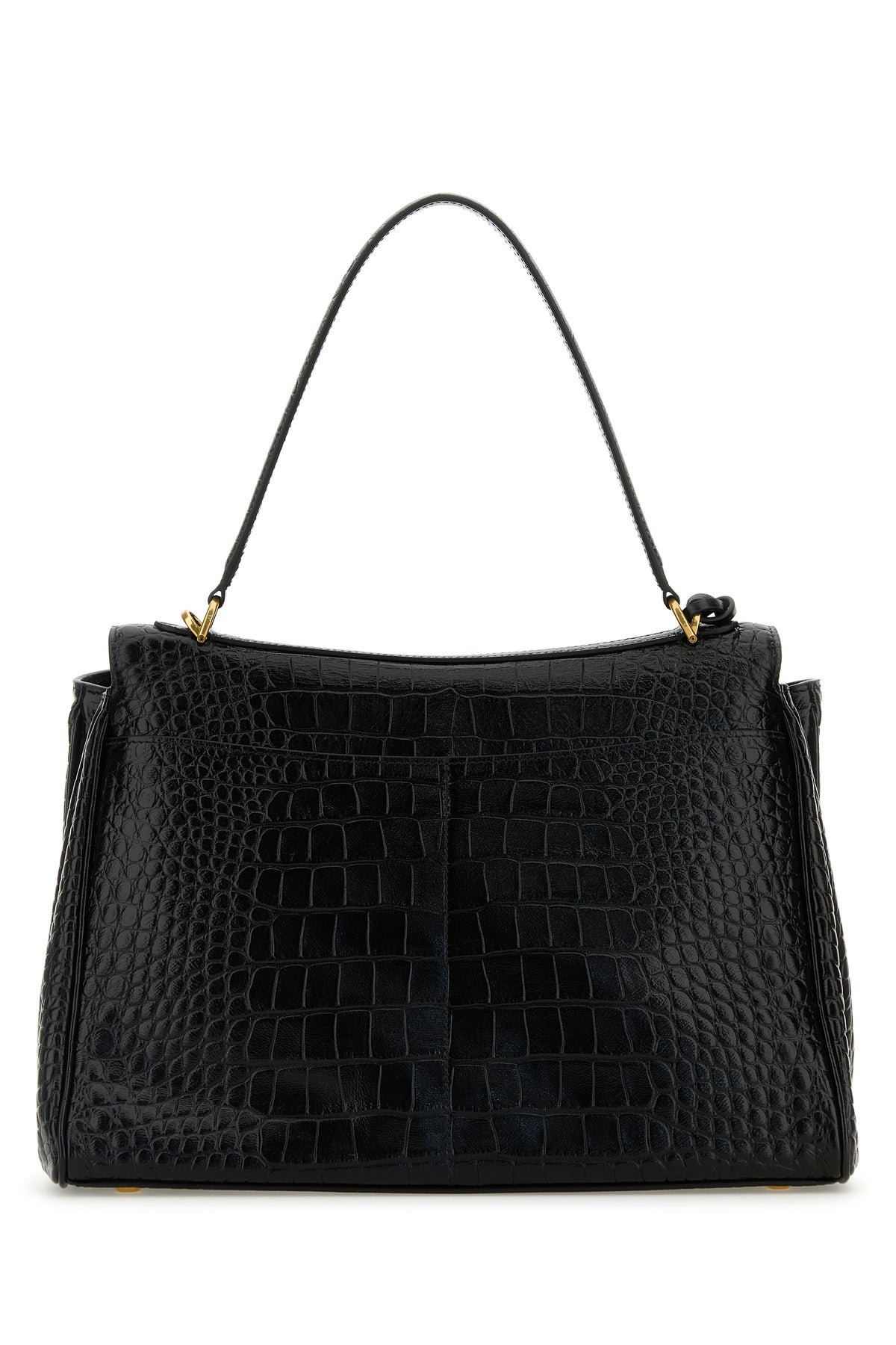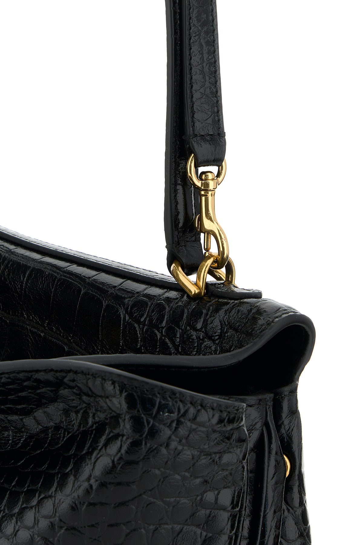 Handbag realized in crocodile embossed leather characterized by snap-fit closure.
