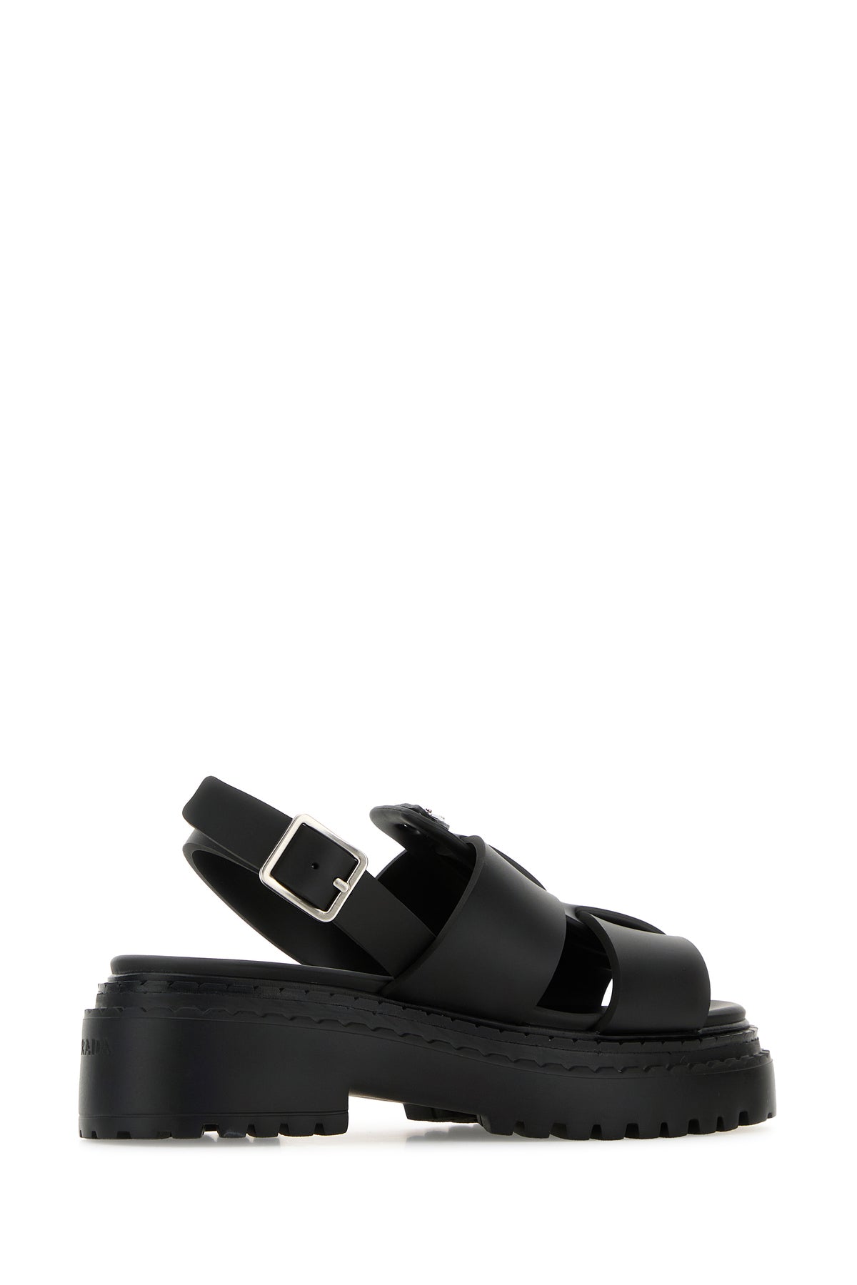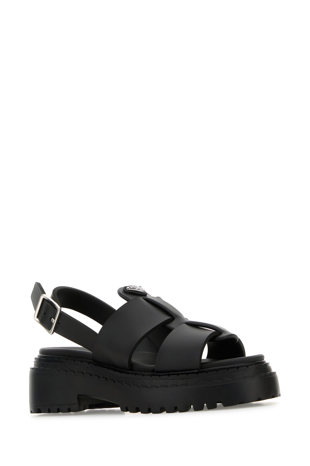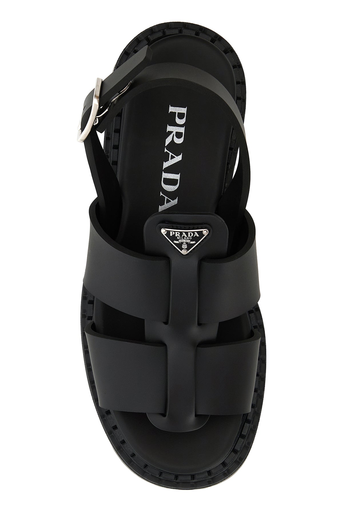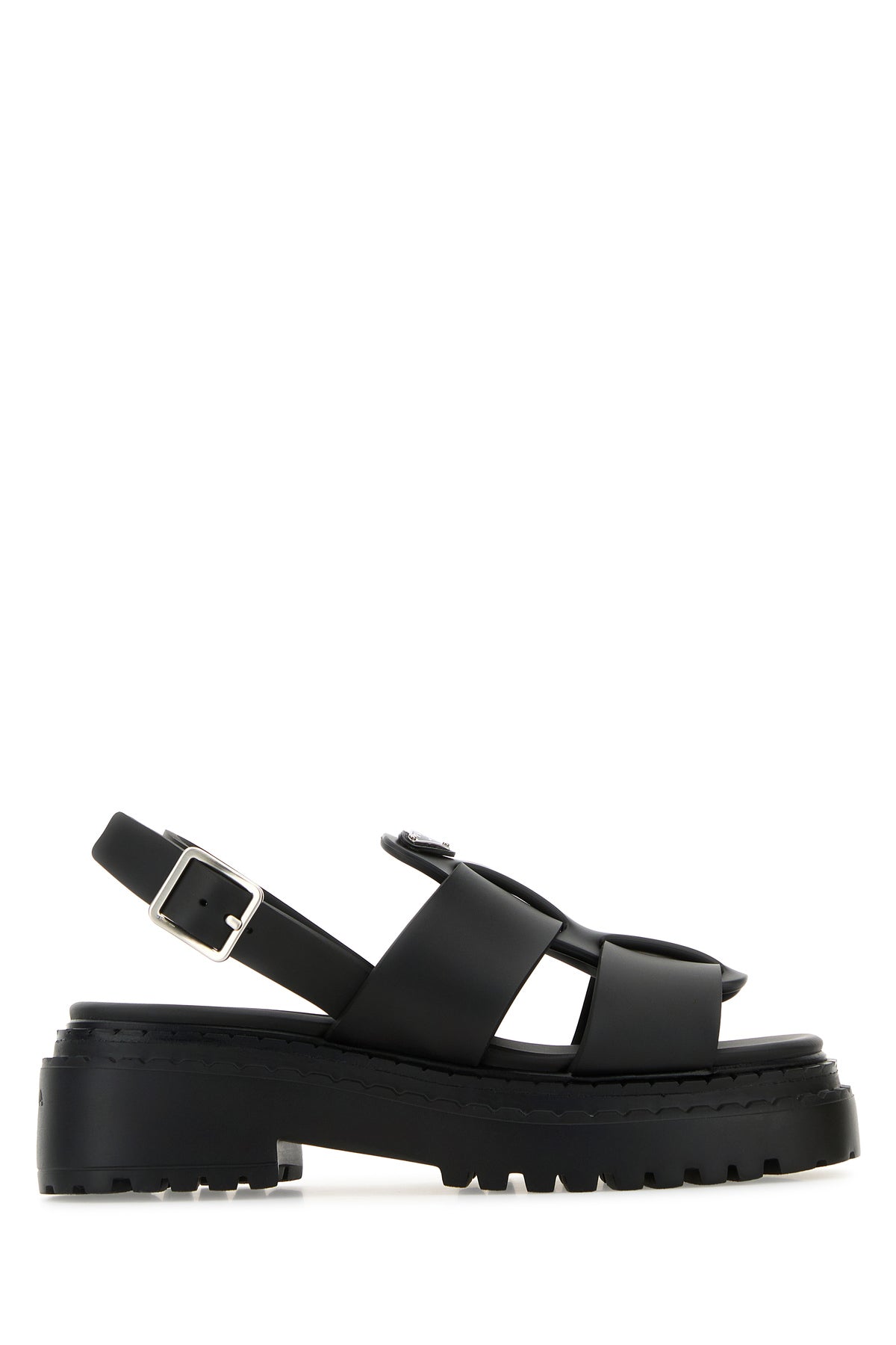 Sandals realized in smooth leather characterized by embossed logo at the back enriched by iconic logoed metal triangle on the instep.