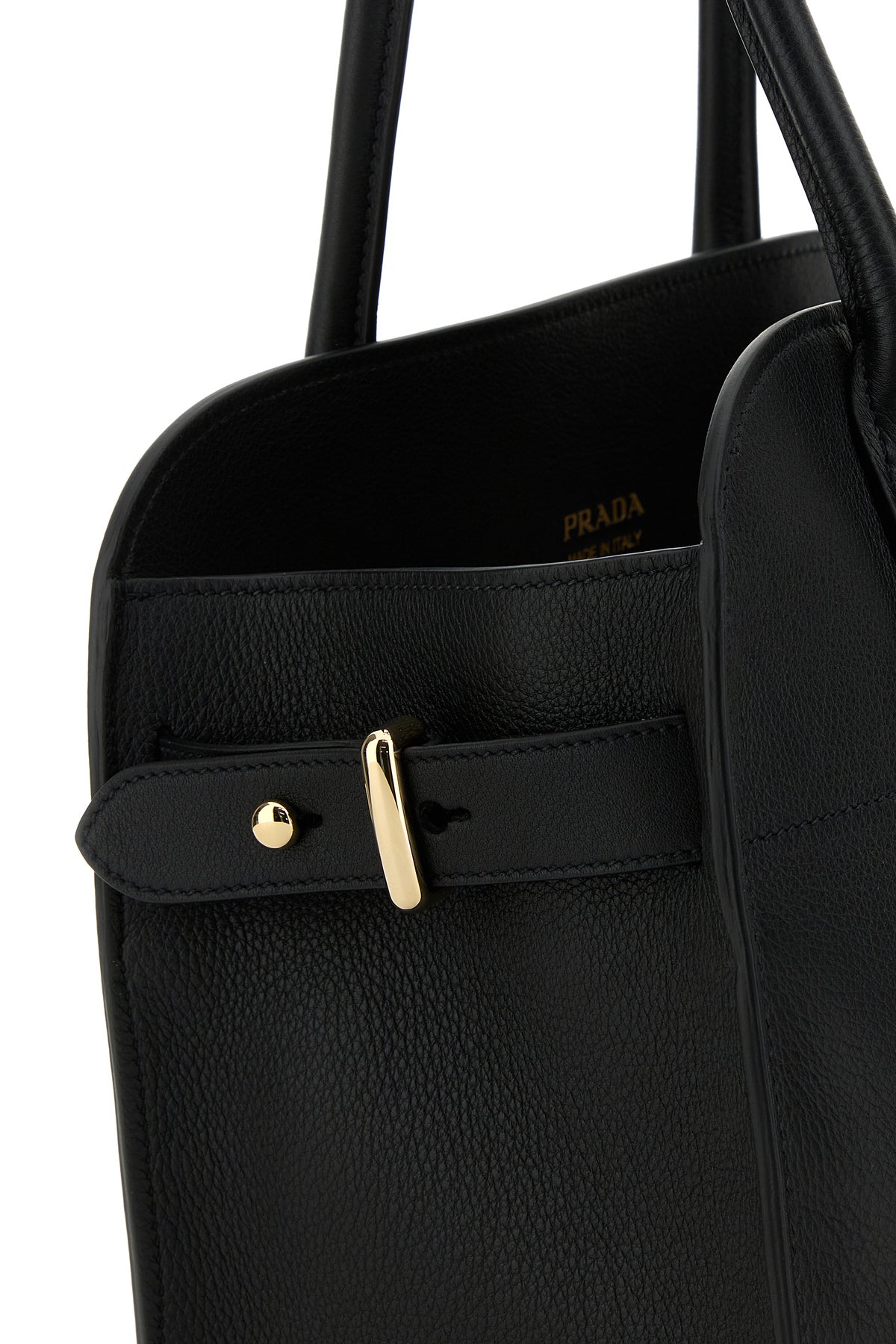 Shopping bag realized in pebble leather characterized by laminated printed logo at the front.