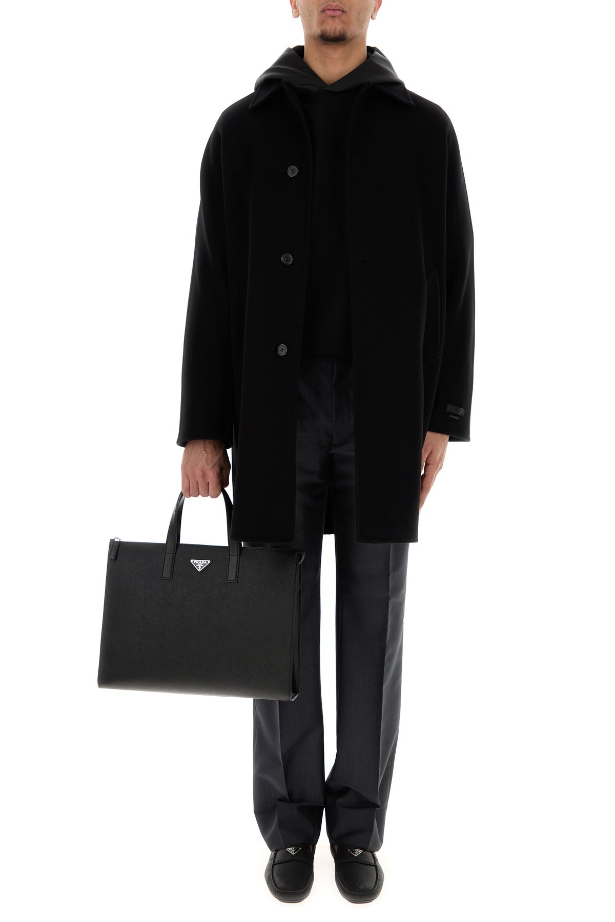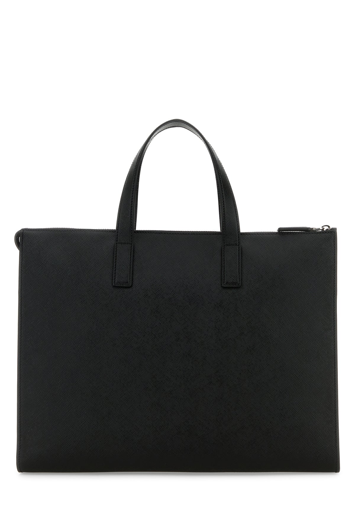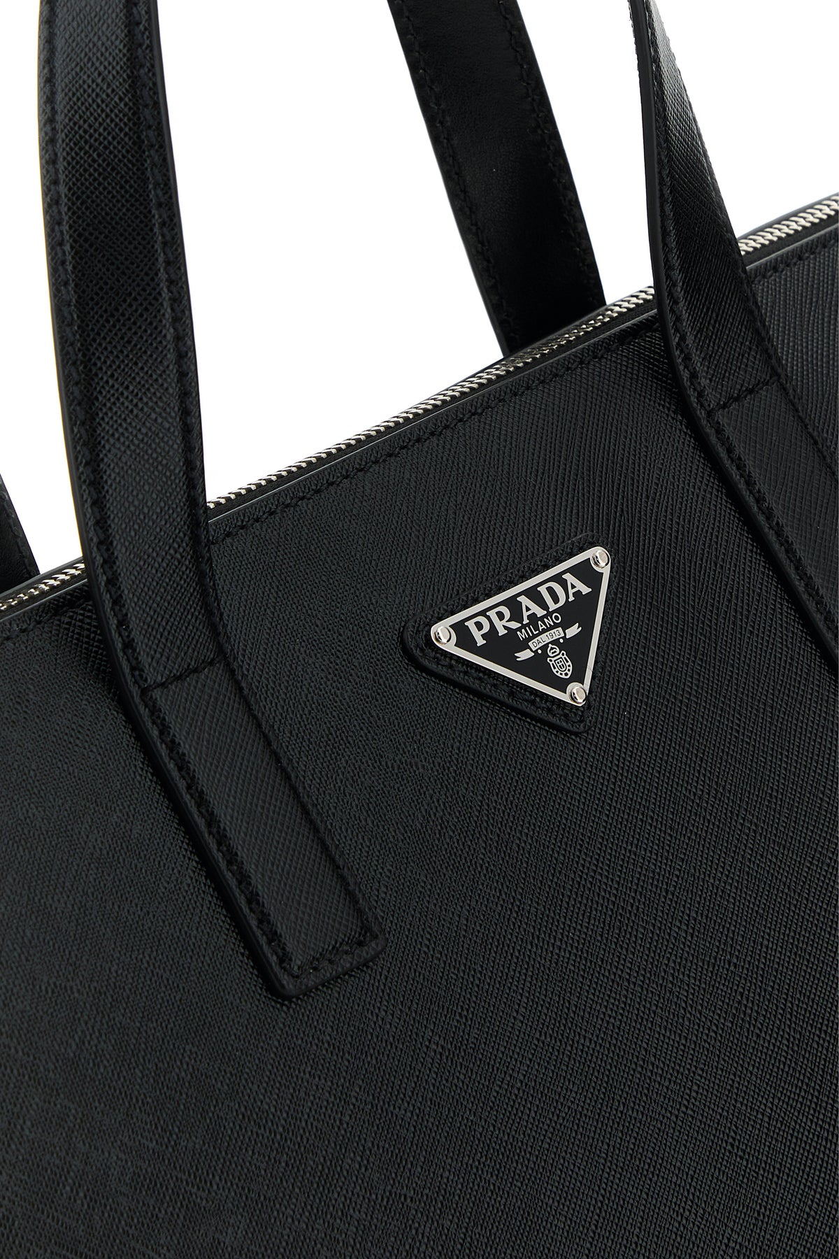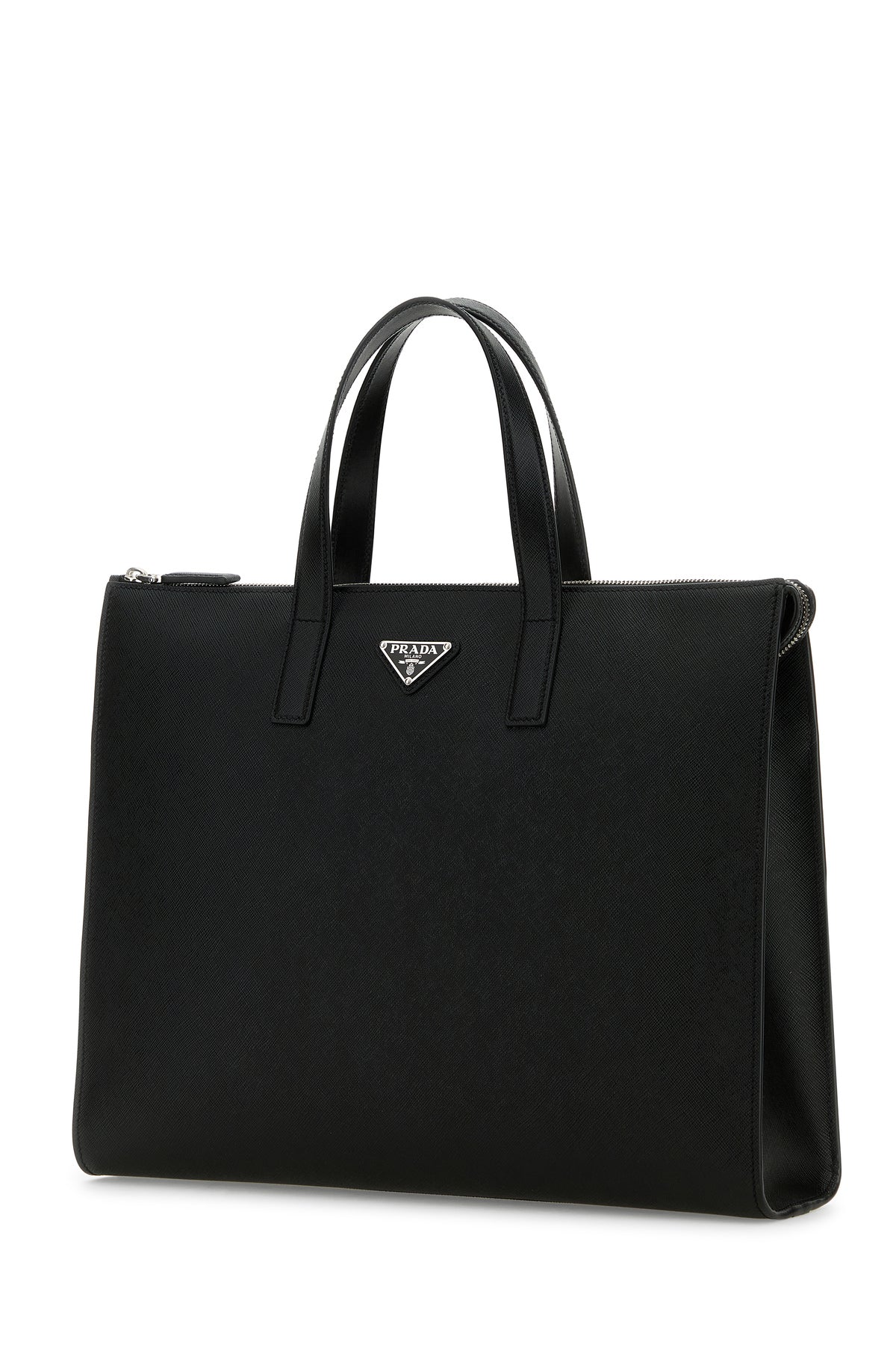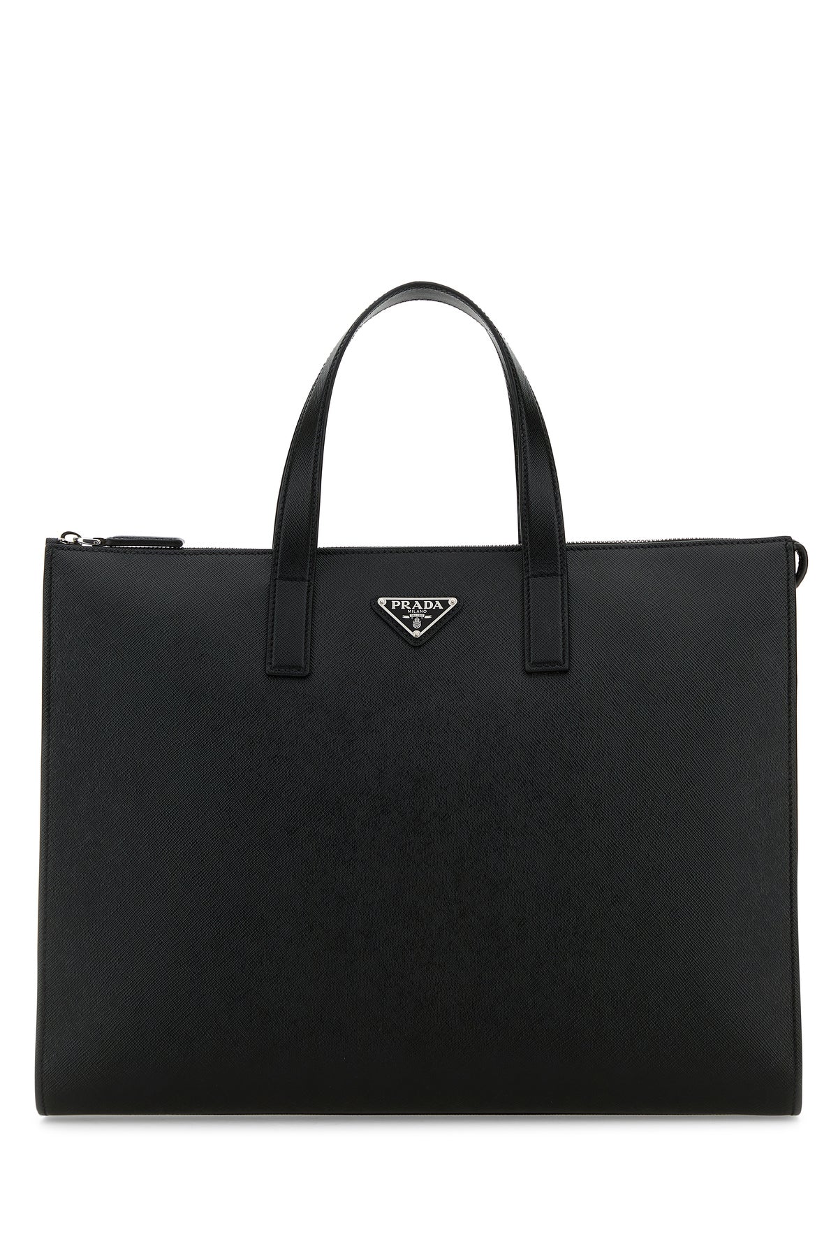 Shopping bag realized in Saffiano leather enriched by iconic logoed metal triangle at the front.