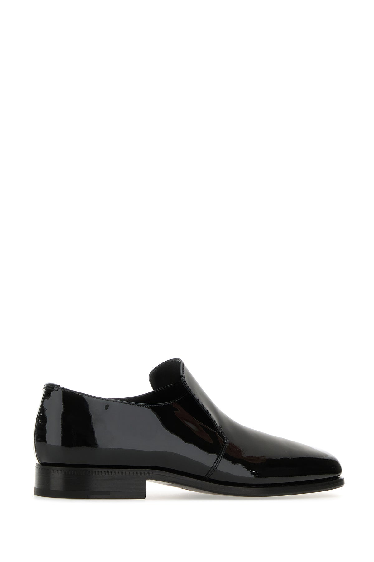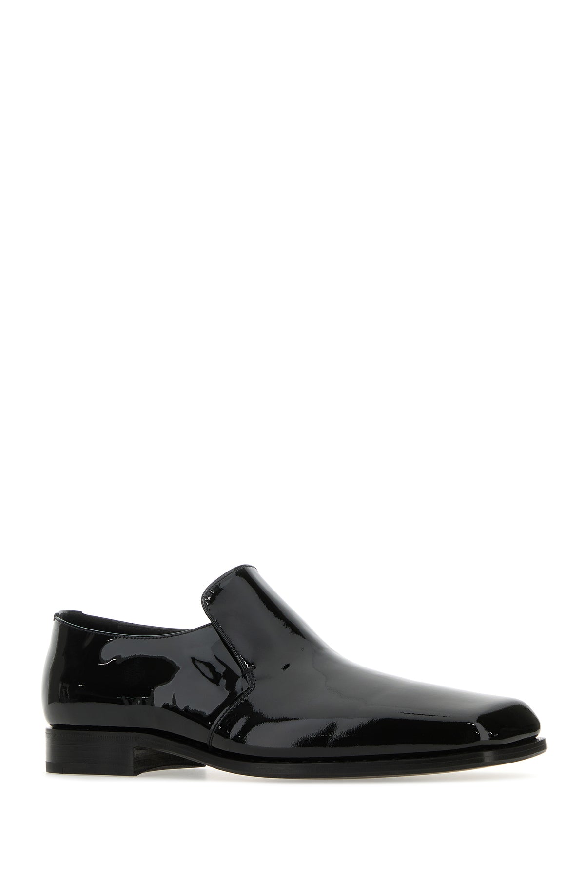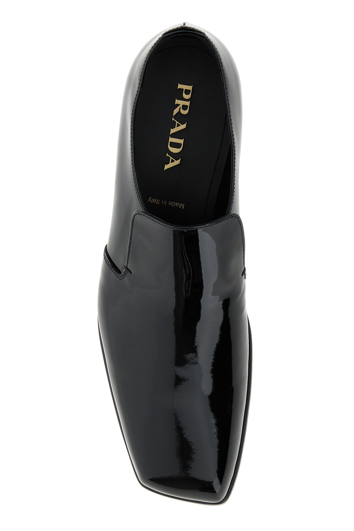 Slip ons realized in patent leather characterized by squared toe.