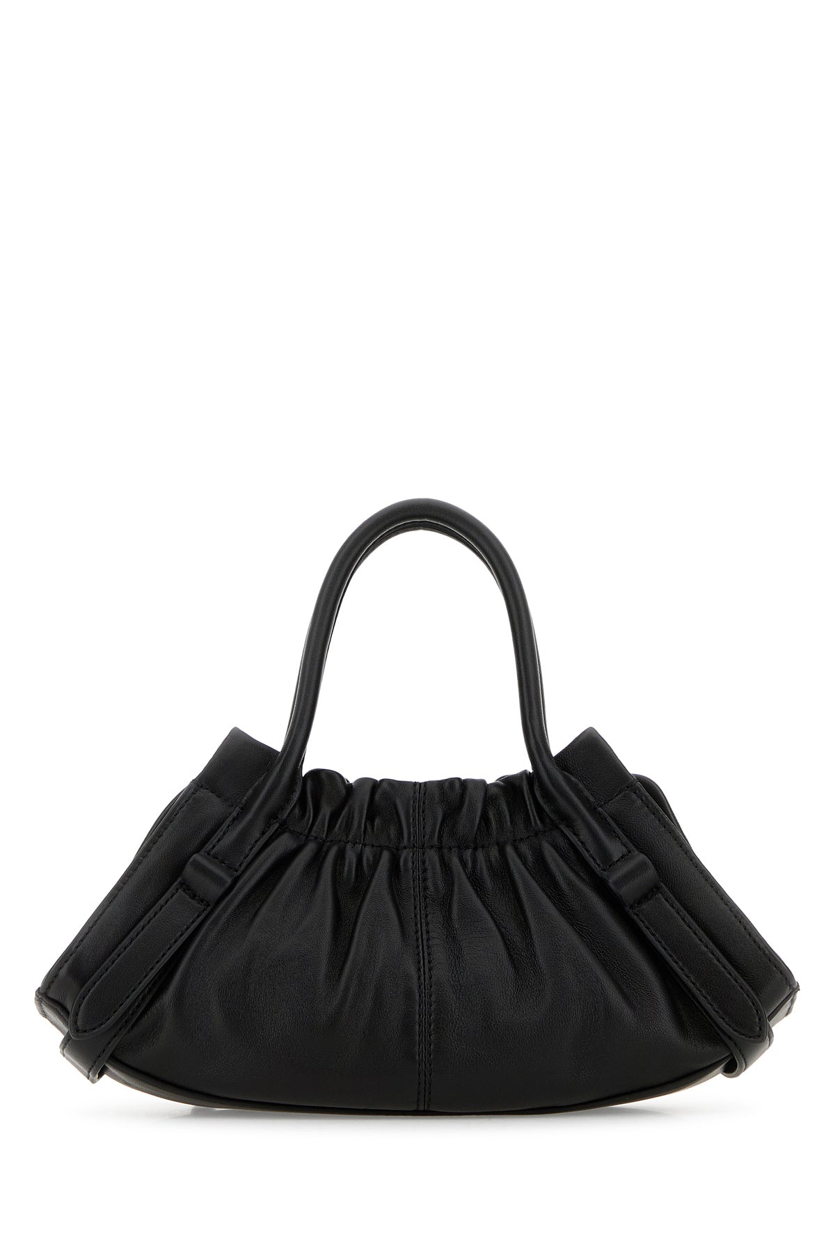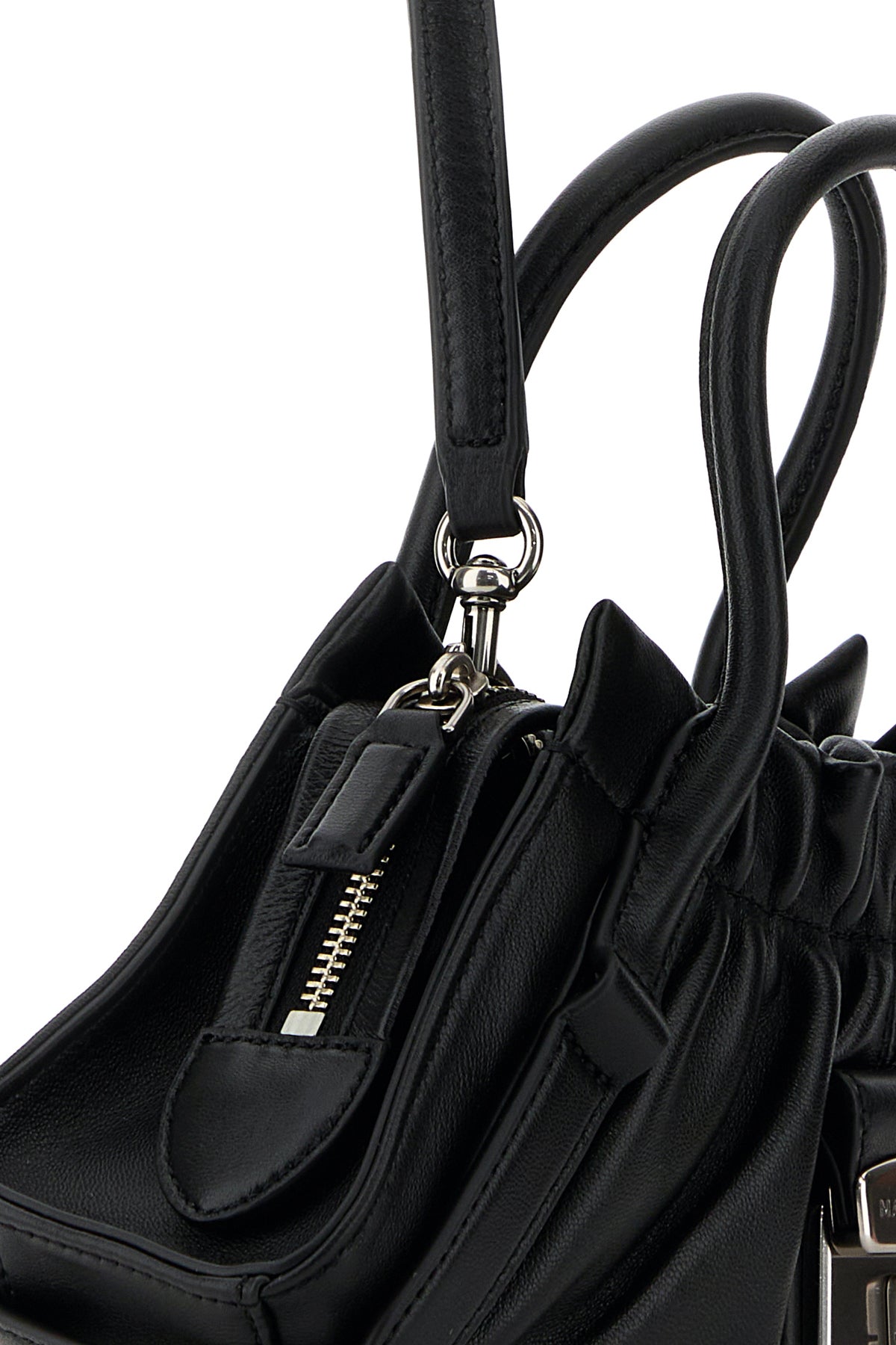 Handbag realized in leather enriched by logoed metal detail at the front.