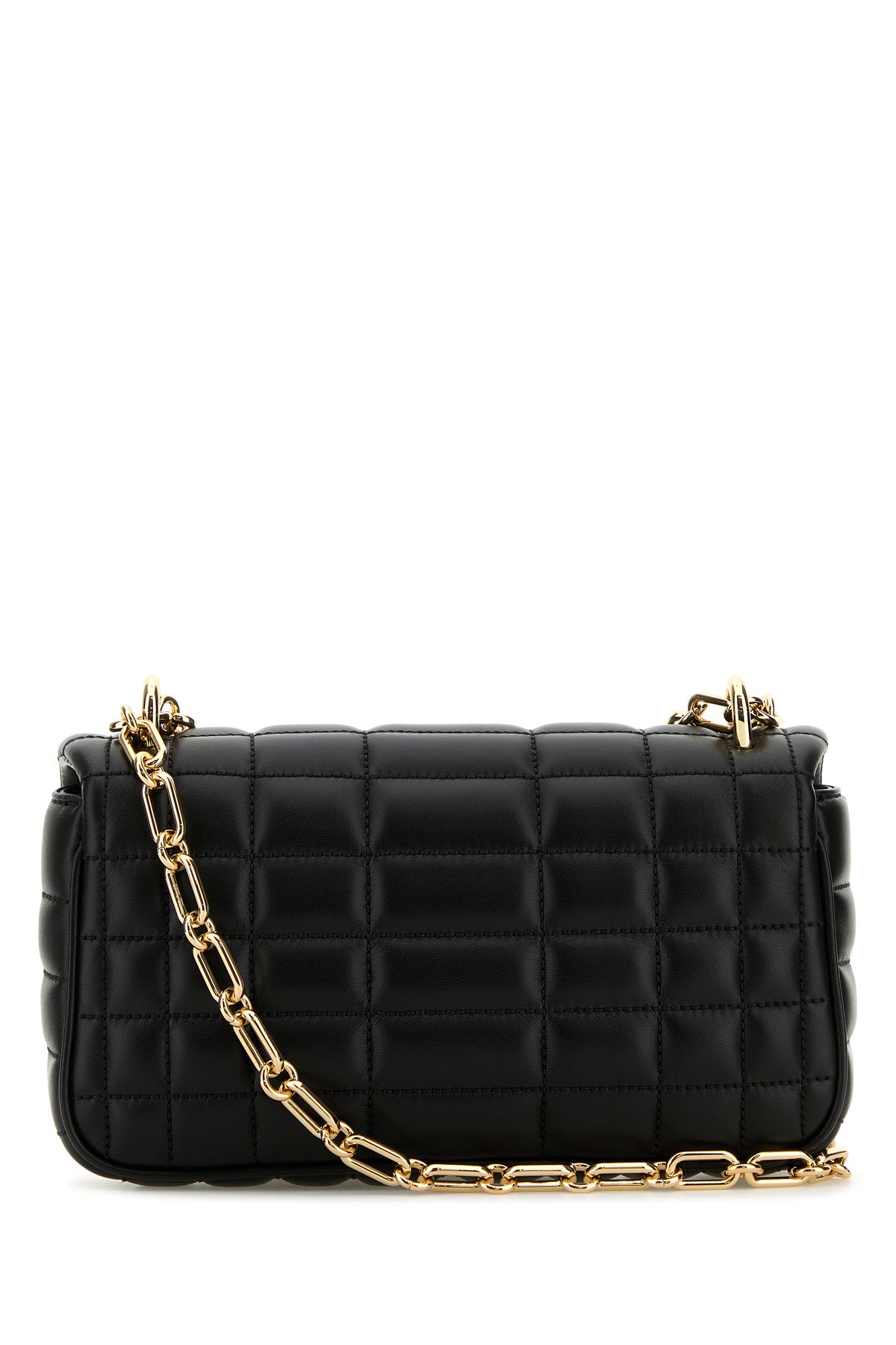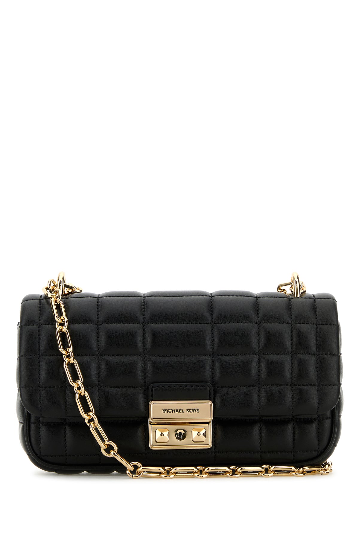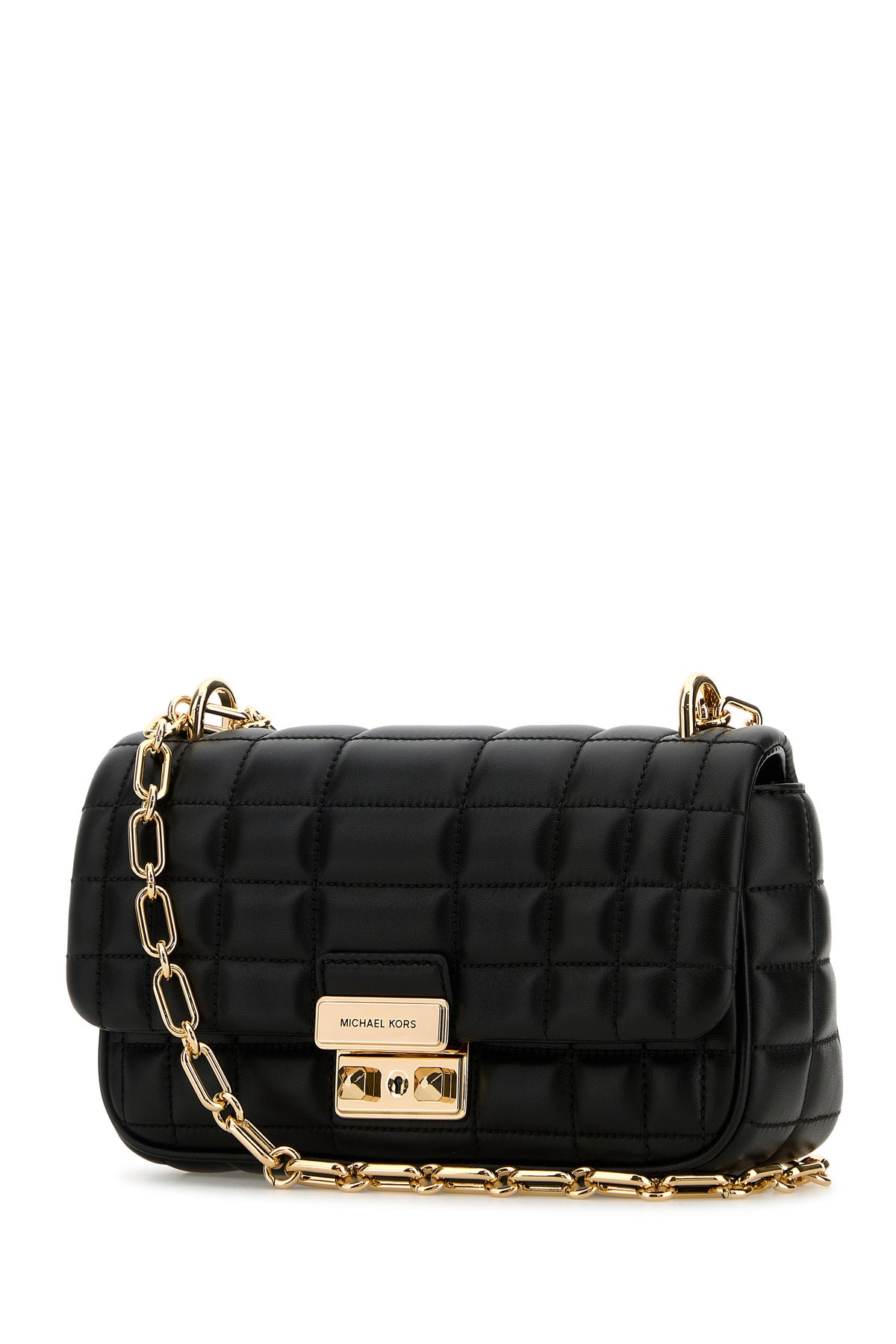 Shoulder bag realized in smooth quilted leather enriched by metal logoed plate at the front.