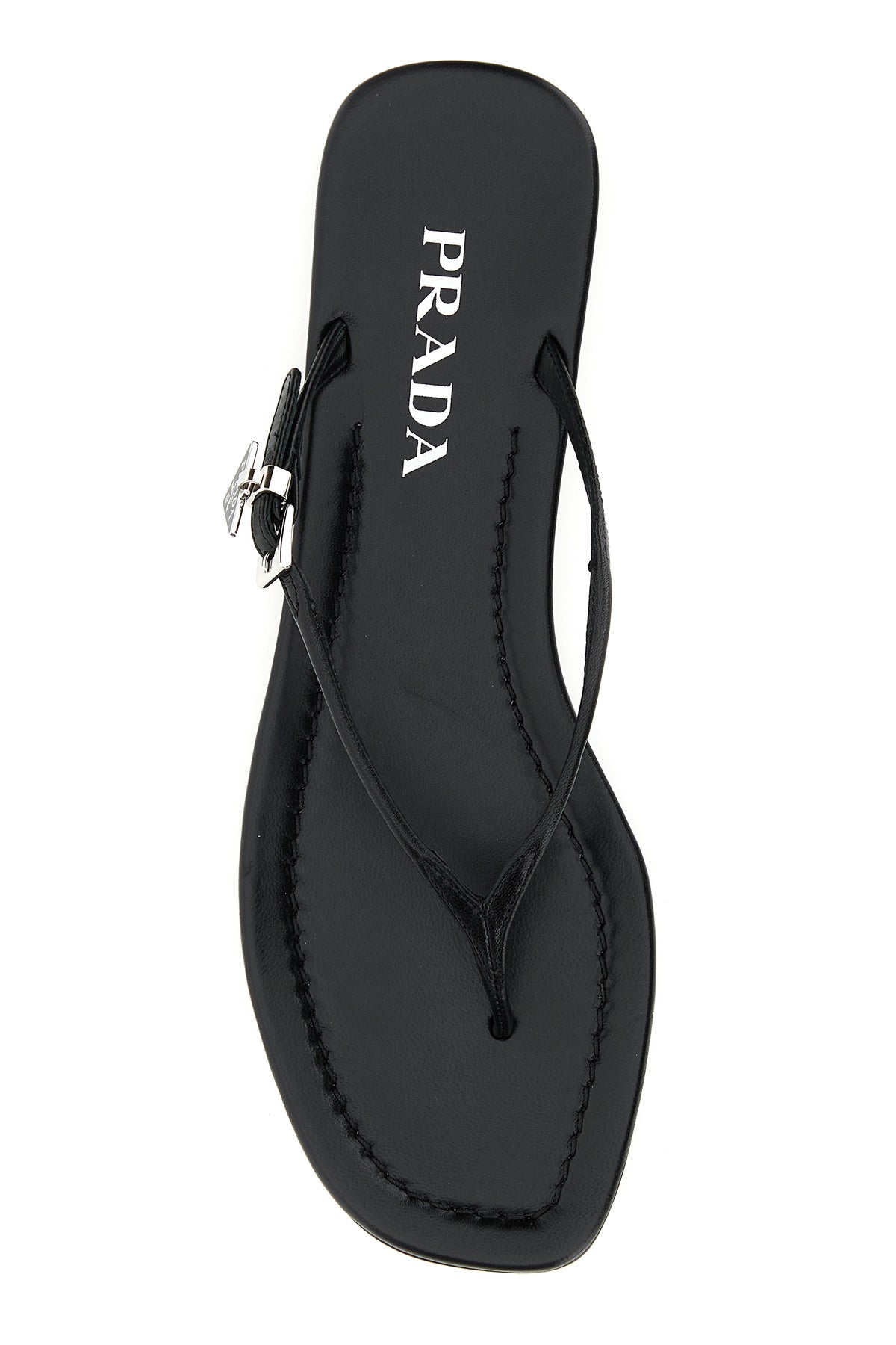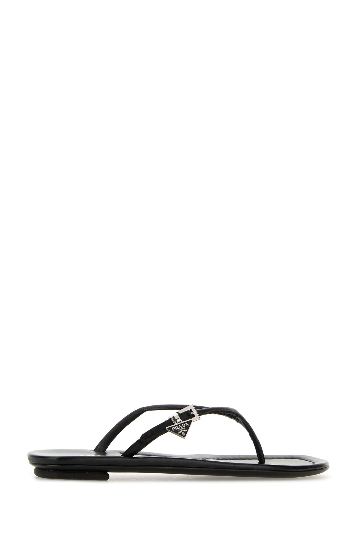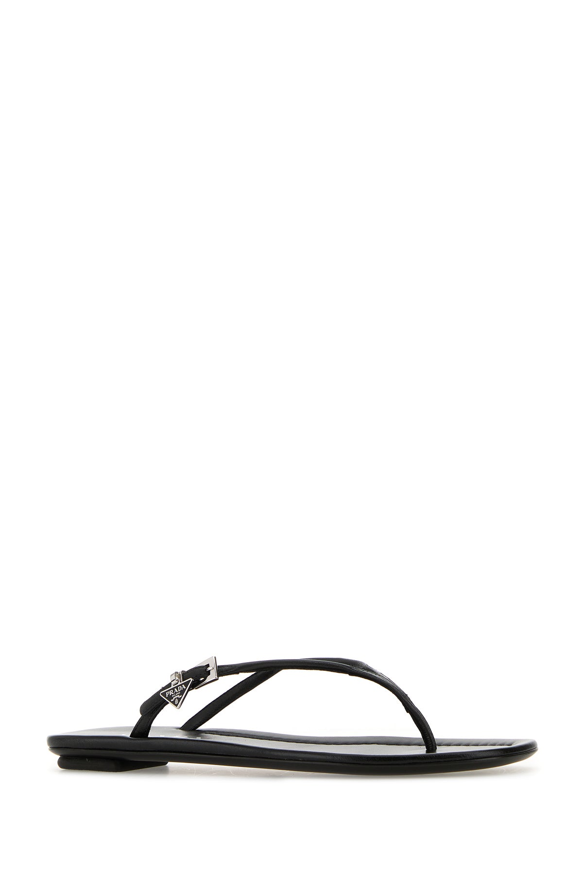 Thong slippers realized in leather enriched by iconic logoed metal triangle on the side.
