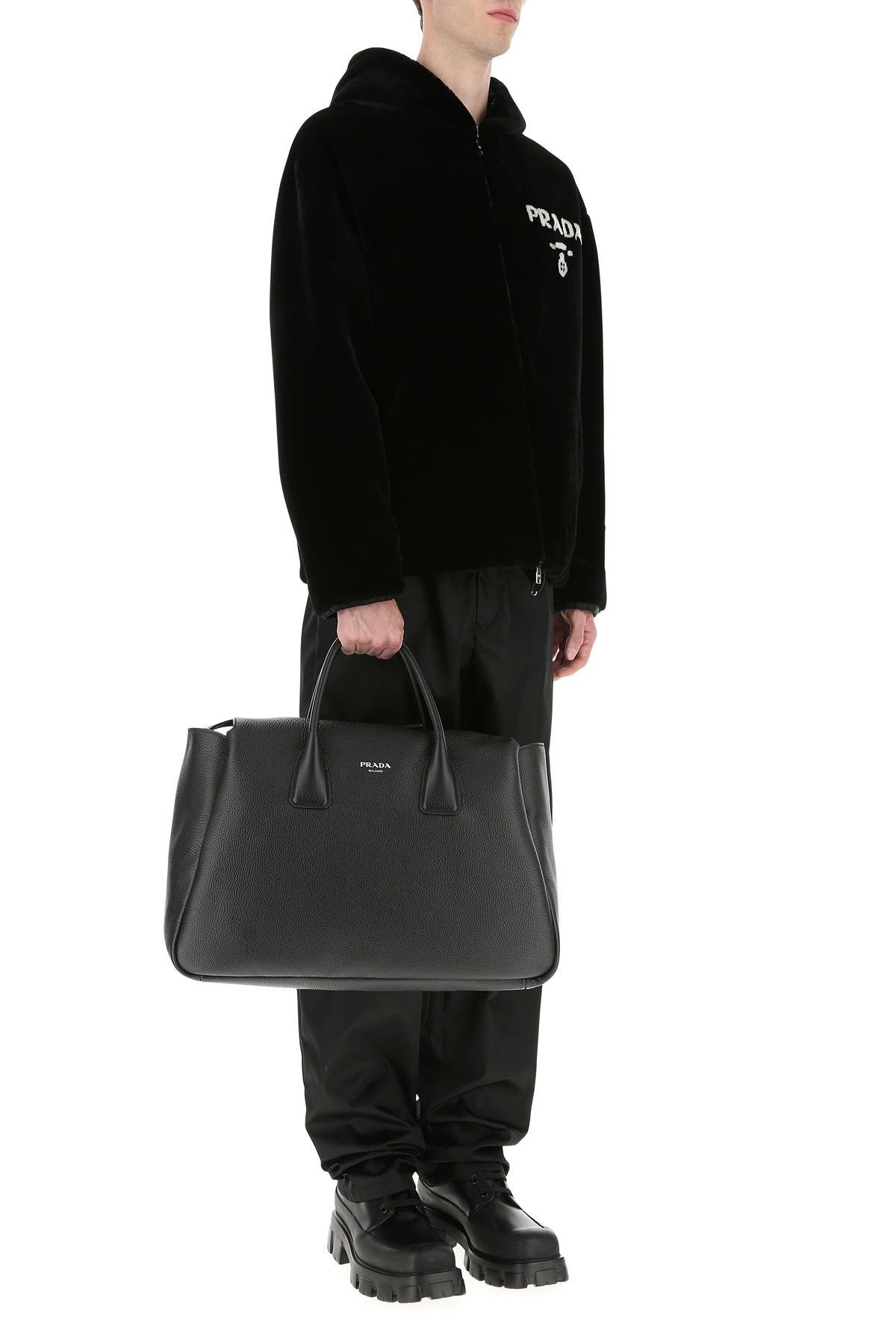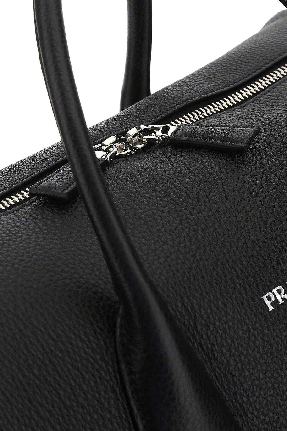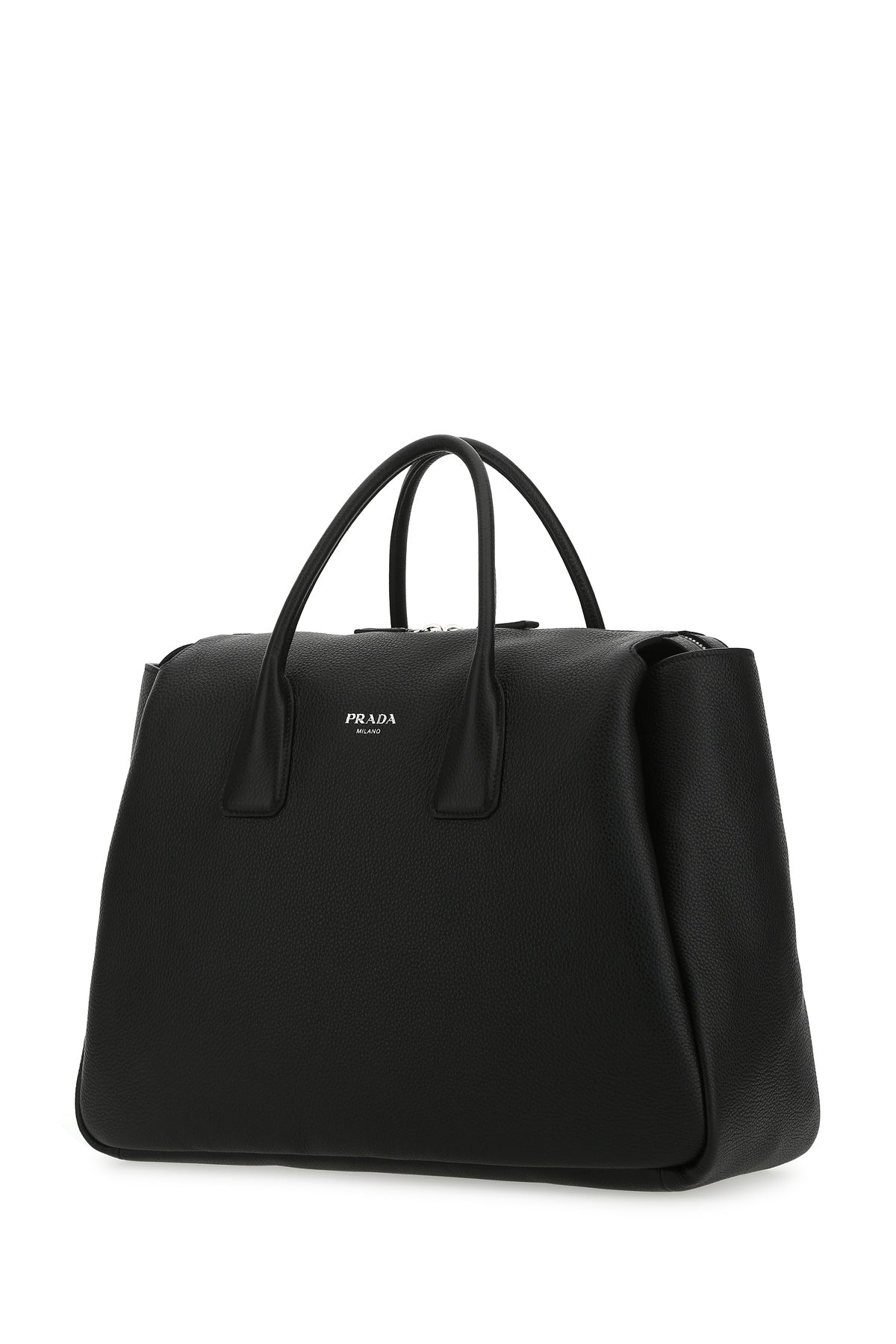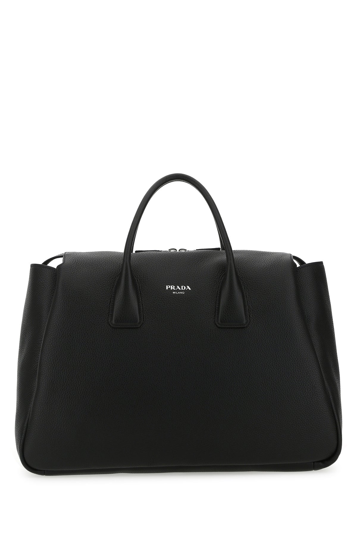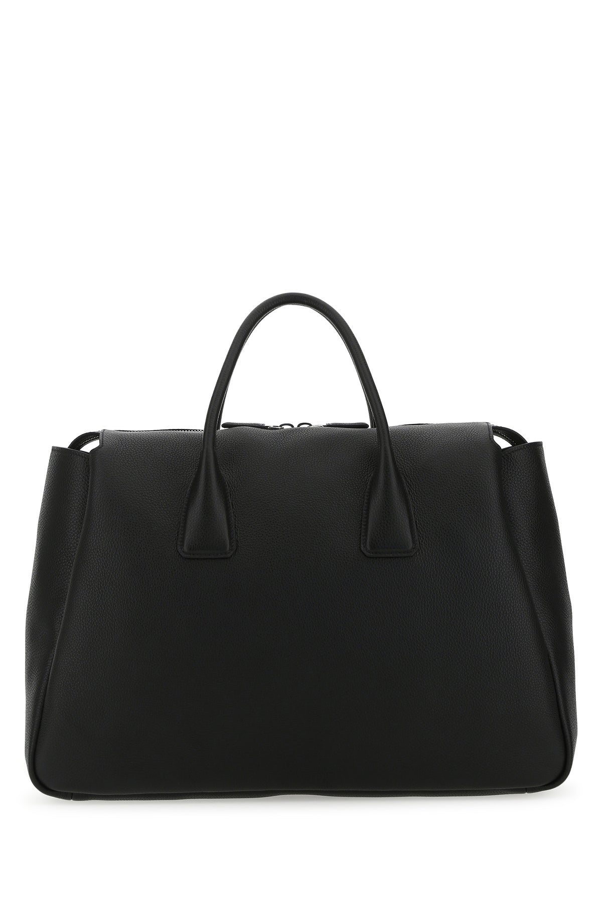 Travel bag realized in grained leather enriched by contrasting printed logo at the front.