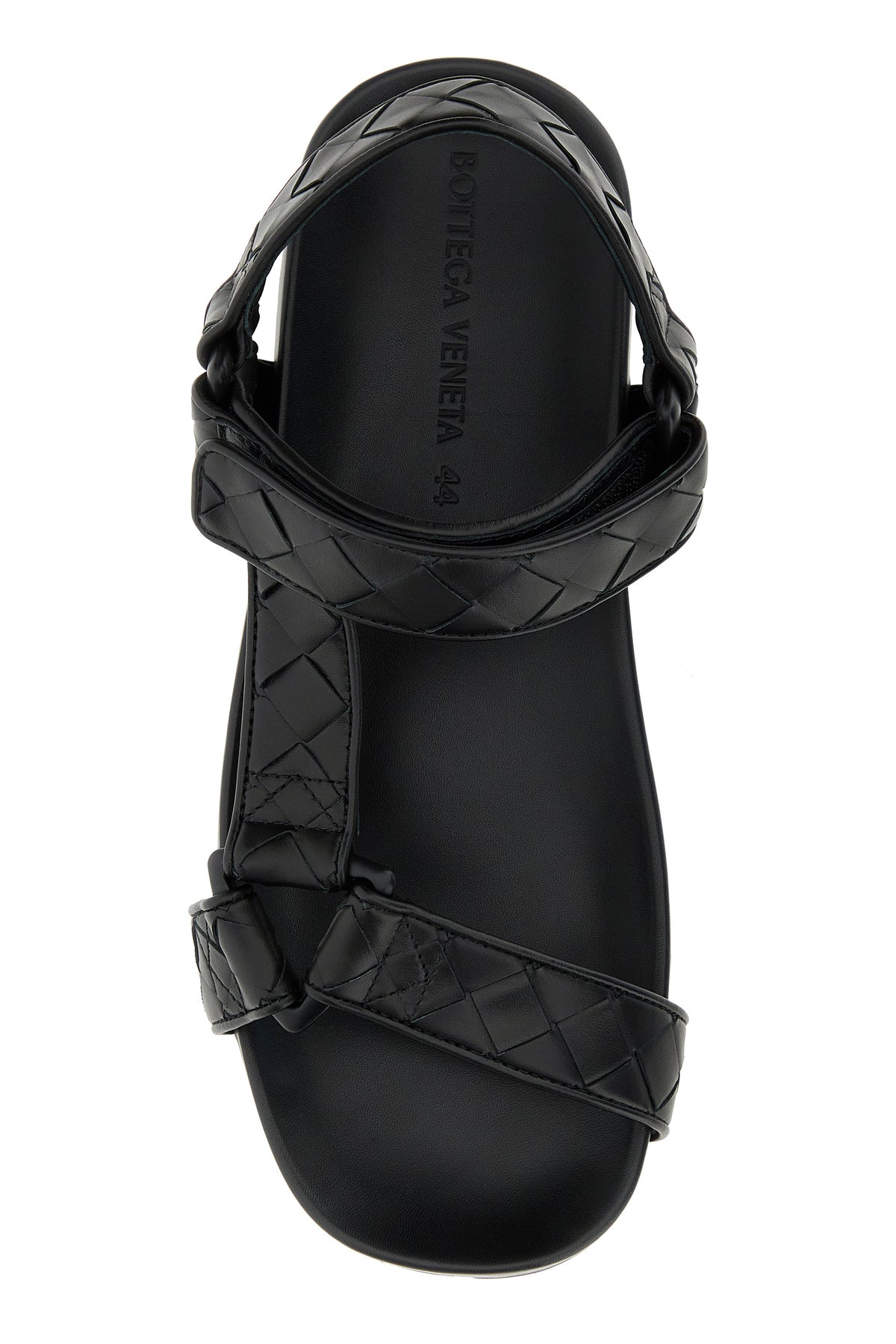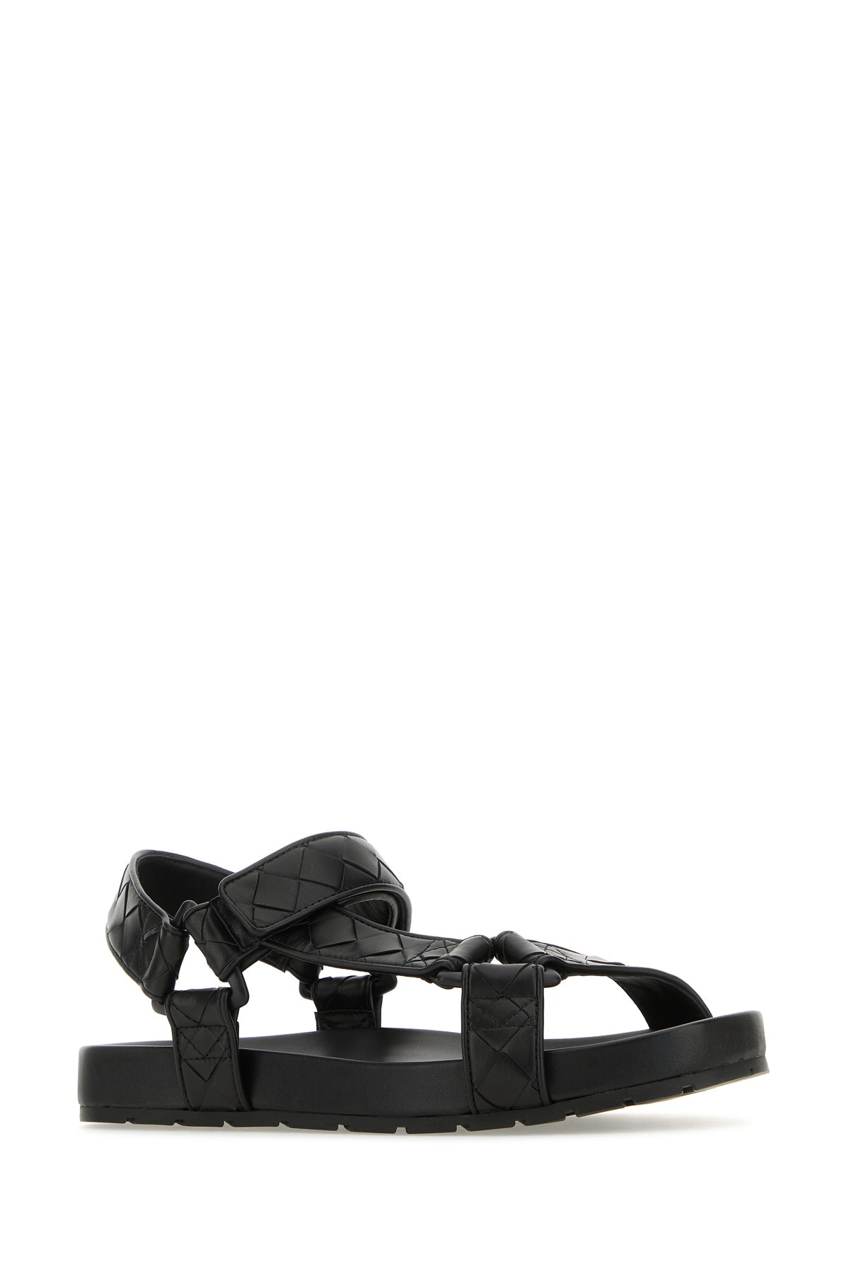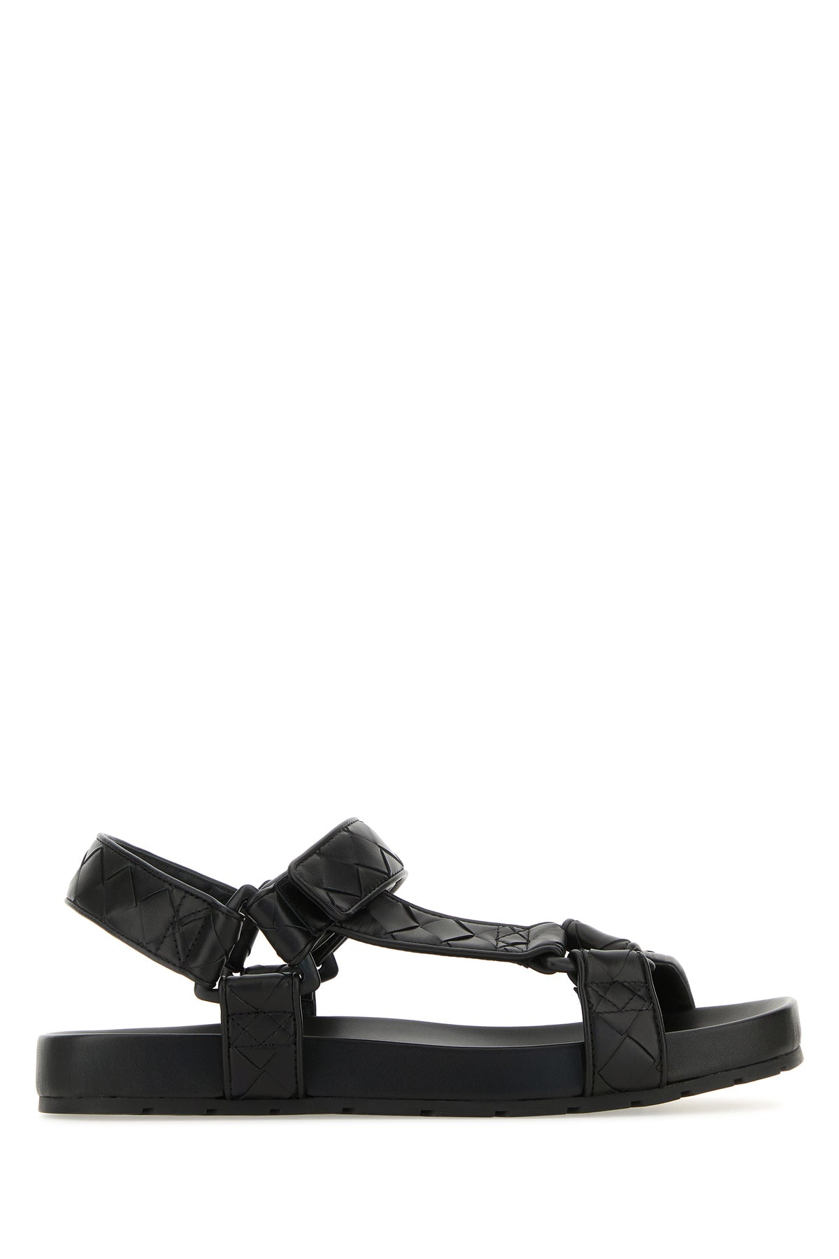 Sandals realized in smooth leather characterized by Intrecciato motif on the entire surface.