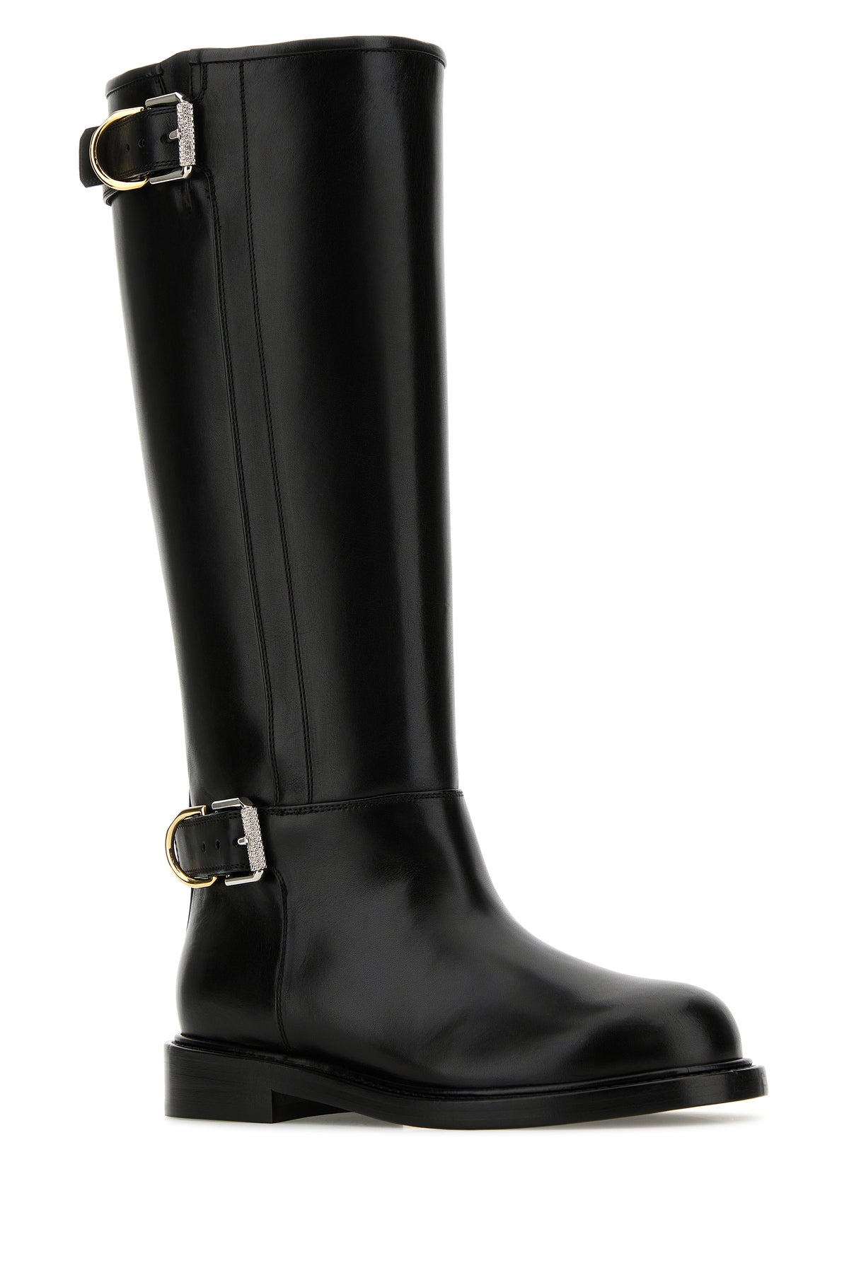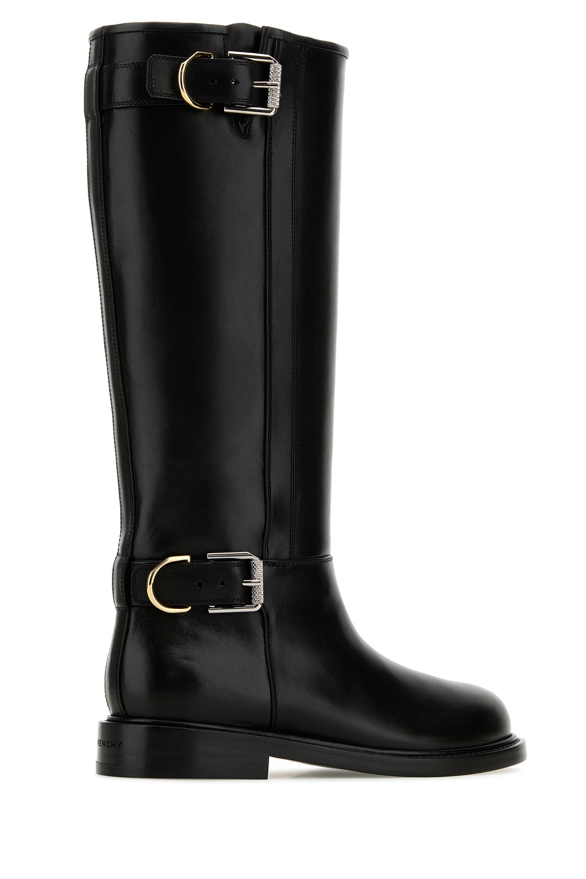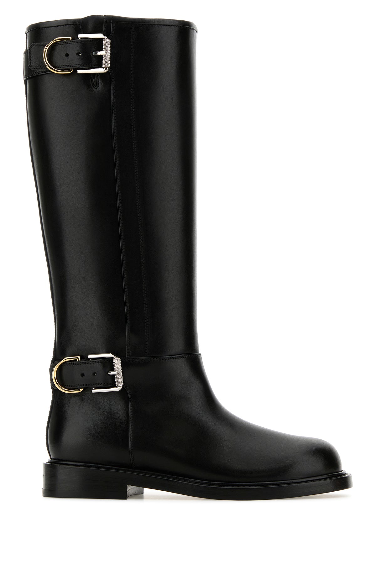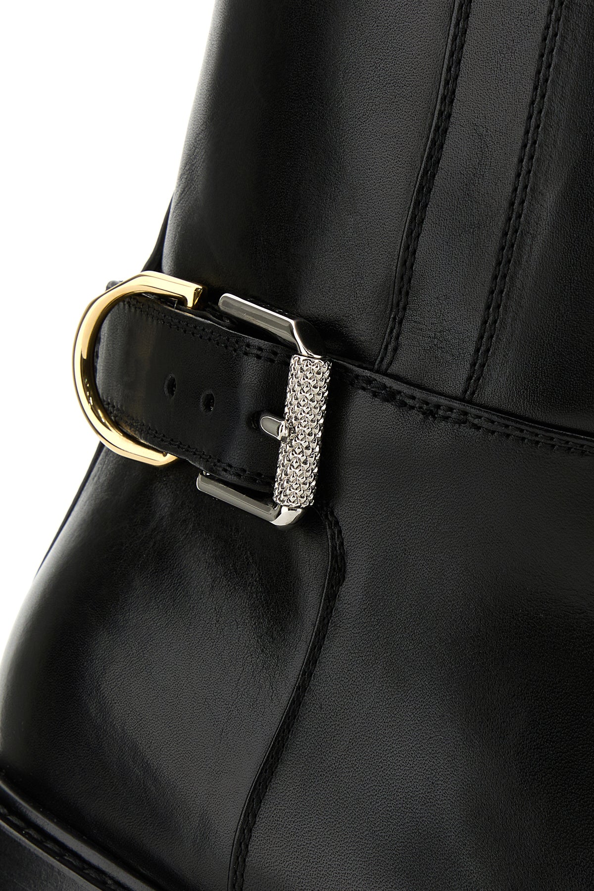Boots realized in polished-finish slightly pebble calf leather enriched by decorative straps with metal buckles on the side.