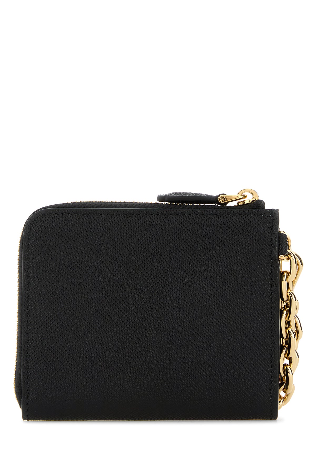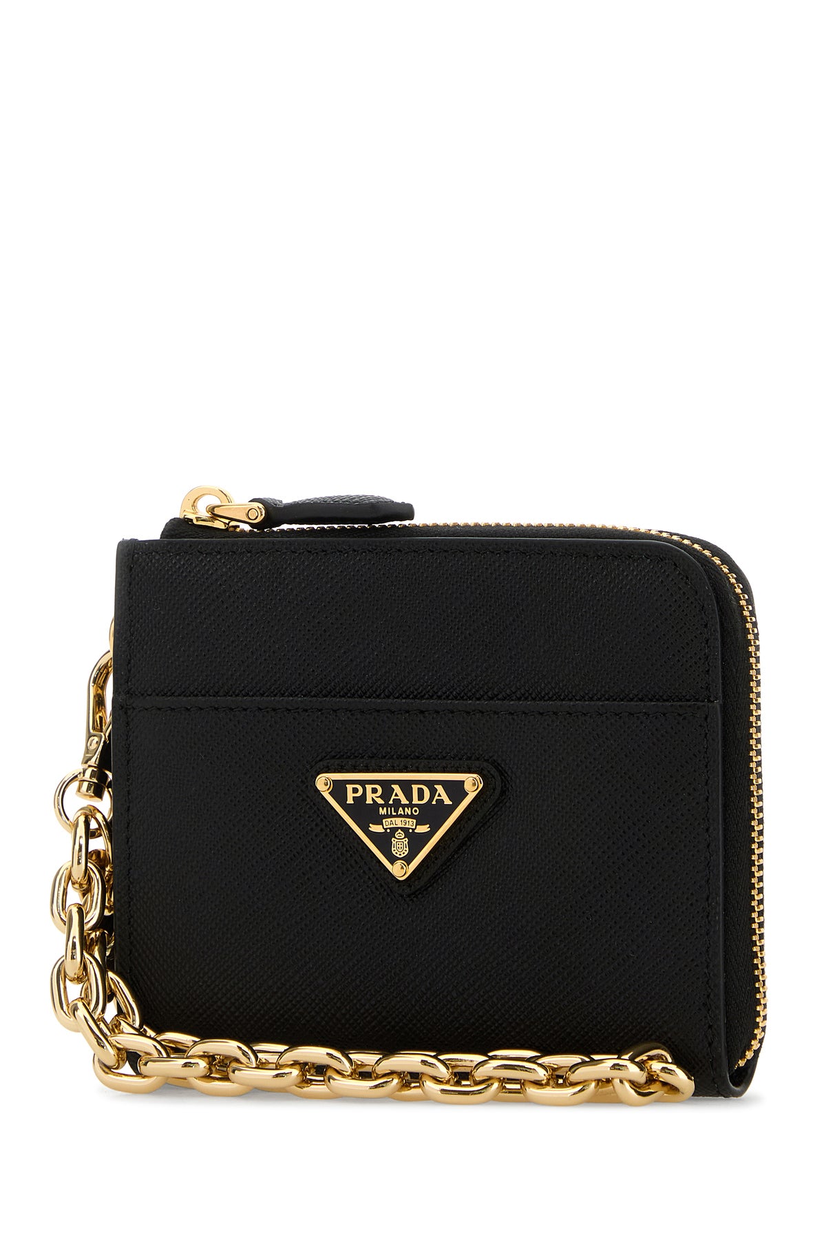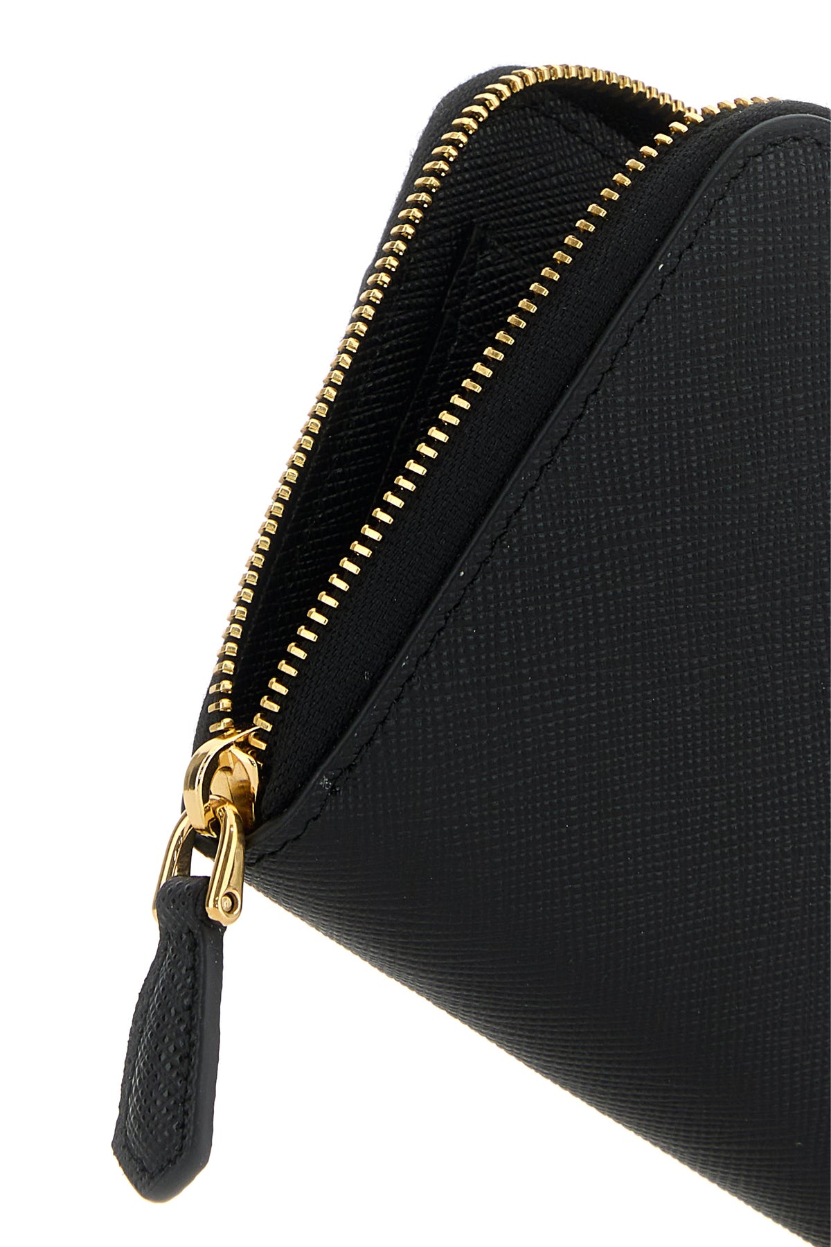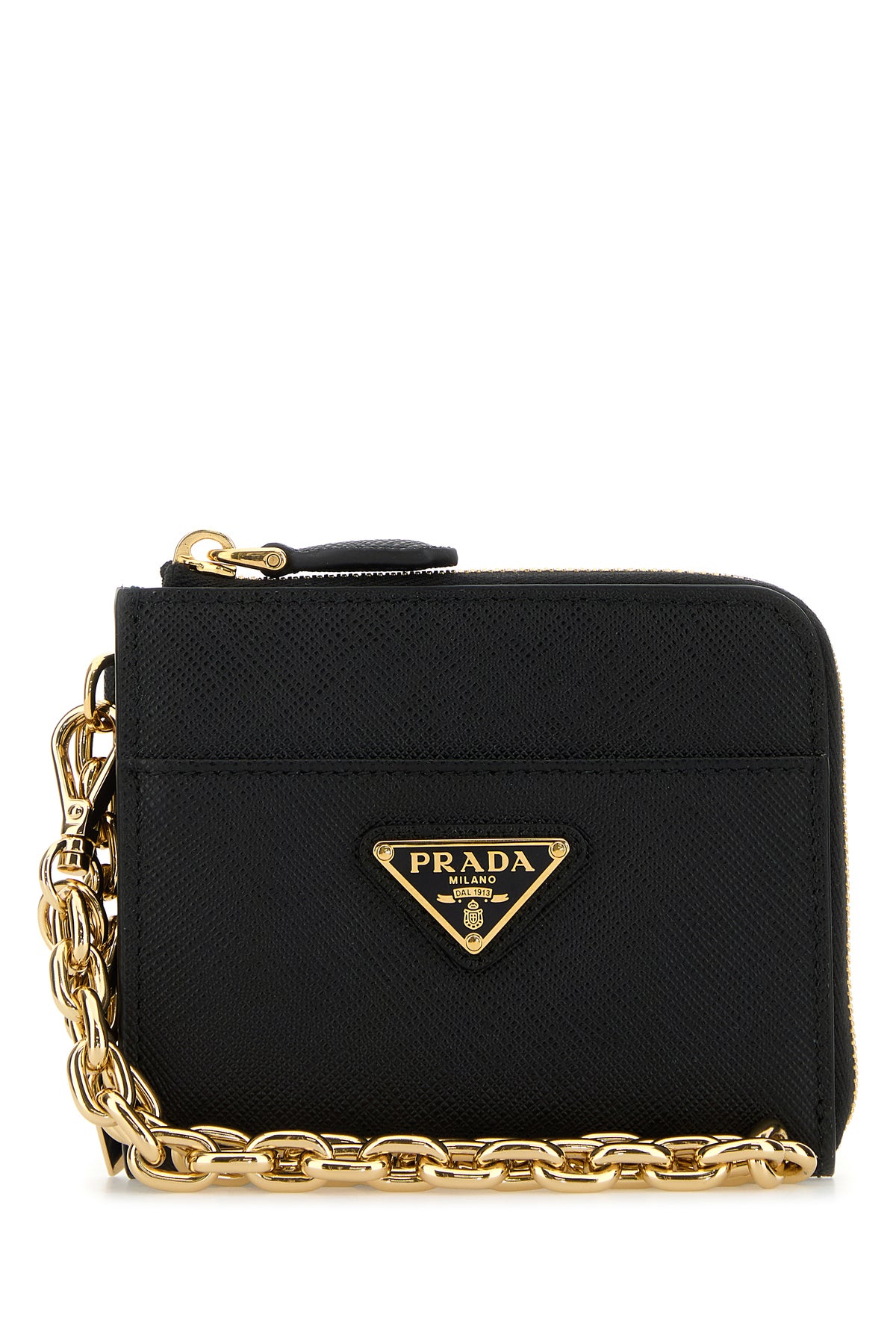 Wallet realized in Saffiano leather enriched by metal iconic logoed triangle at the front.