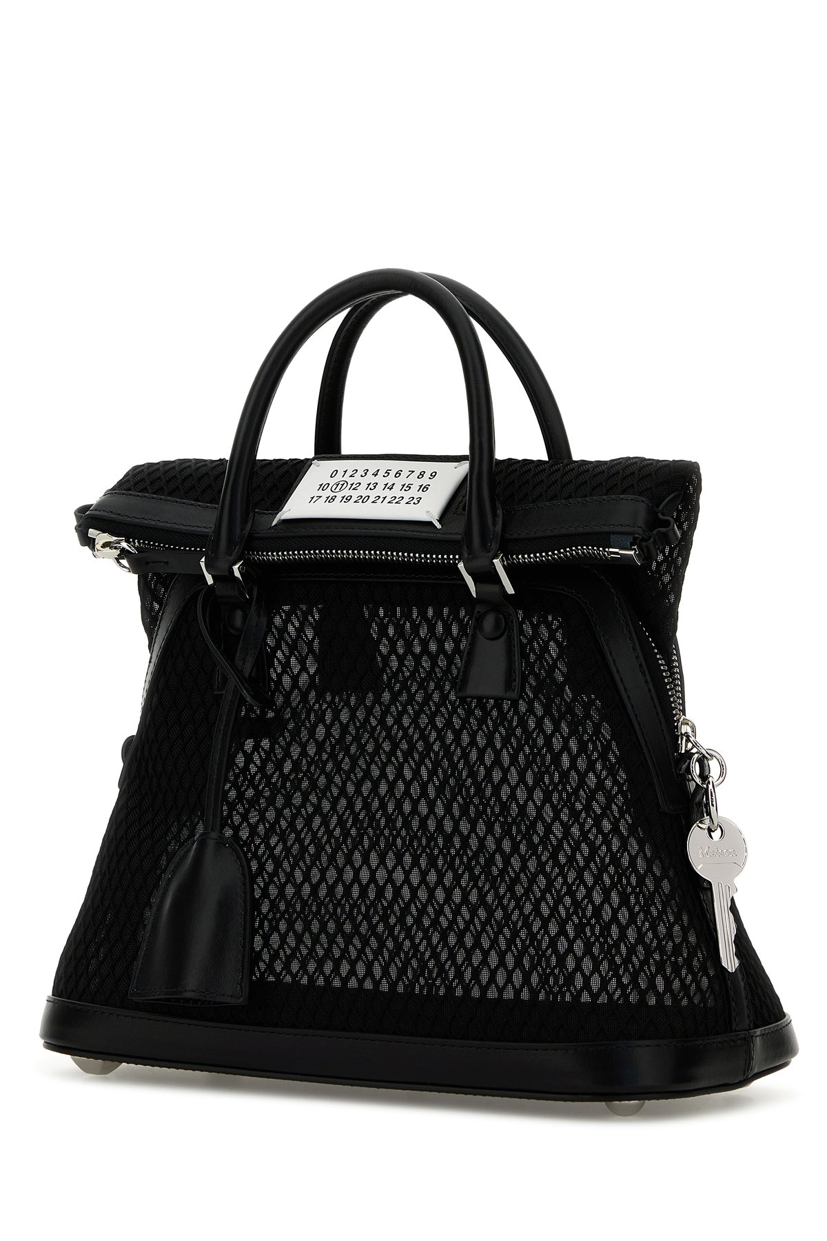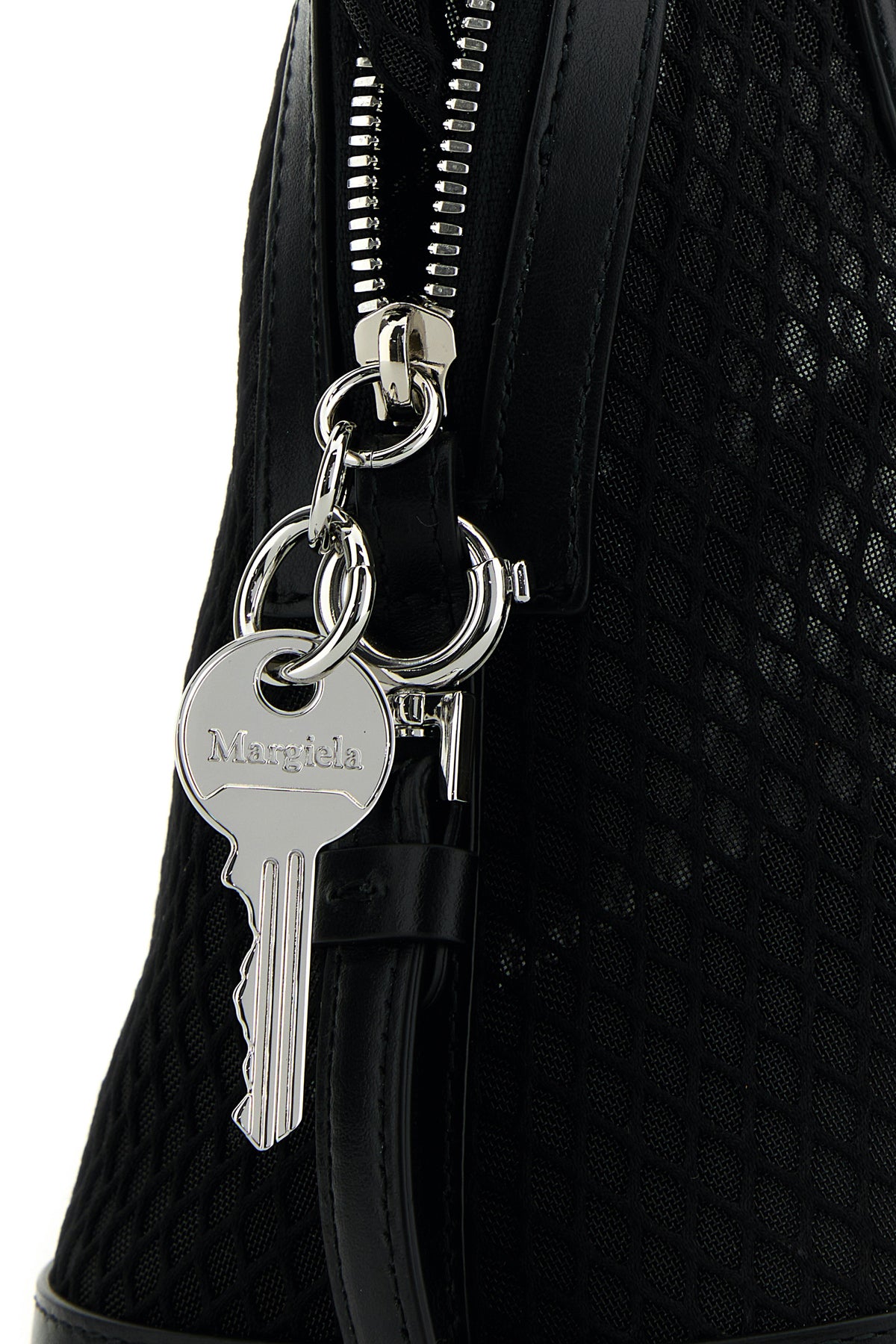 Handbag realized in mesh characterized by contrasting stitchings at the back enriched by contrasting logoed label at the front.
