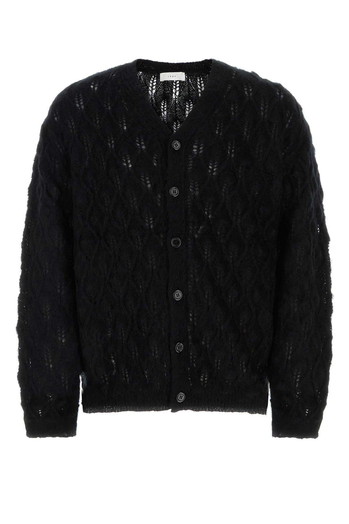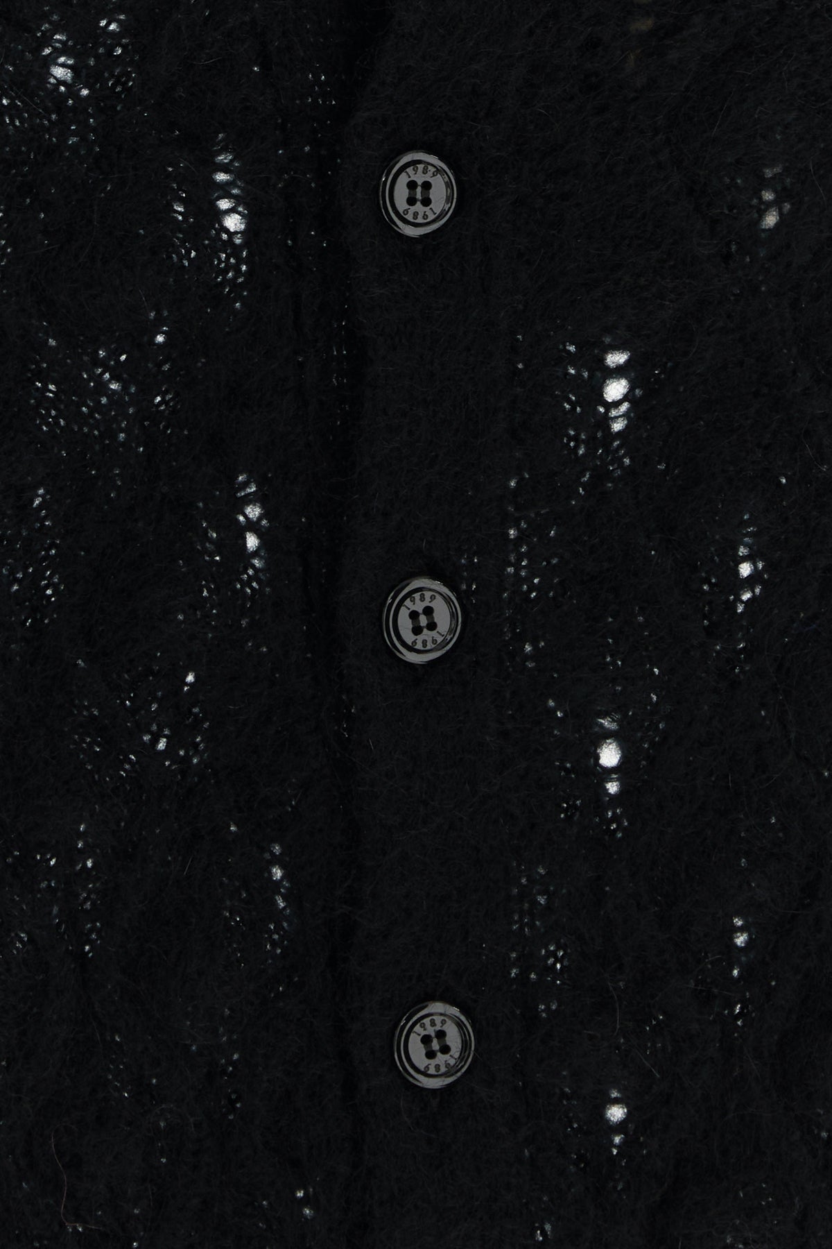Knitted cardigan realized in mohair blend characterized by deep V necklace.
