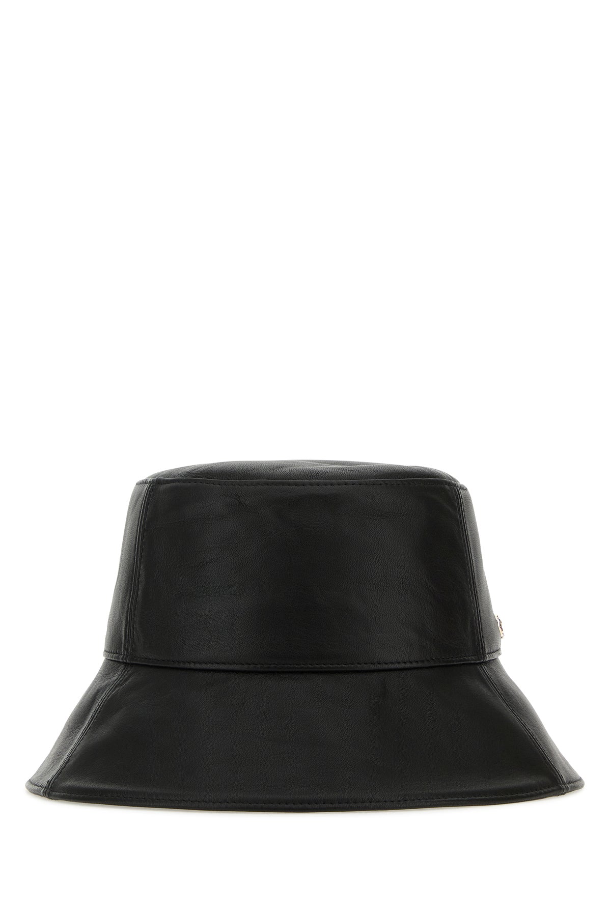 Bucket hat realized in slightly pebble nappa leather enriched by metal logoed detail at the front.