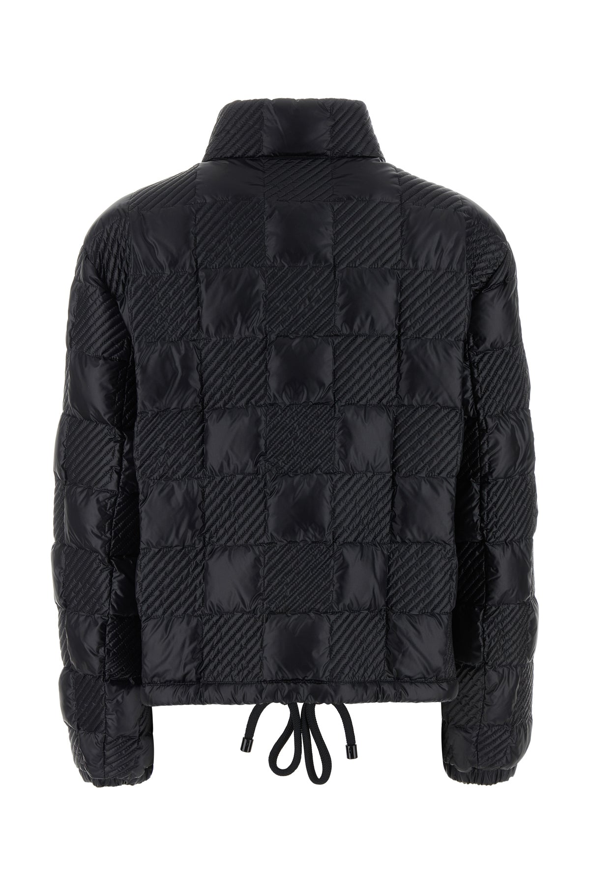 Down jacket realized in quilted nylon characterized by peculiar checkered embroidery on the entire surface enriched by contrasting logoed patch on the sleeve.