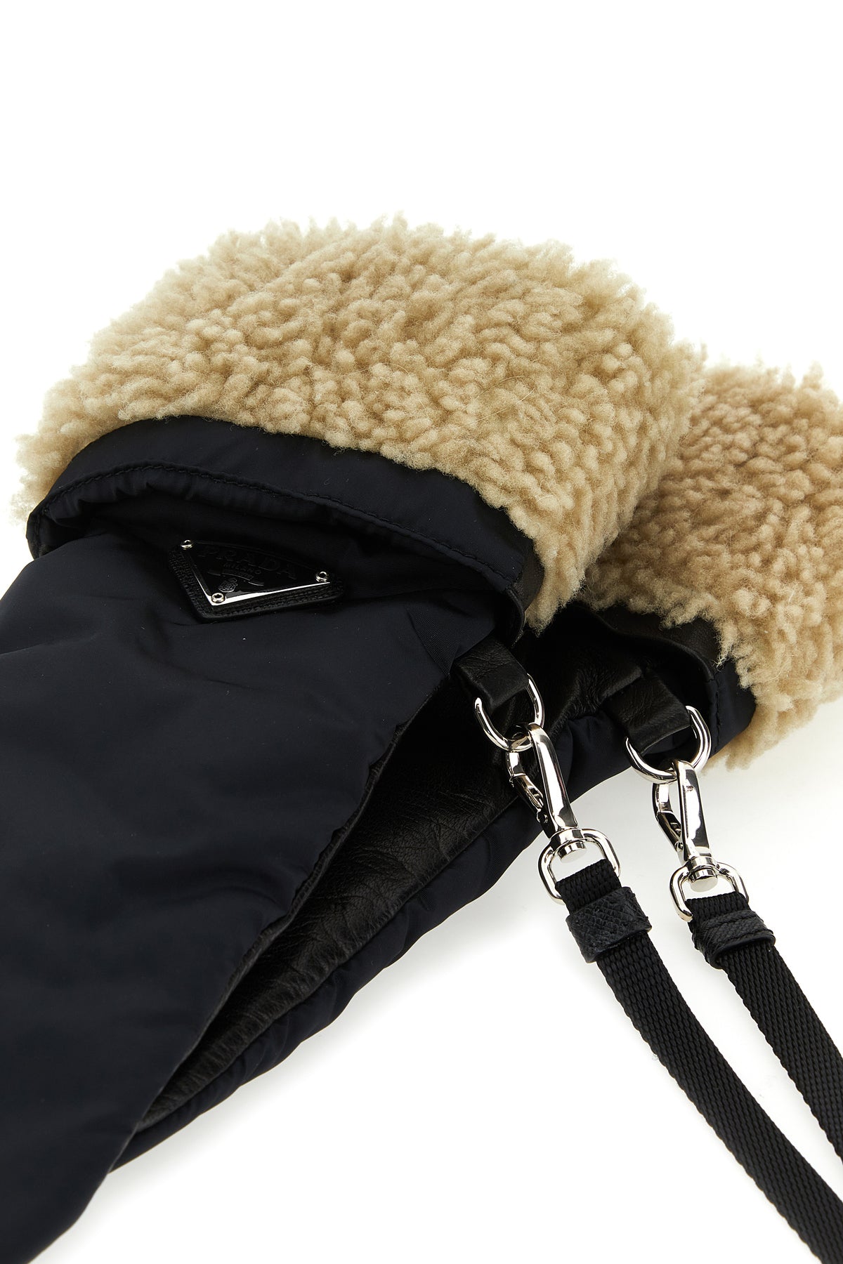 Gloves realized in nylon and nappa leather enriched by iconic logoed triangle at the front and shearling cuffs.