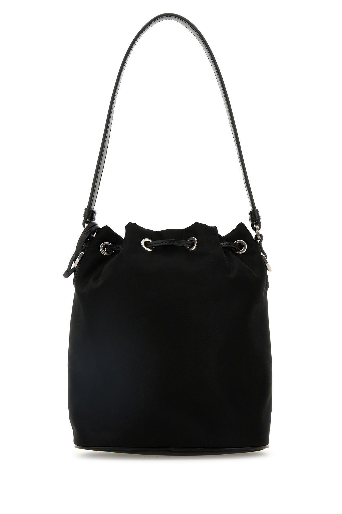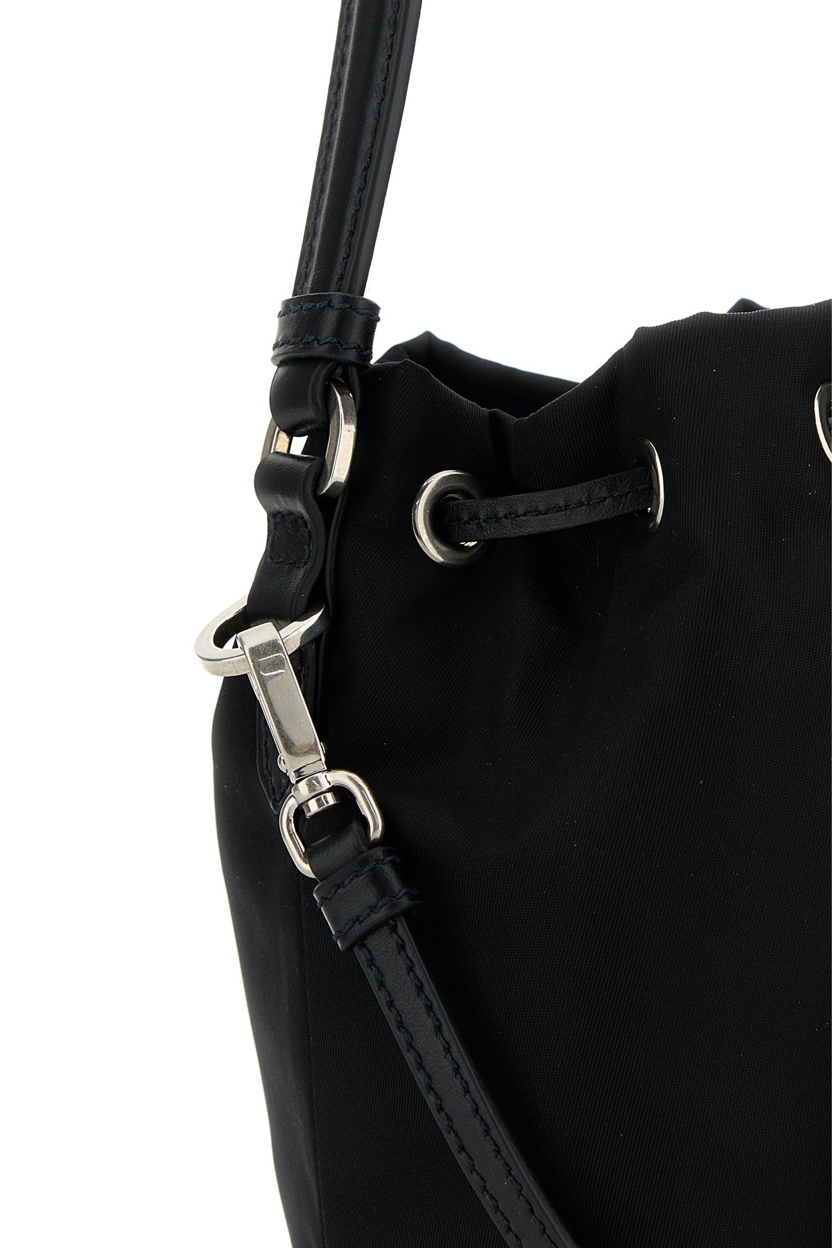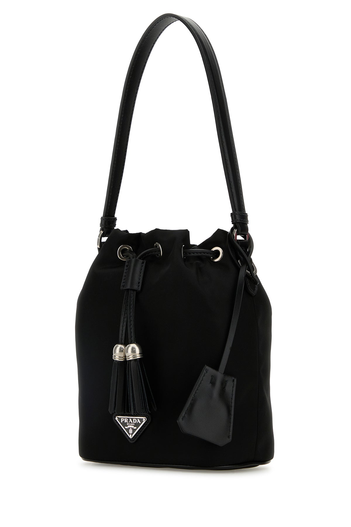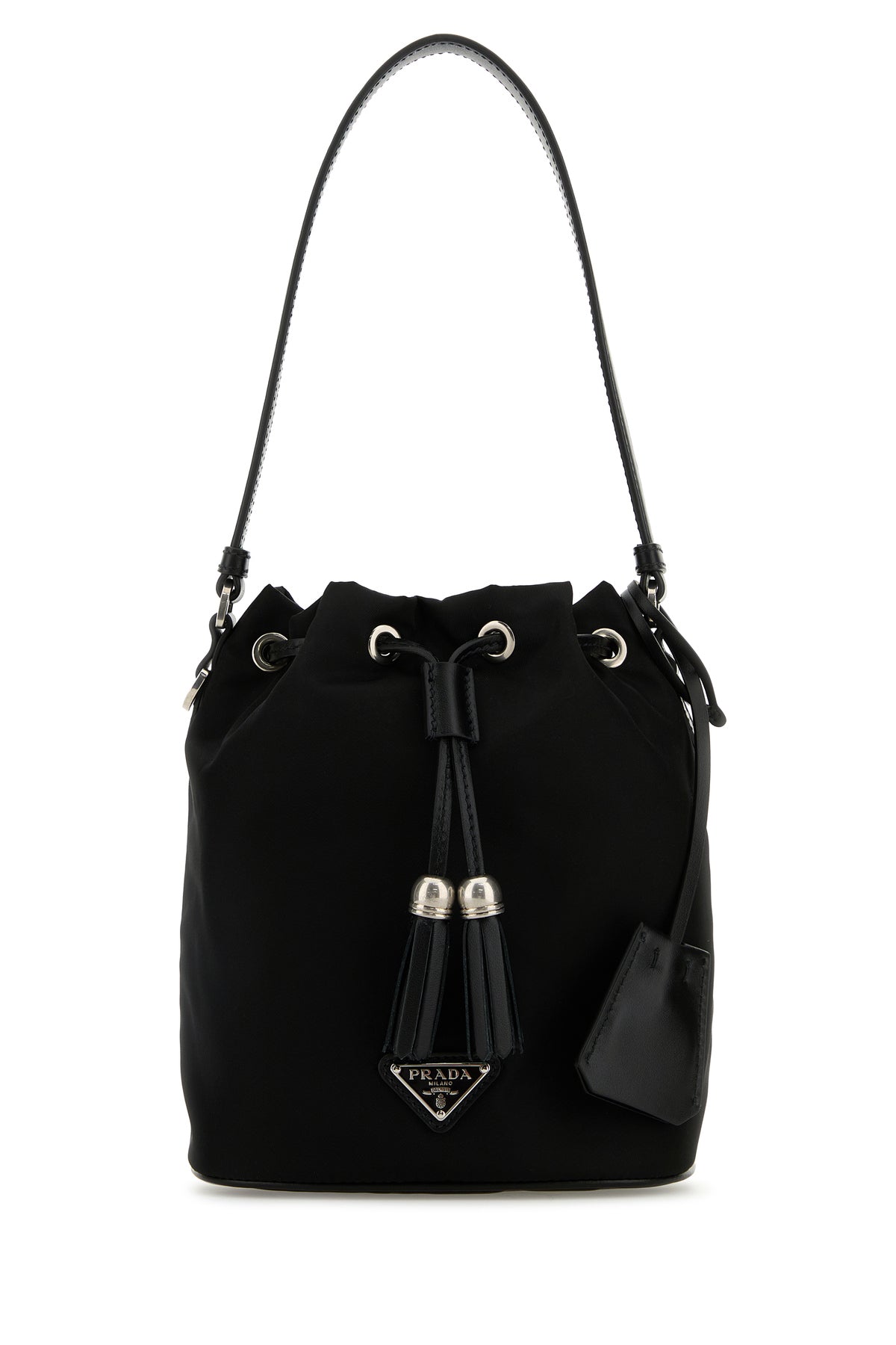 Bucket bag realized in nylon enriched by iconic metal logoed triangle at the front and detachable tonal leather keyring accessory.