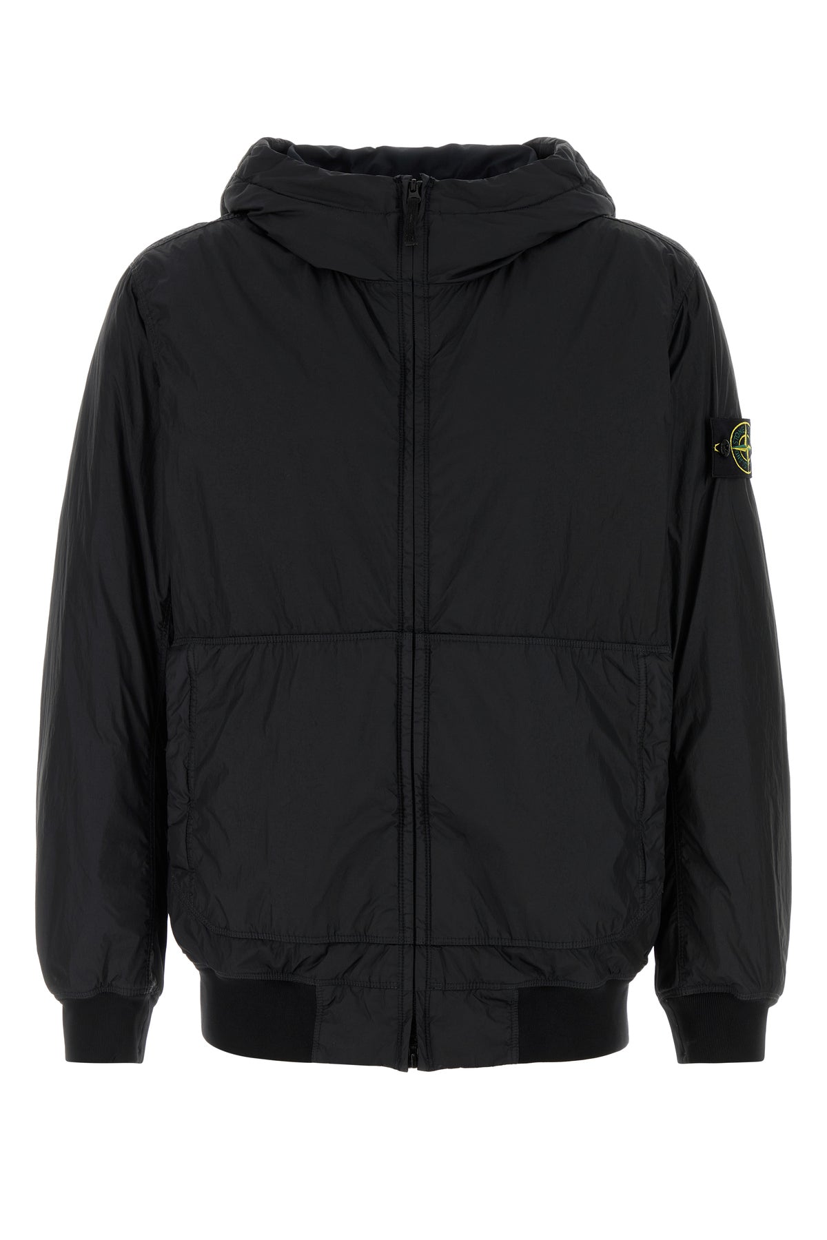 Padded bomber jacket realized in coated nylon enriched by detachable logoed label on the sleeve.
