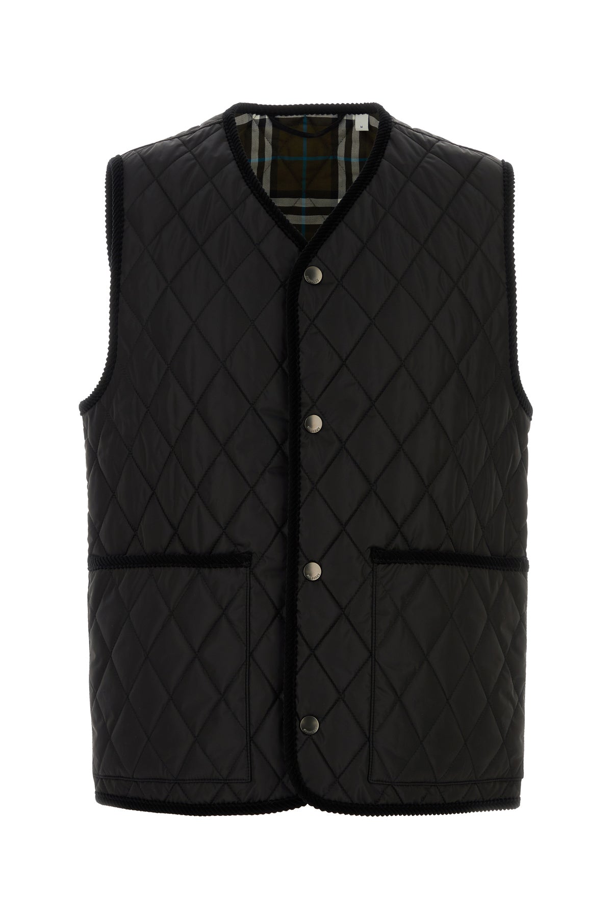 Sleeveless padded jacket realized in quilted nylon enriched by logoed label on the side.