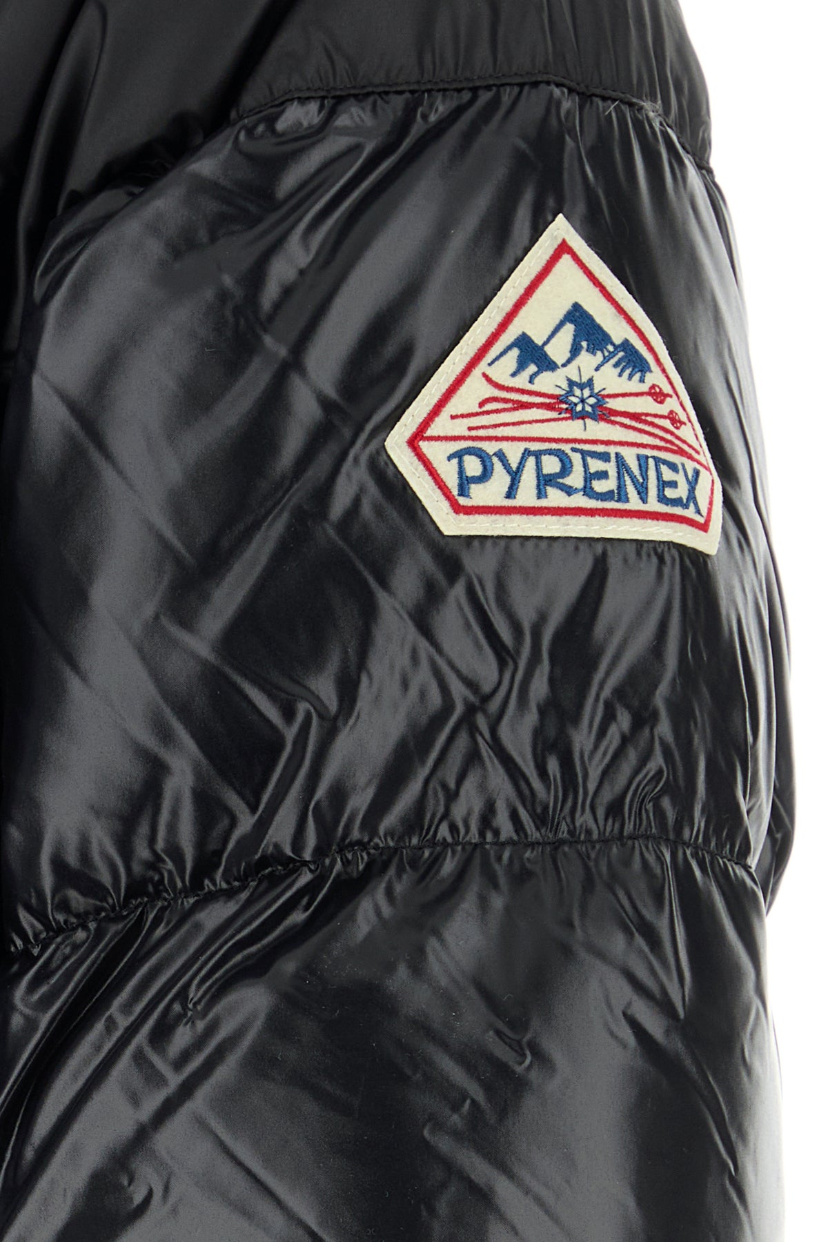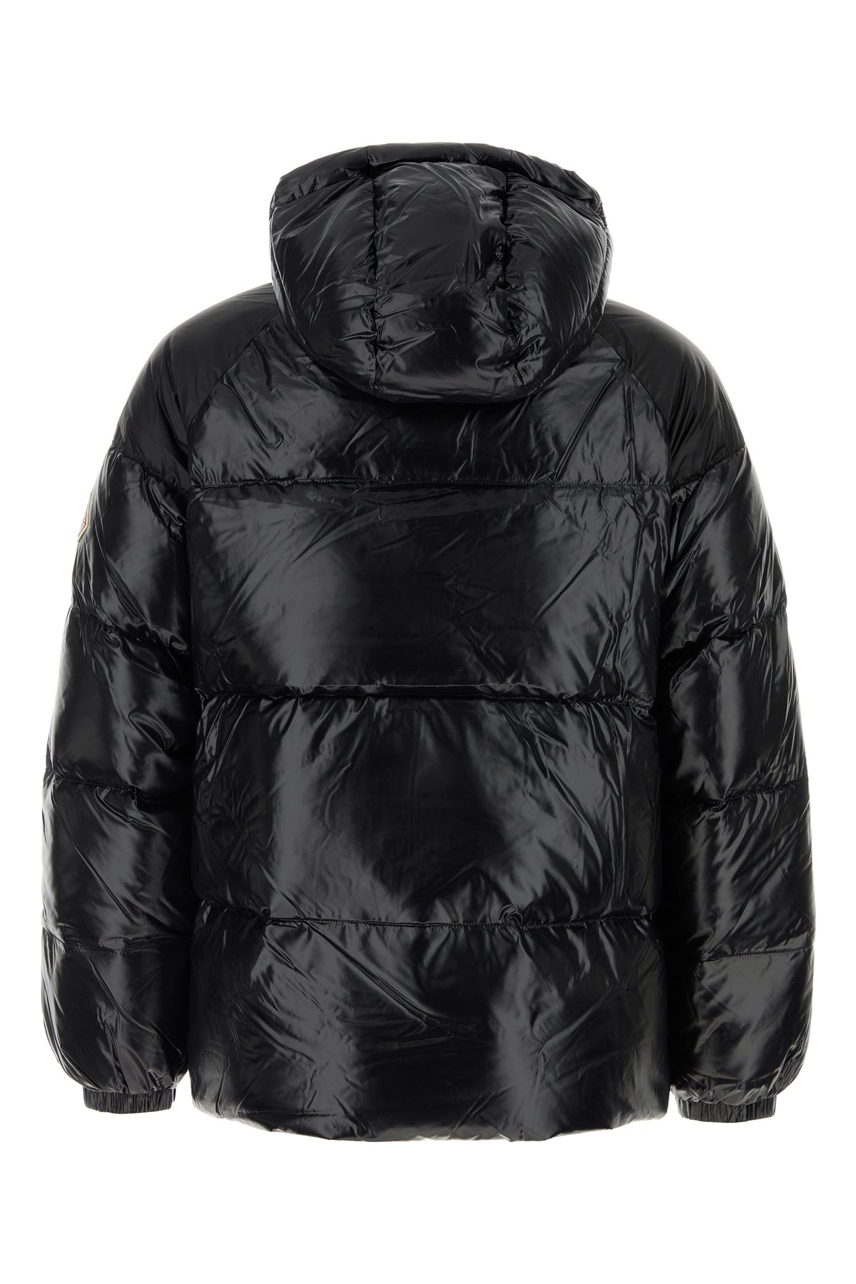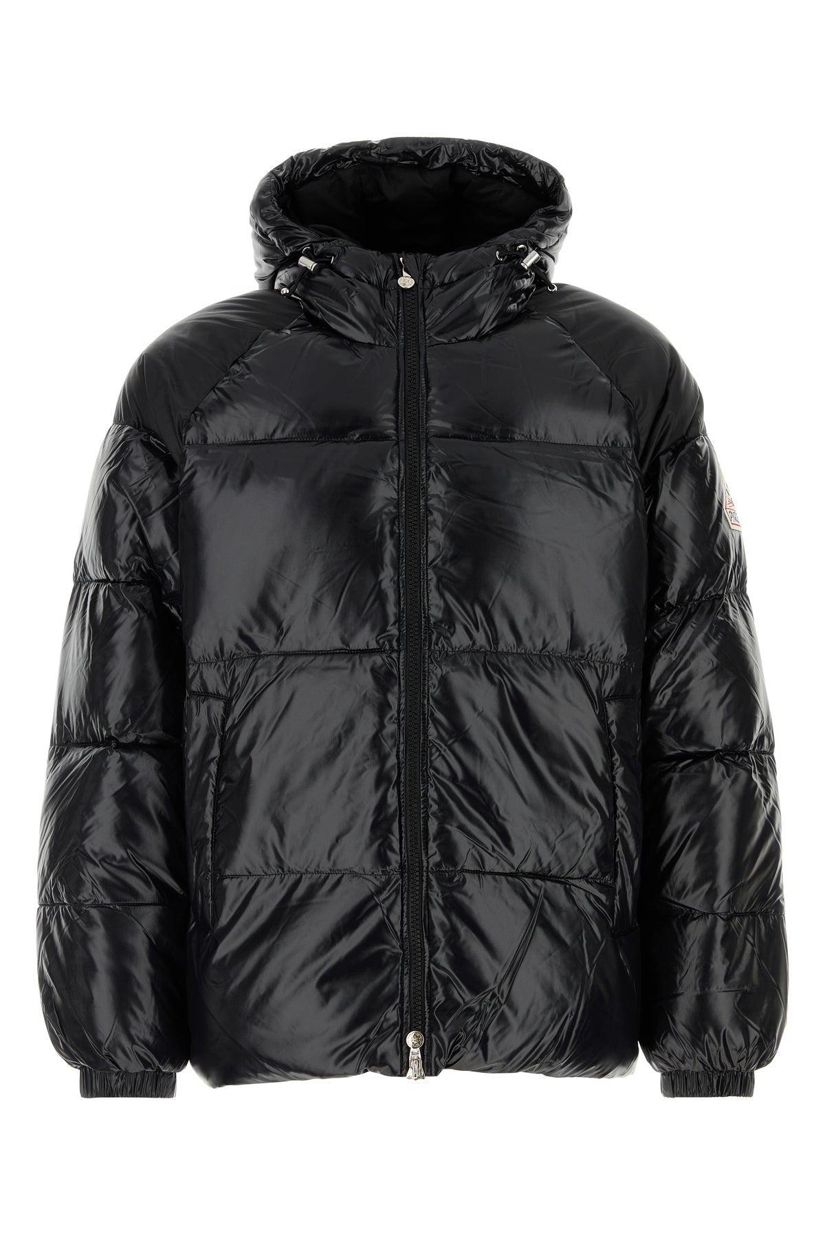 Down jacket realized in polished-finish quilted nylon enriched by contrasting logoed patch on the sleeve.