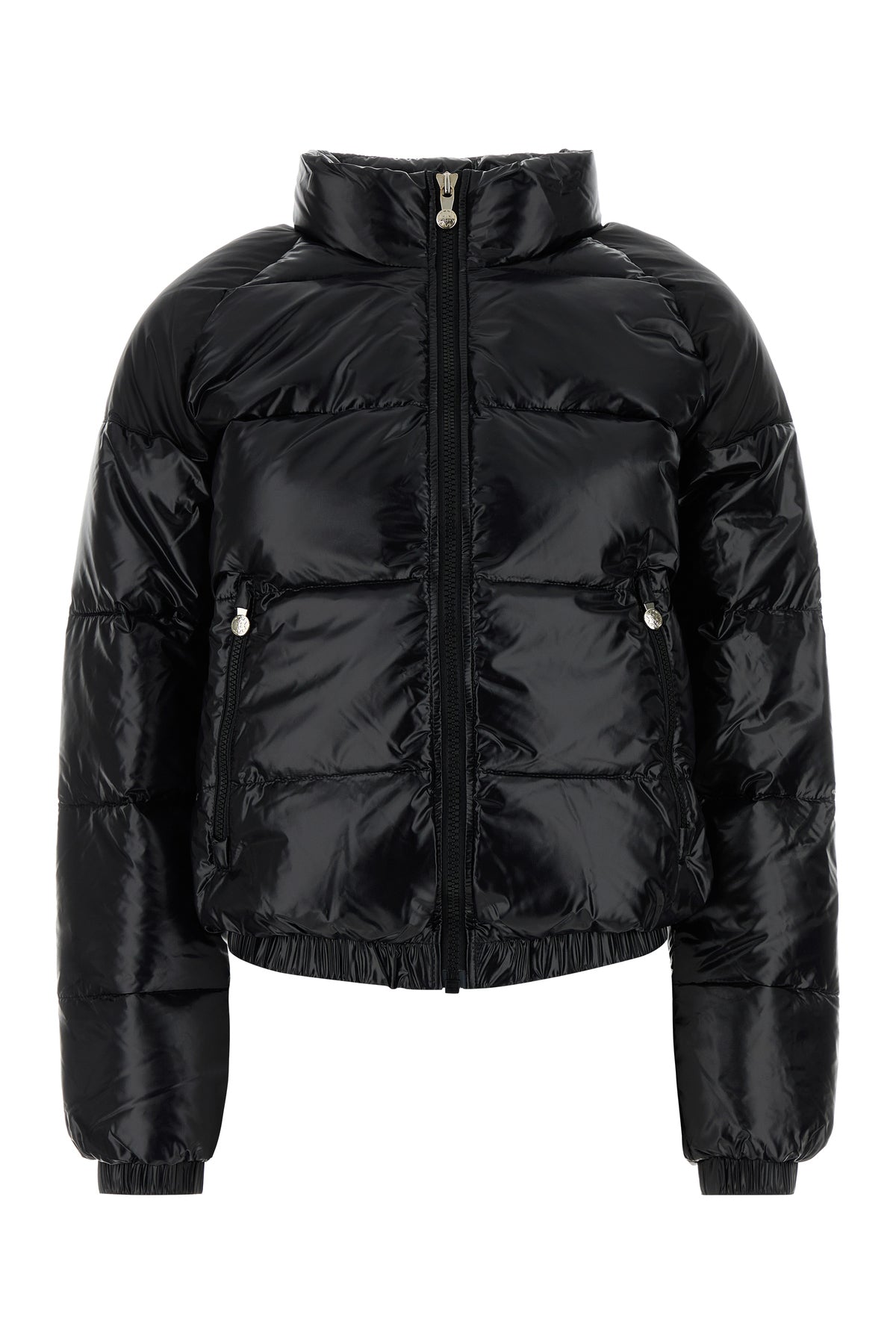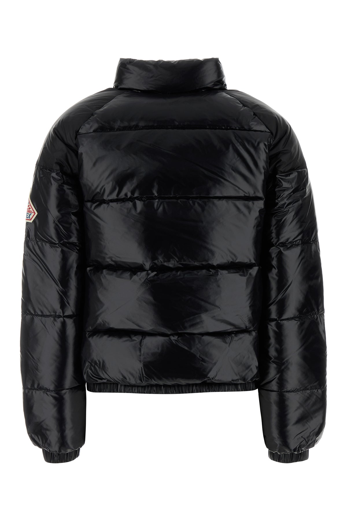 Down jacket realized in polished-finish nylon enriched by contrasting logoed patch on the sleeve.