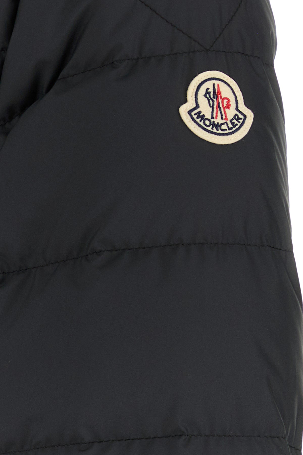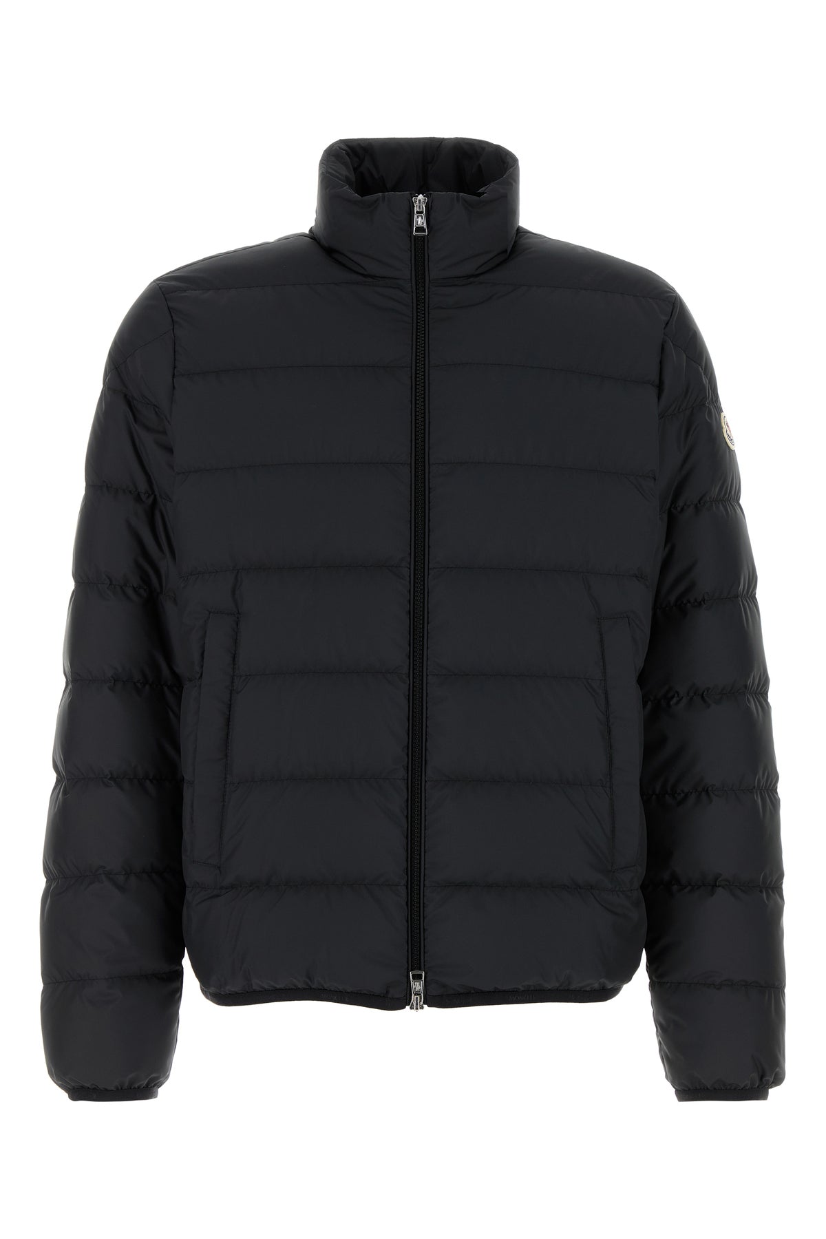 Down jacket realized in quilted polyester enriched by contrasting logoed patch on the sleeve.