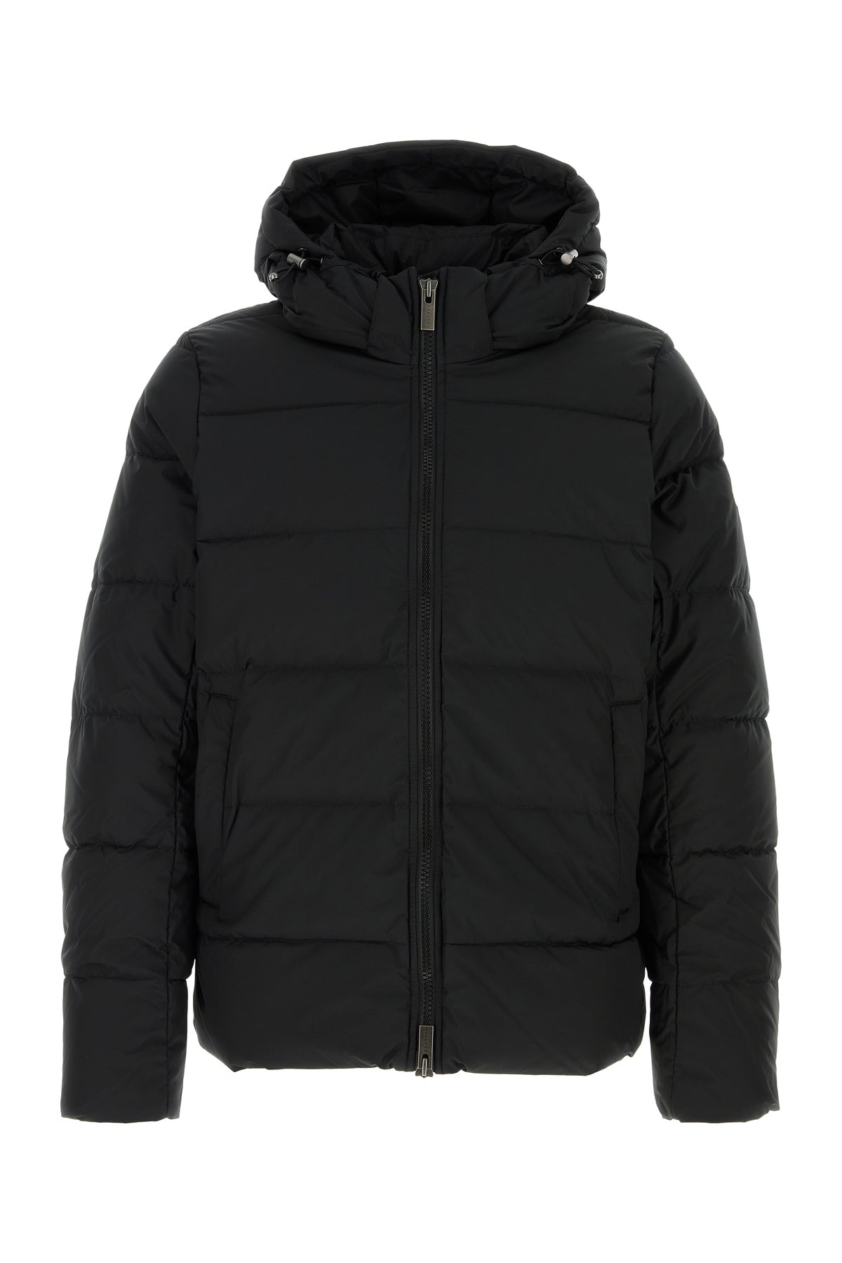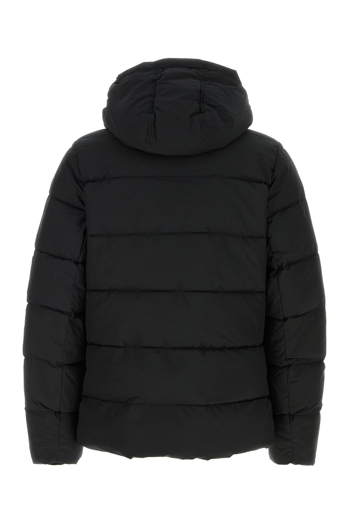 Down jacket realized in quilted polyester enriched by contrasting logoed patch on the sleeve.