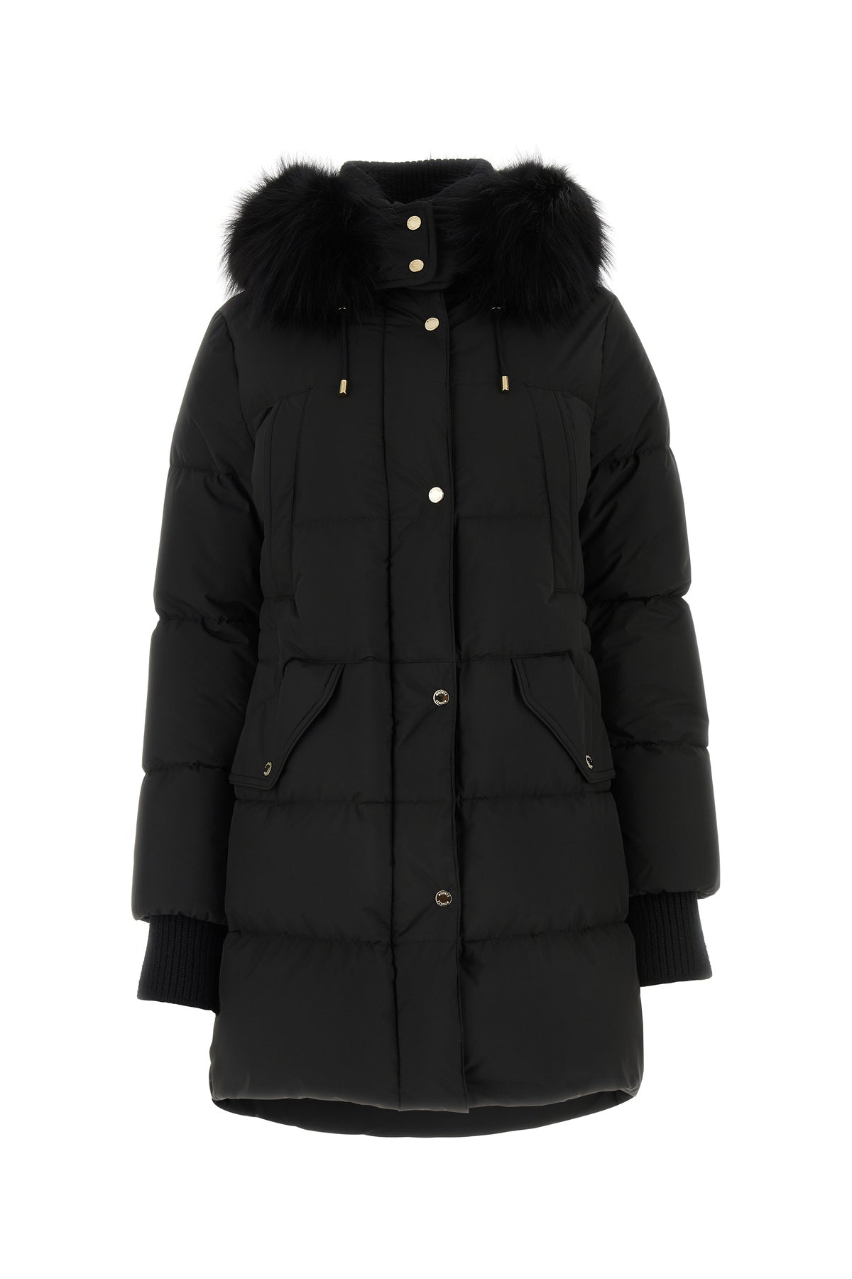 Down jacket realized in polyester enriched by detachable drawstring hood and detachable fur insert.