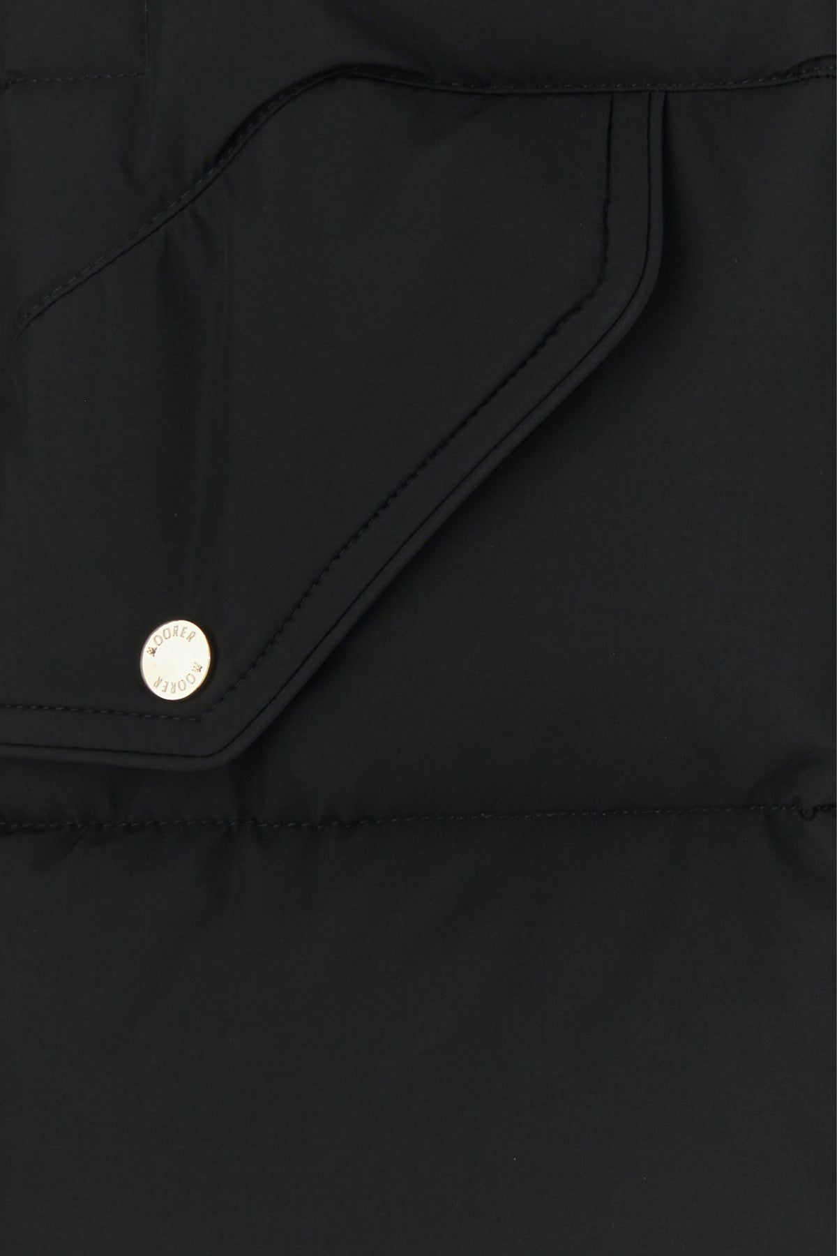 - Concealed zip closure and visible snap buttons at the front