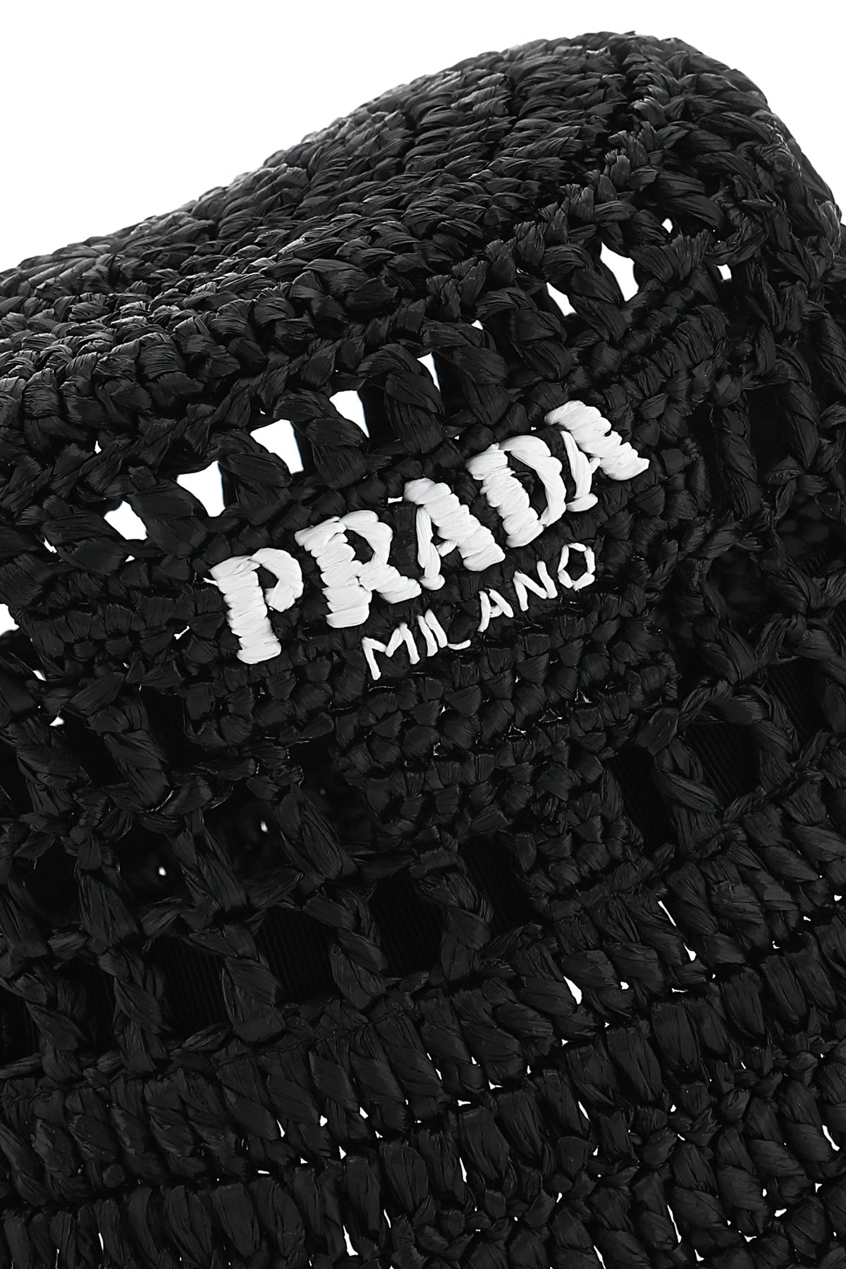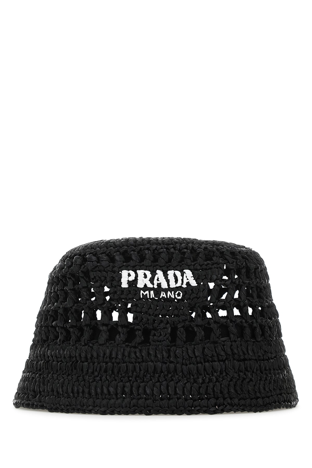 Bucket hat realized in rafia characterized by contrasting printed logo at the front.
