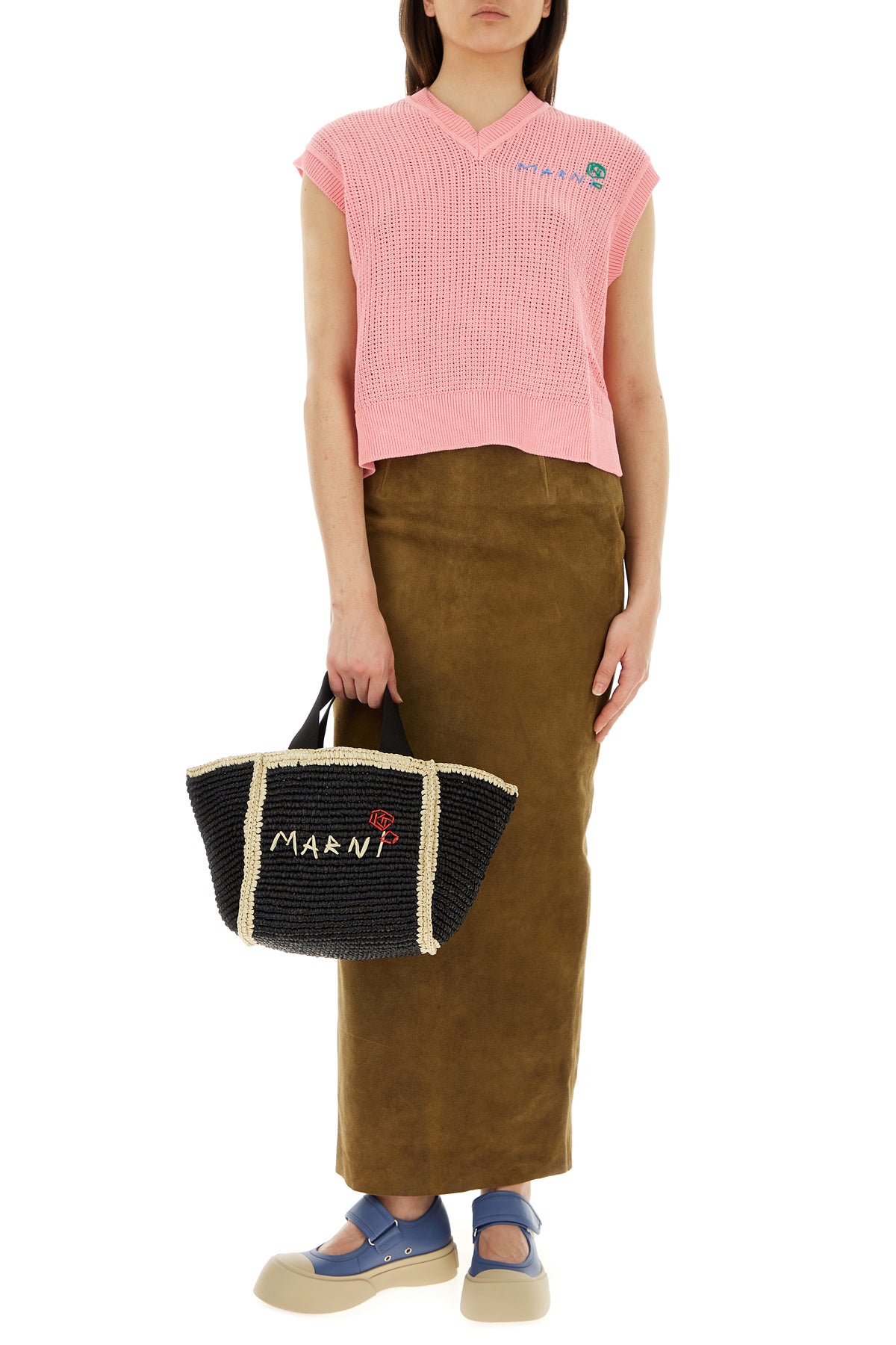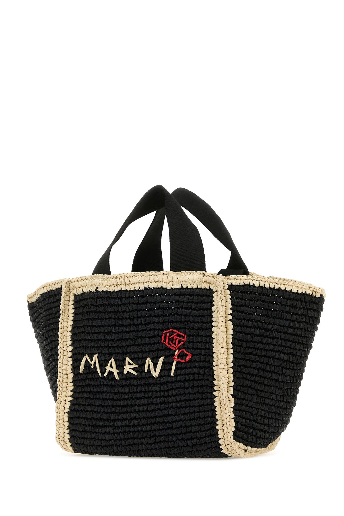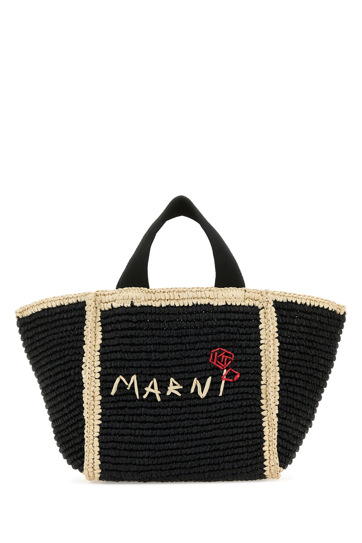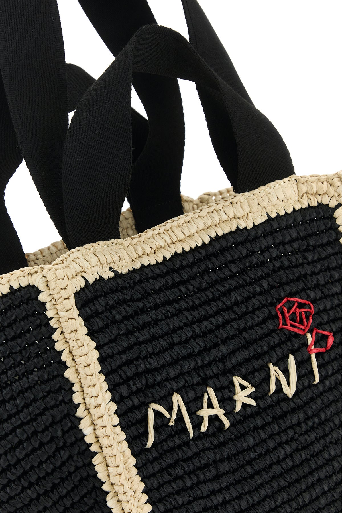 Shopping bag realized in woven raffia with contrasting trimmings characterized by contrasting logoed embroidery at the front.