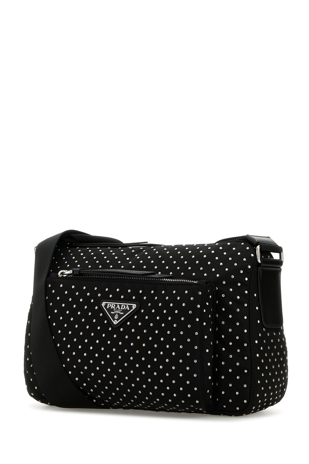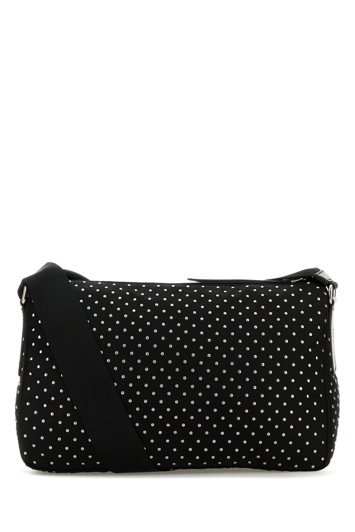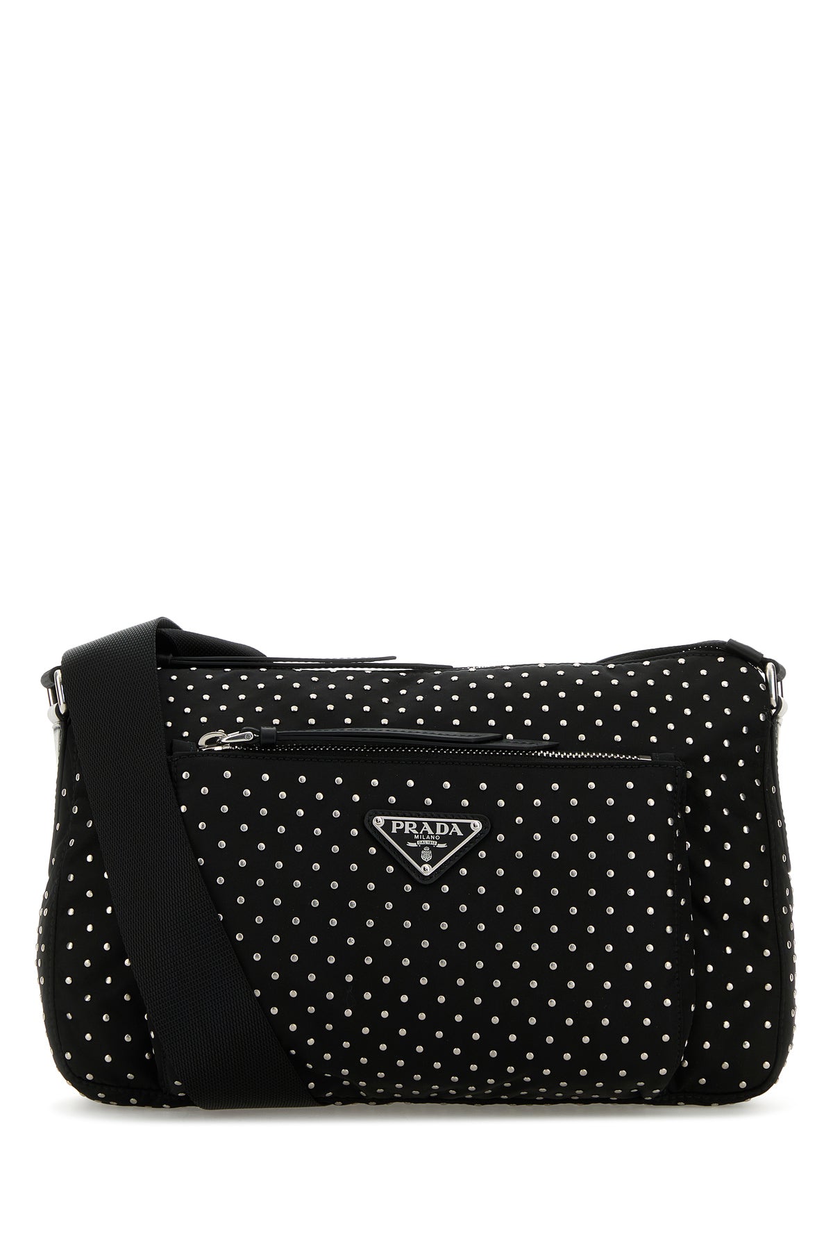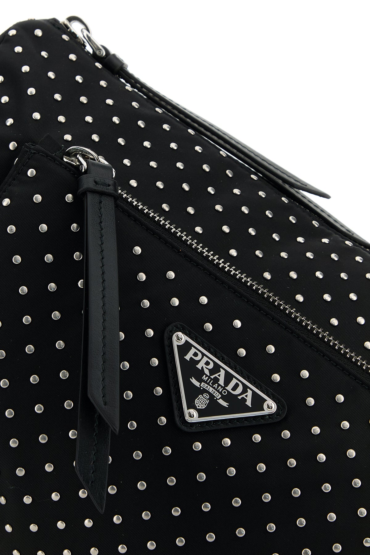 Crossbody bag realized in Re-Nylon enriched by metal studs on the entire surface and iconic logoed metal triangle at the front.