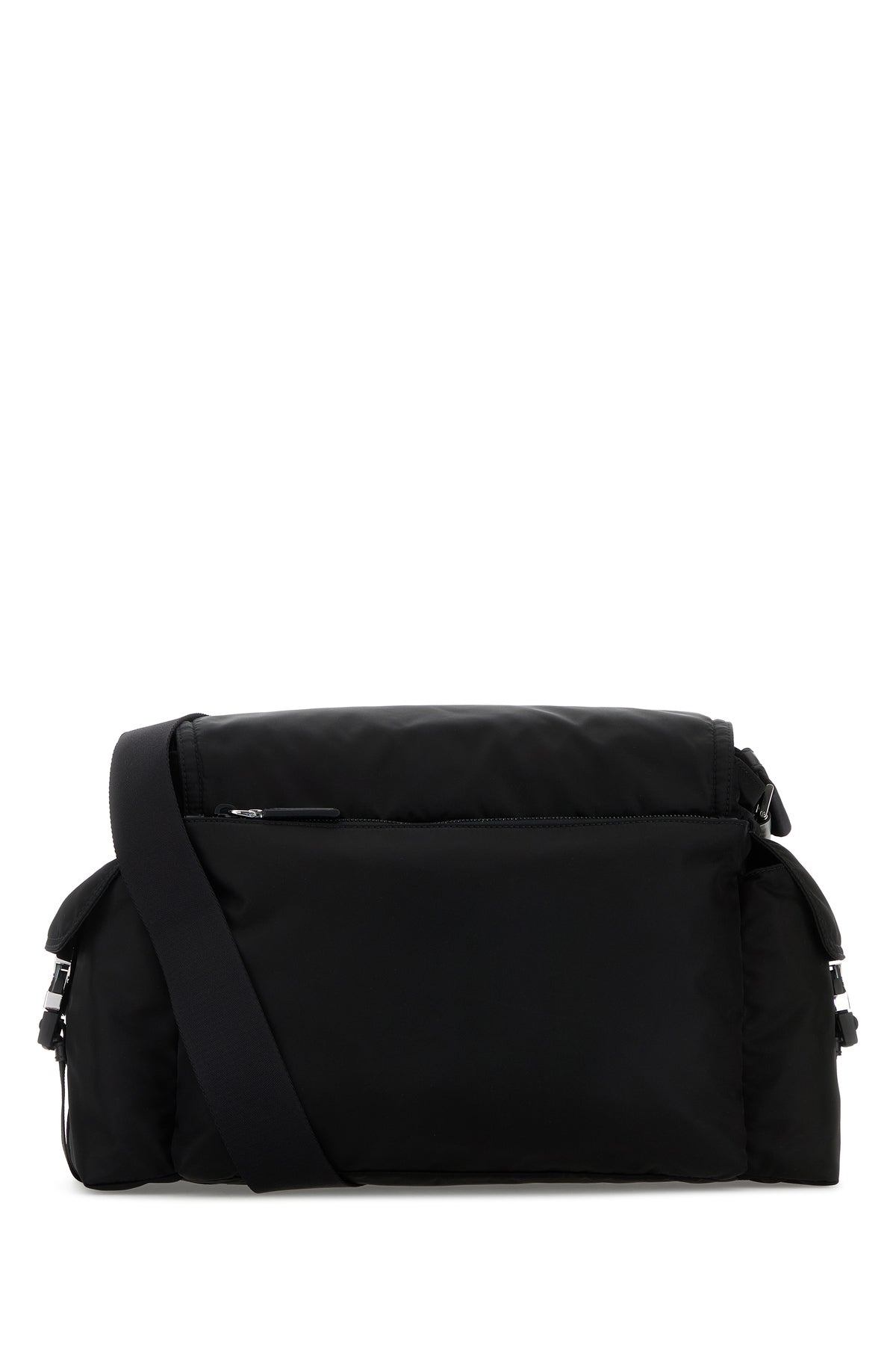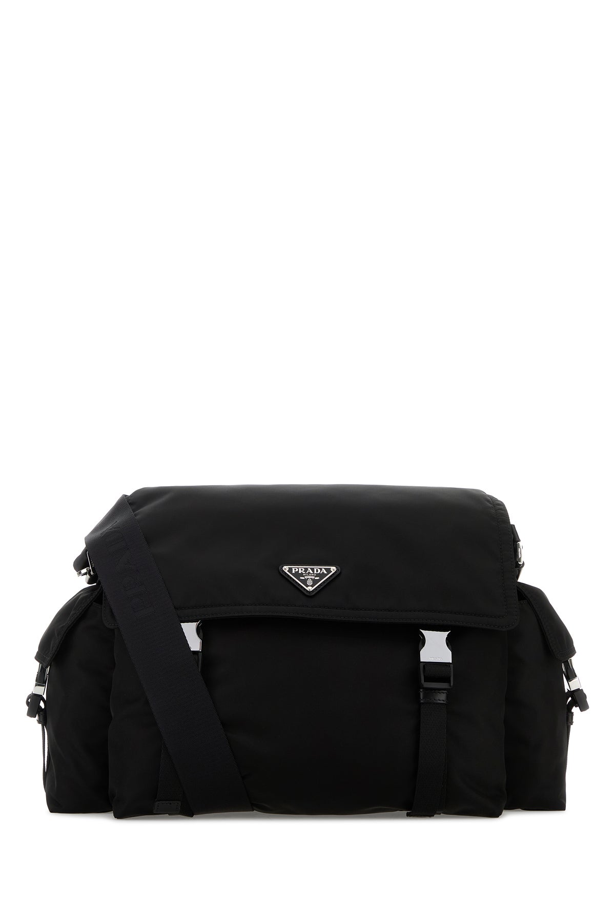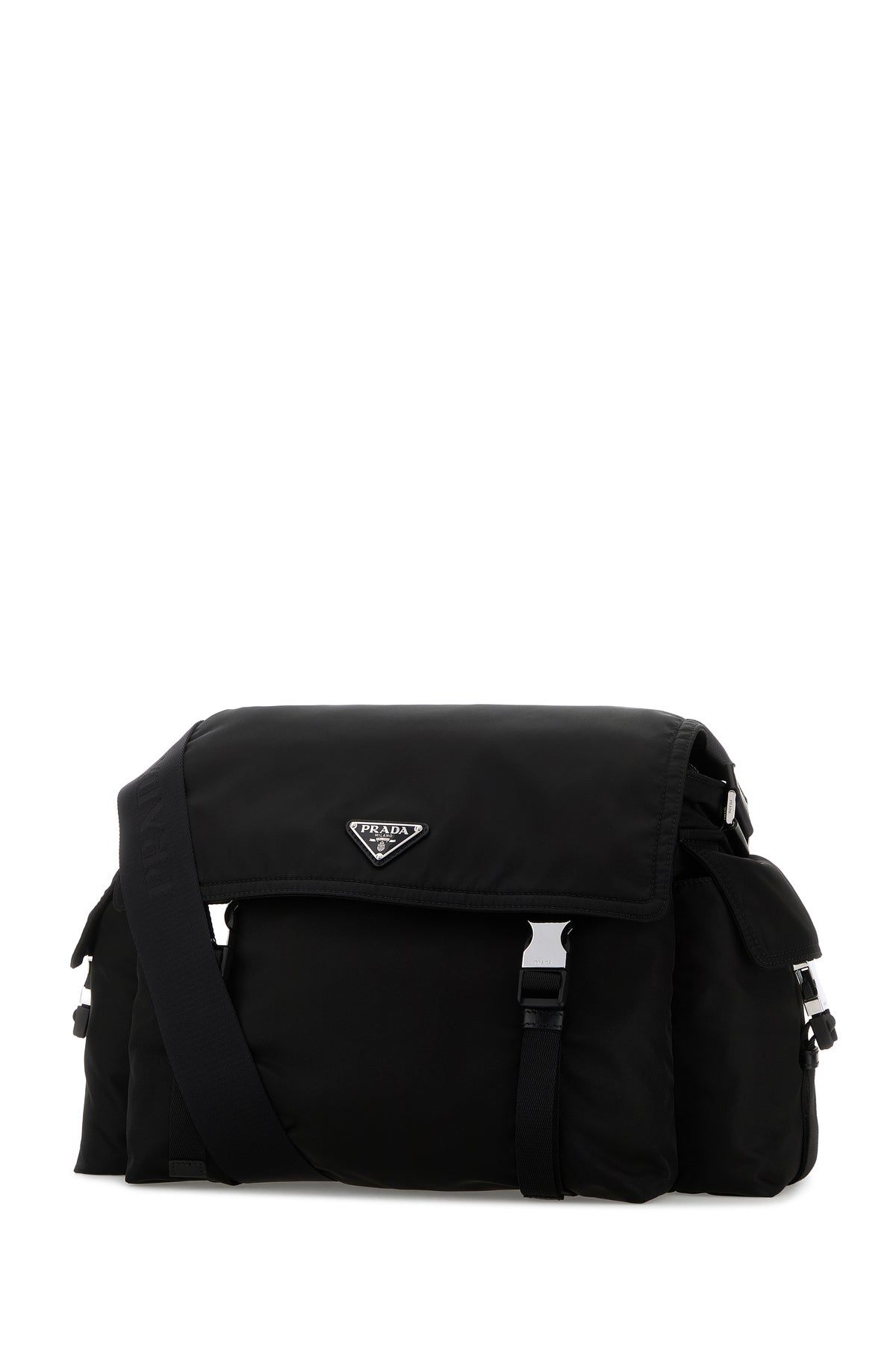 Shoulder bag realized in Re-Nylon enriched by iconic logoed metal triangle at the front.